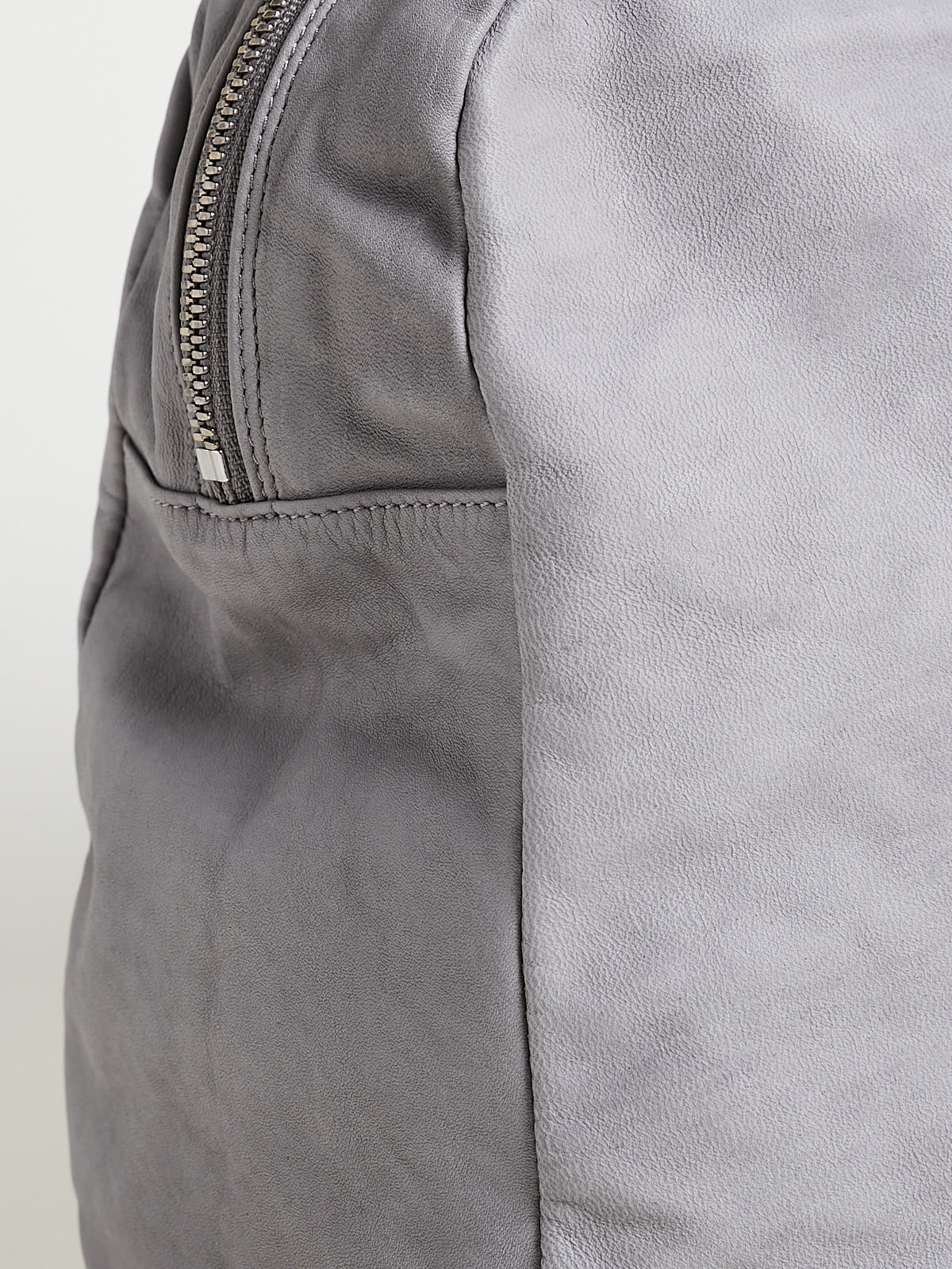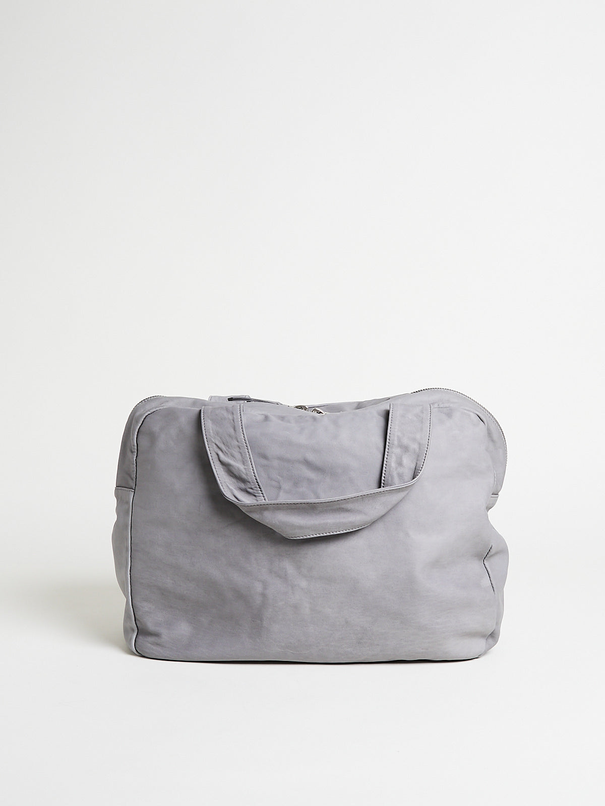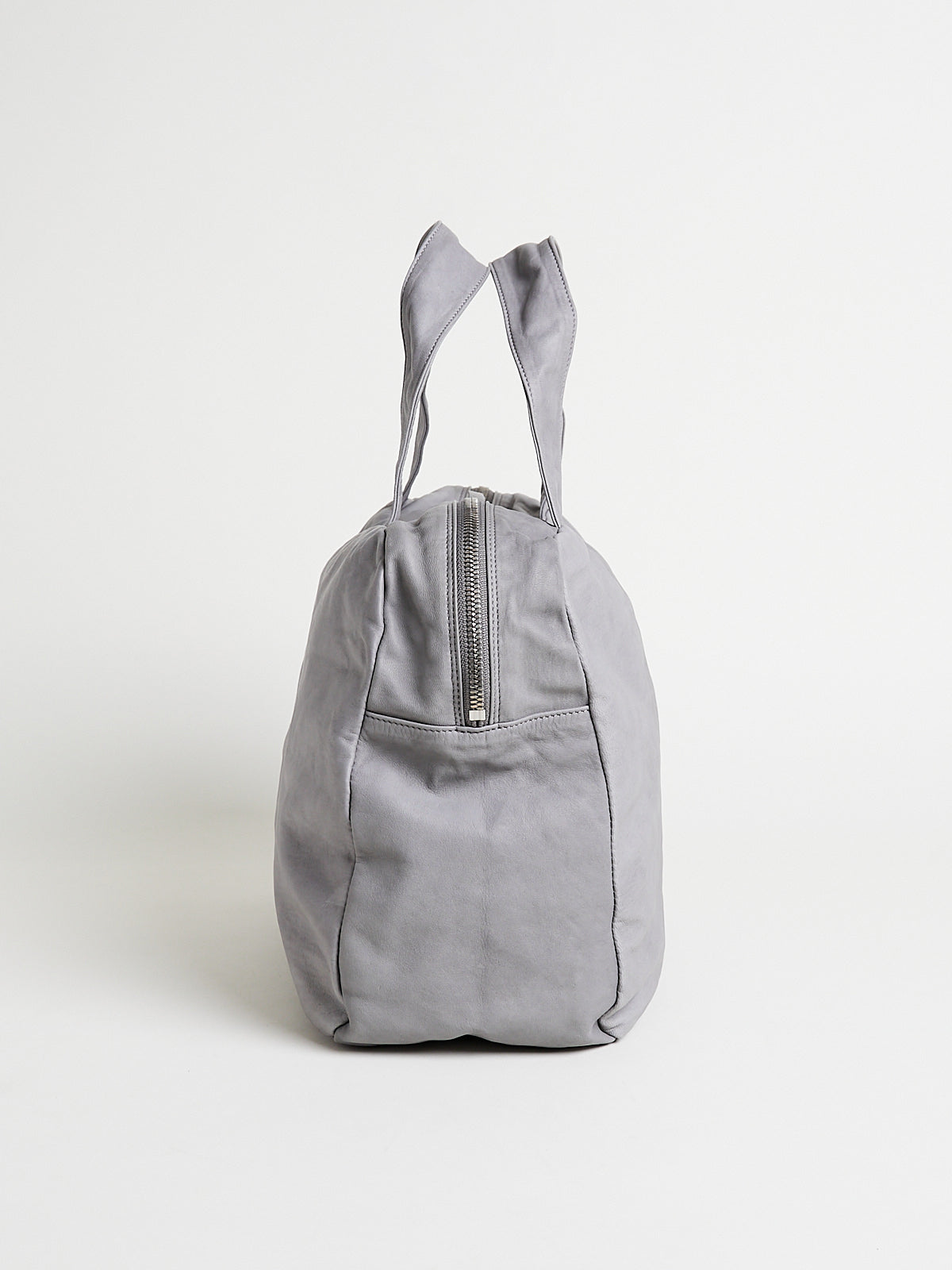 Square tote bag with two handles in a washed smooth grey horse leather. Double zip fastening and one main compartment with an internal slip pocket. Fully lined in ecru cotton/linen.