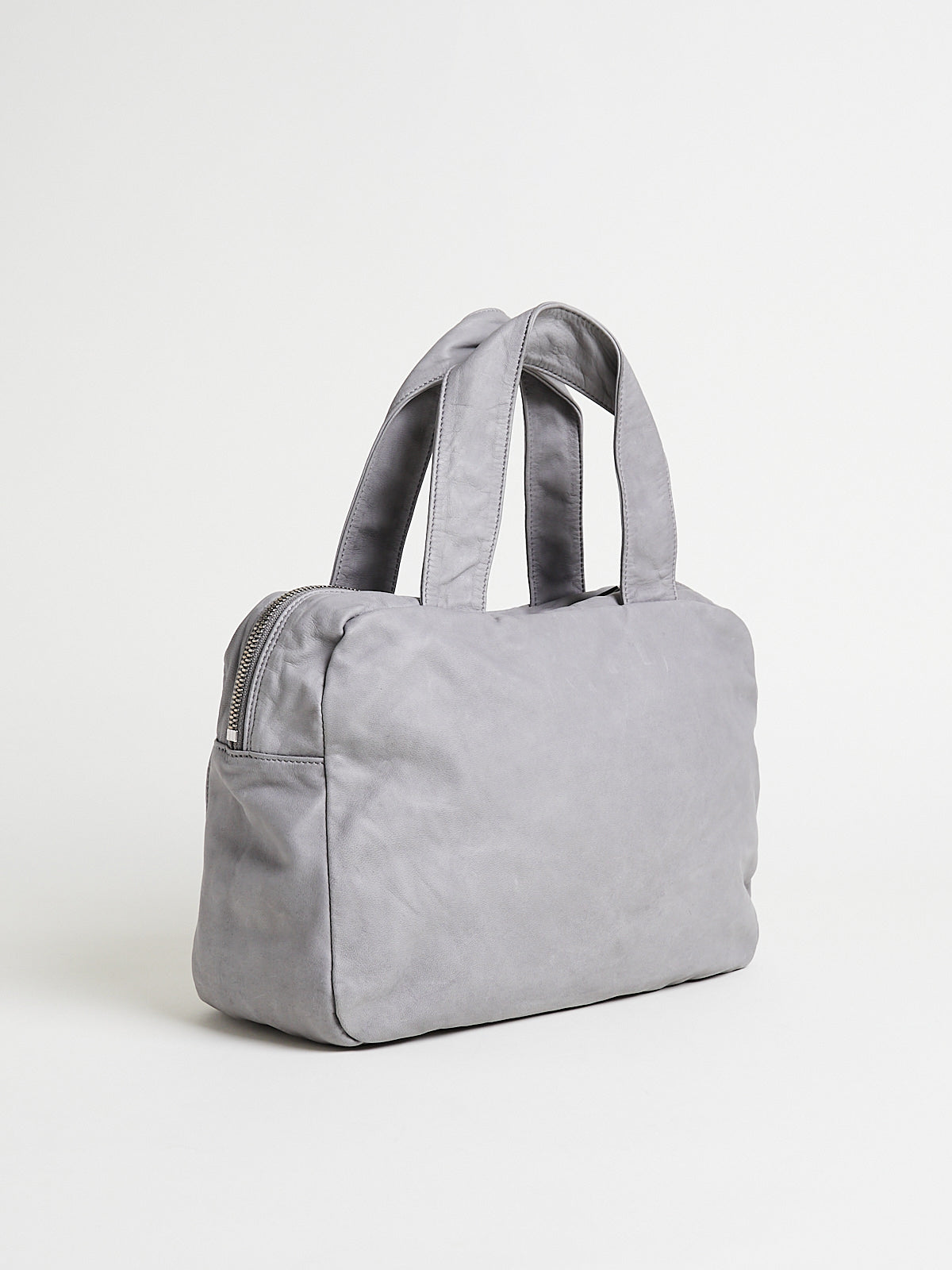Square tote bag with two handles in smooth grey horse leather. Double zip fastening and one main compartment with an internal slip pocket. Fully lined in ecru cotton/linen.
