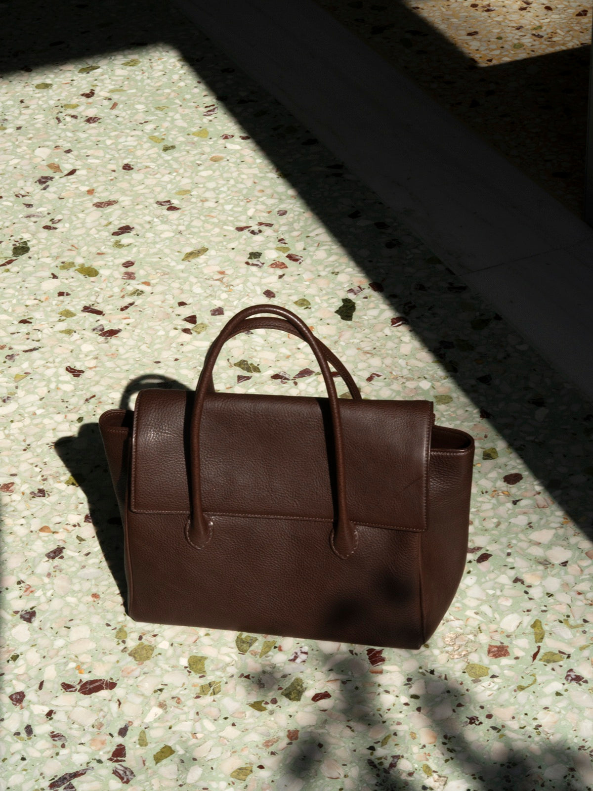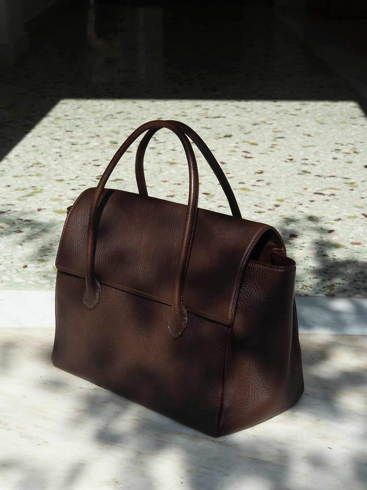Tote bag with flap in dark brown box calf Vachetta leather. Two handles, internal slip pocket with a divider on the front and a pocket with a zip fastening on the back. Can hold an A4-size folder. Lined in leather.