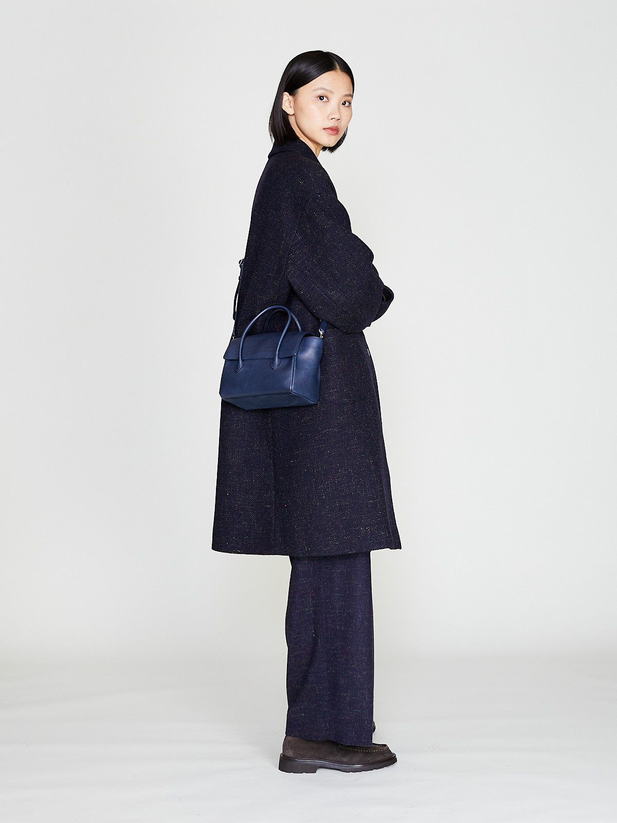 Small tote bag with a flap in navy Vachetta cow leather. Two handles, one large compartment and two internal pockets on the front. The flap can be tucked inside. Lined in leather. Removable shoulder strap.
