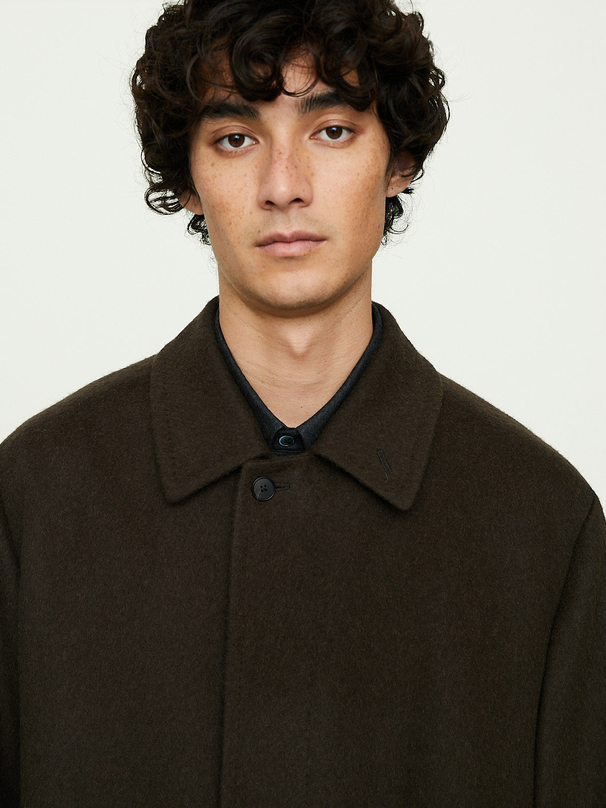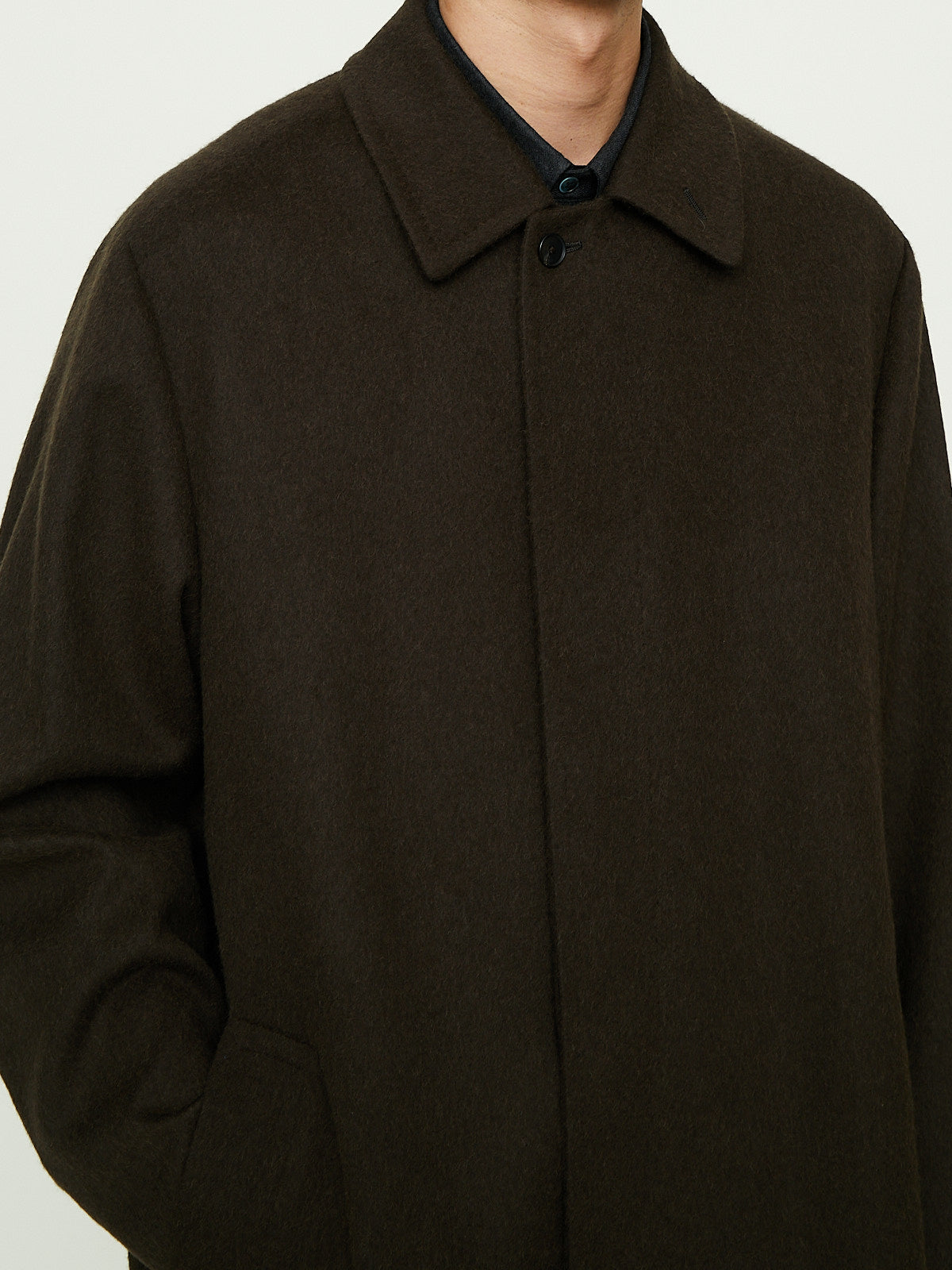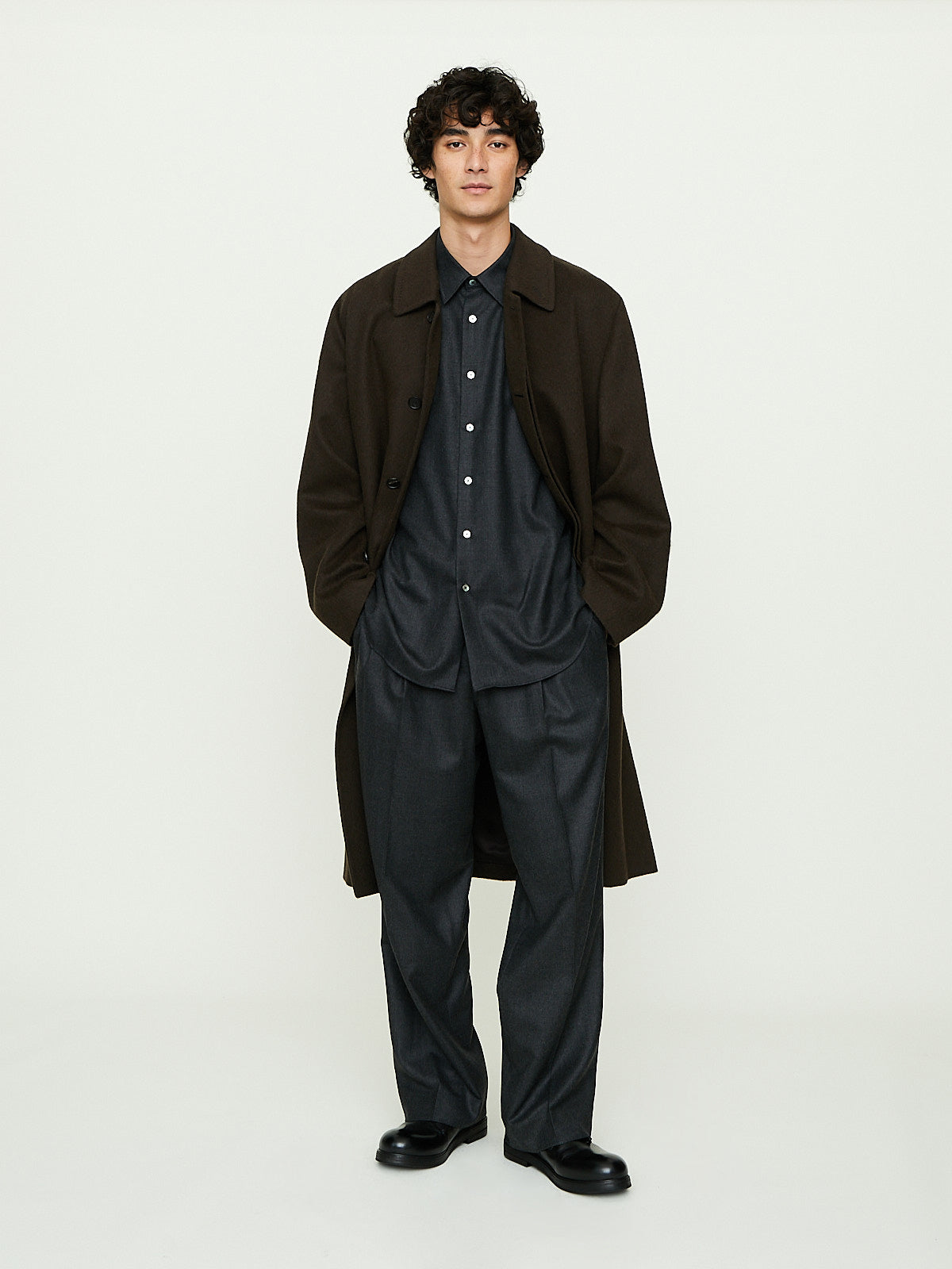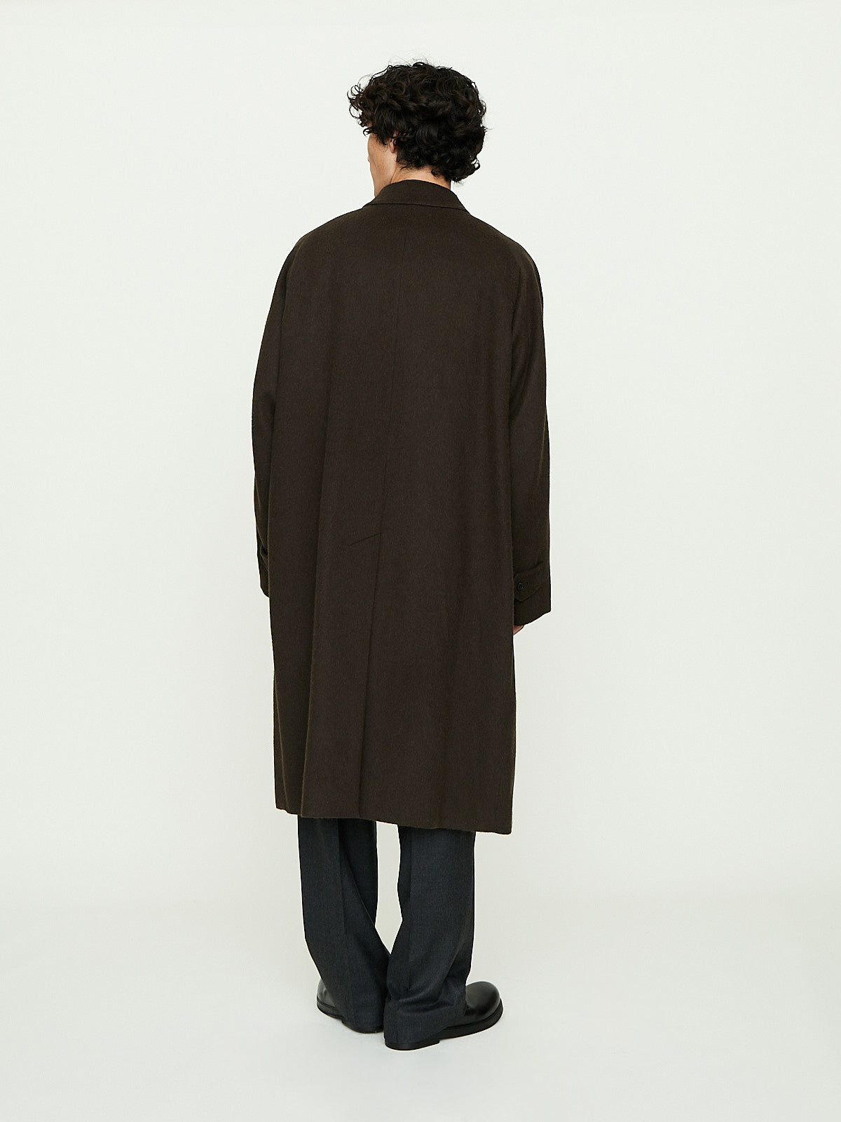 Relaxed coat in dark brown Mongolian baby camel flannel that has a soft, velvety texture. Spread collar, concealed front button fastening and long sleeves with a saddle shoulder and belted cuffs. Welted slip pockets on the front and a vent at the back. Fully lined.