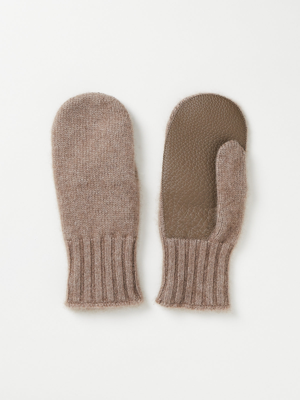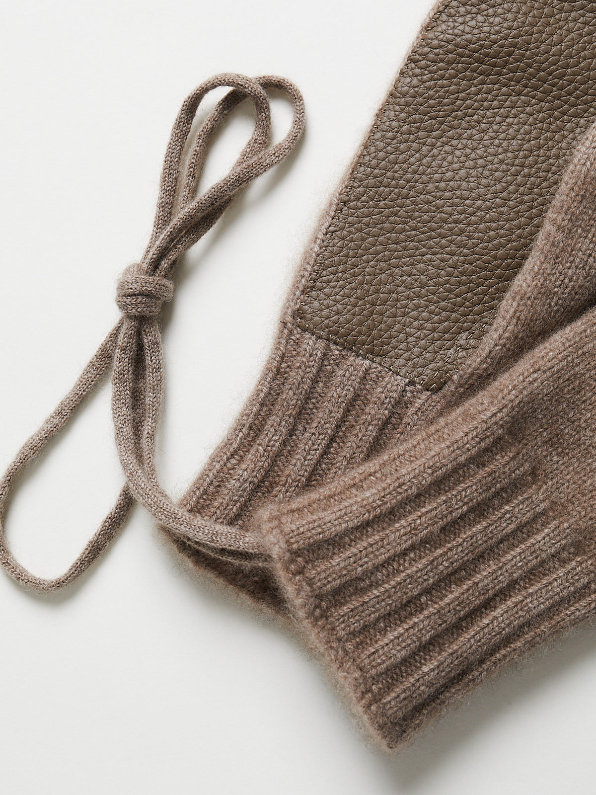 Men's mittens in uncoloured natural brown rare baby cashmere, sourced from Mongolia. Only a limited quantity of this precious fibres exists in the world, making it an exceptionally rare. The natural softness, silky smoothness, and beautiful sheen of the fibre are qualities that cannot be replicated through processing ― these are inherent characteristics of the raw material itself. Features a leather patch on the palm and a ribbed cuff.
