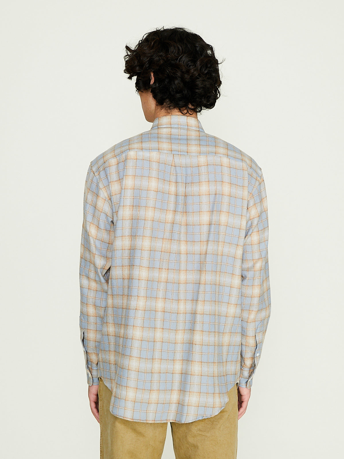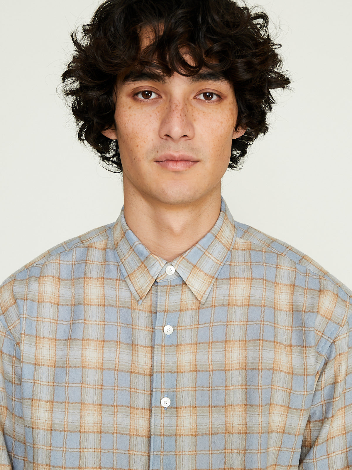 Classic shirt made from checked light blue and beige ultra-fine combed wool, spun into soft, yarns using a special technique to create its light, fluffy texture. Classic collar, front button fastening and long sleeves with buttoned cuffs. Features a back yoke with a box pleat and a curved hemline. Relaxed fit.