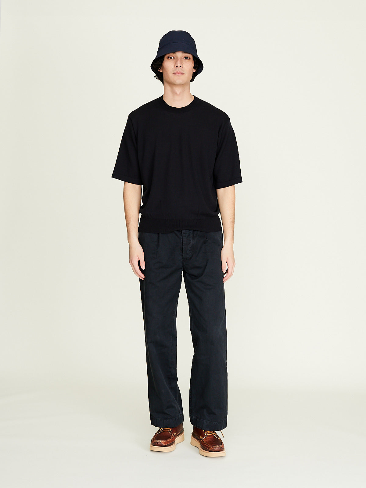 Men's bucket hat in garment-dyed lightweight navy chino cloth using Finx cotton, an extra-long staple cotton grown in Egypt. This fabric is brushed for a peach like finish to enhance the cotton’s natural texture and gentle drape. Features stitching detailing on the brim.