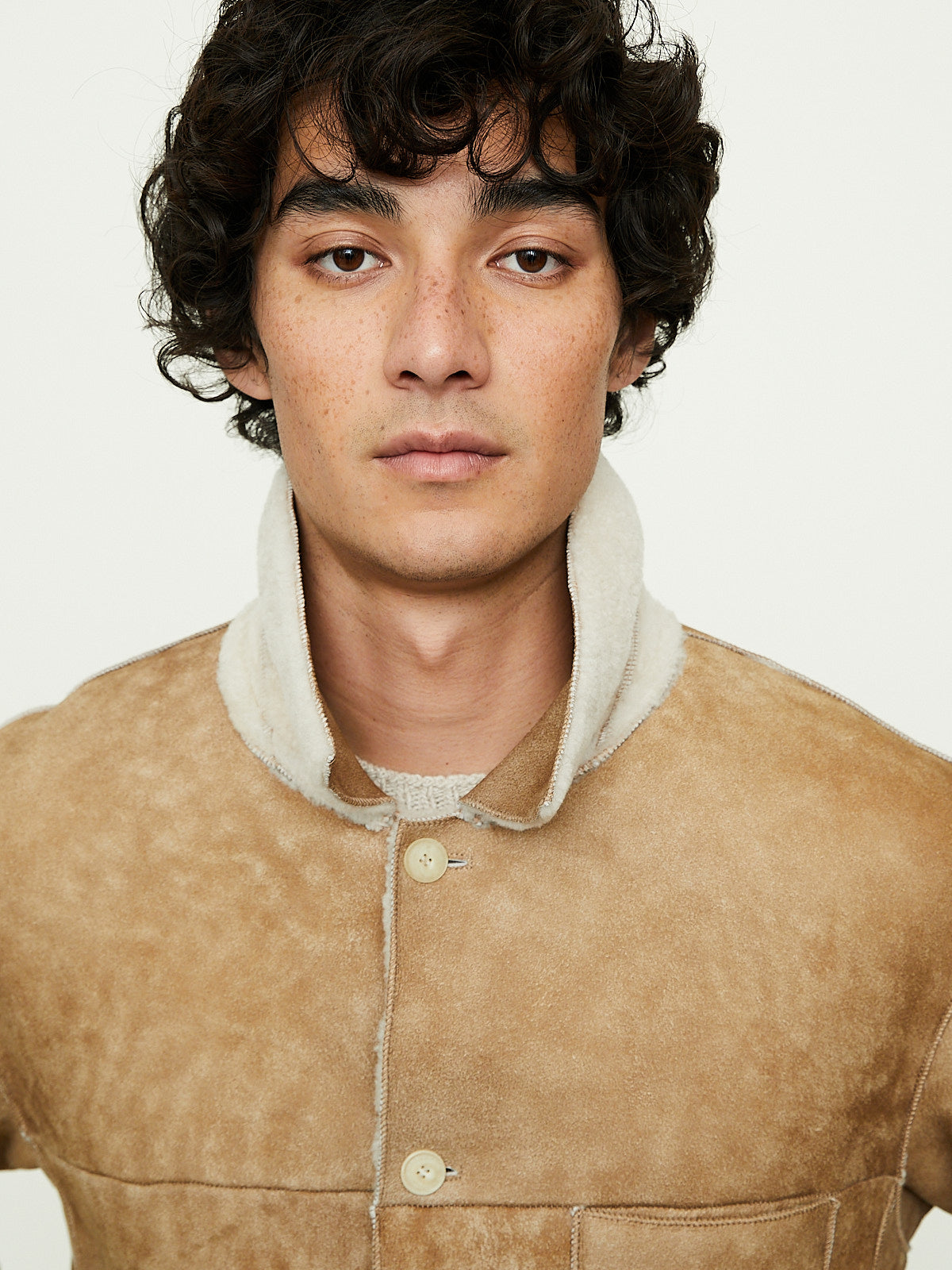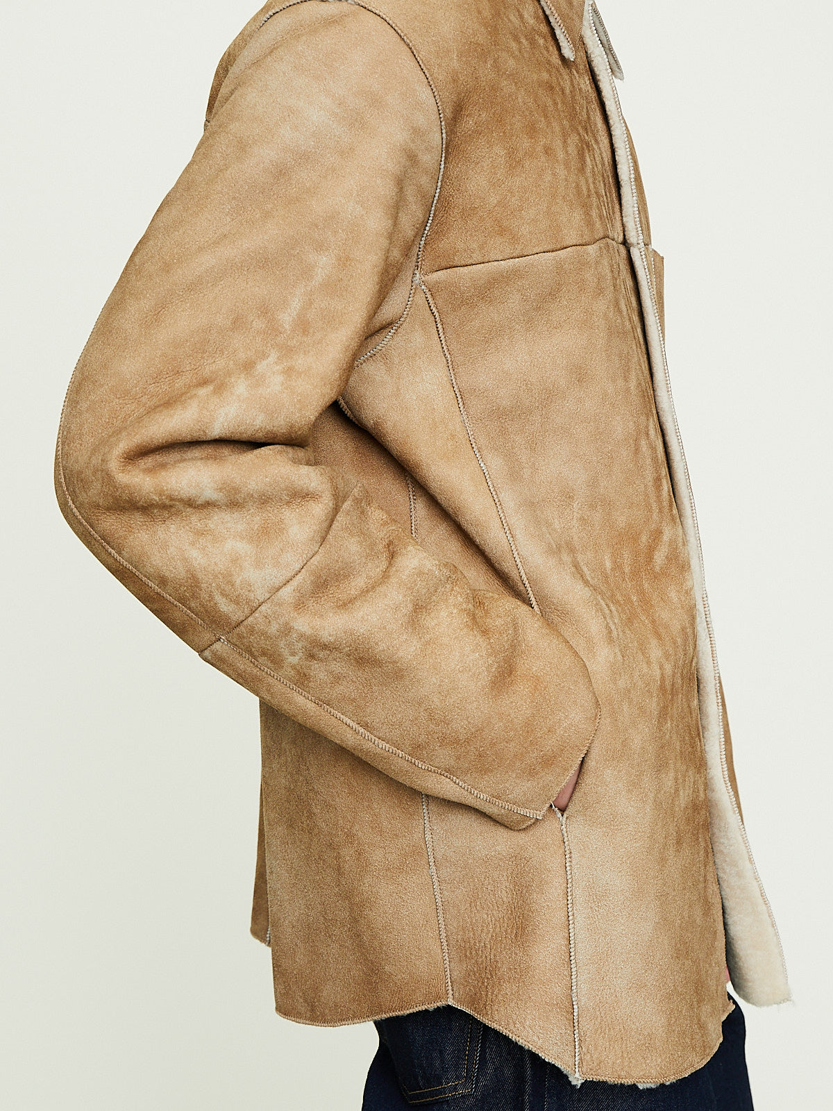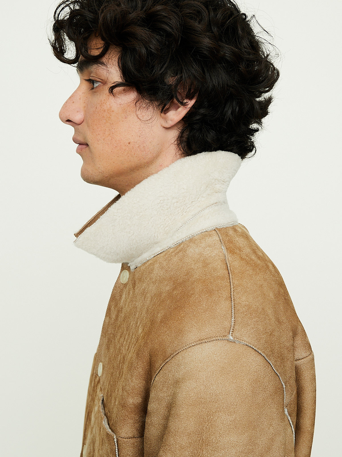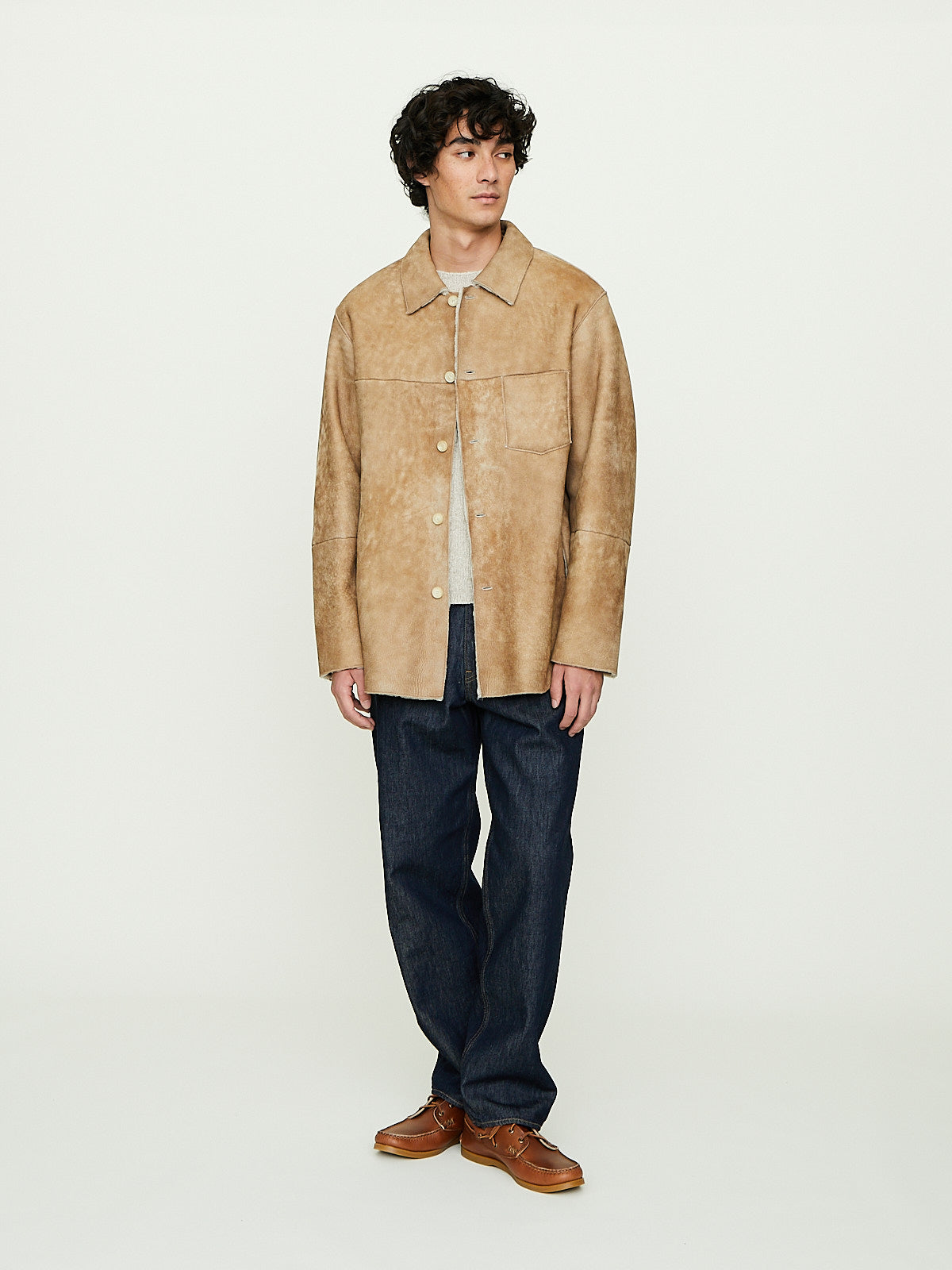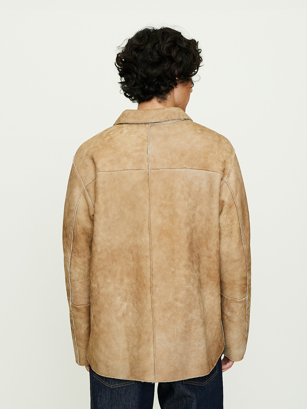 Shirt jacket made from beige carefully selected Turkish sheepskin that has a suede finish. The wool has been trimmed and then lightly straightened, creating a texture that blends the best of both the curly and straight fibres. Classic collar, front button fastening and long sleeves. Features a single chest pocket and side seam pockets. Front and back yoke detail. Regular fit. Unlined.
