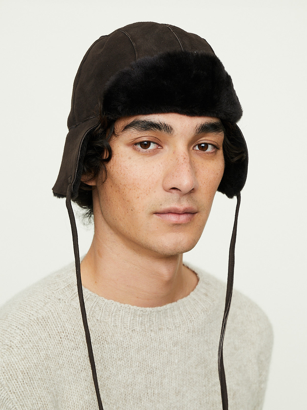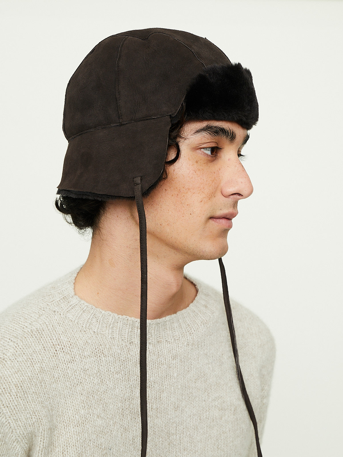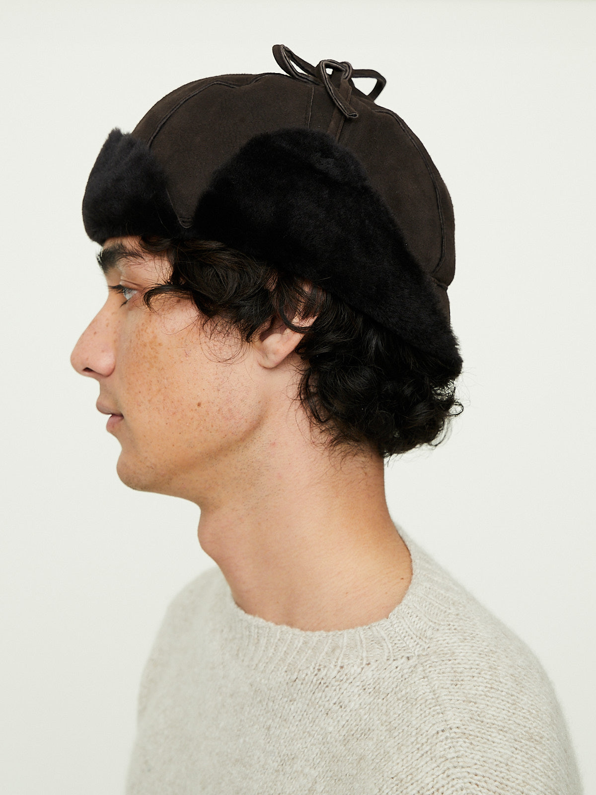 Cap made from dark brown carefully selected Turkish sheepskin, minimally processed in order to retain its natural volume and softness. The leather side (reverse) is treated with a Nappa lamb finish, achieving a lightweight, single-layer structure. Features ear flaps that can be tied on the crown.