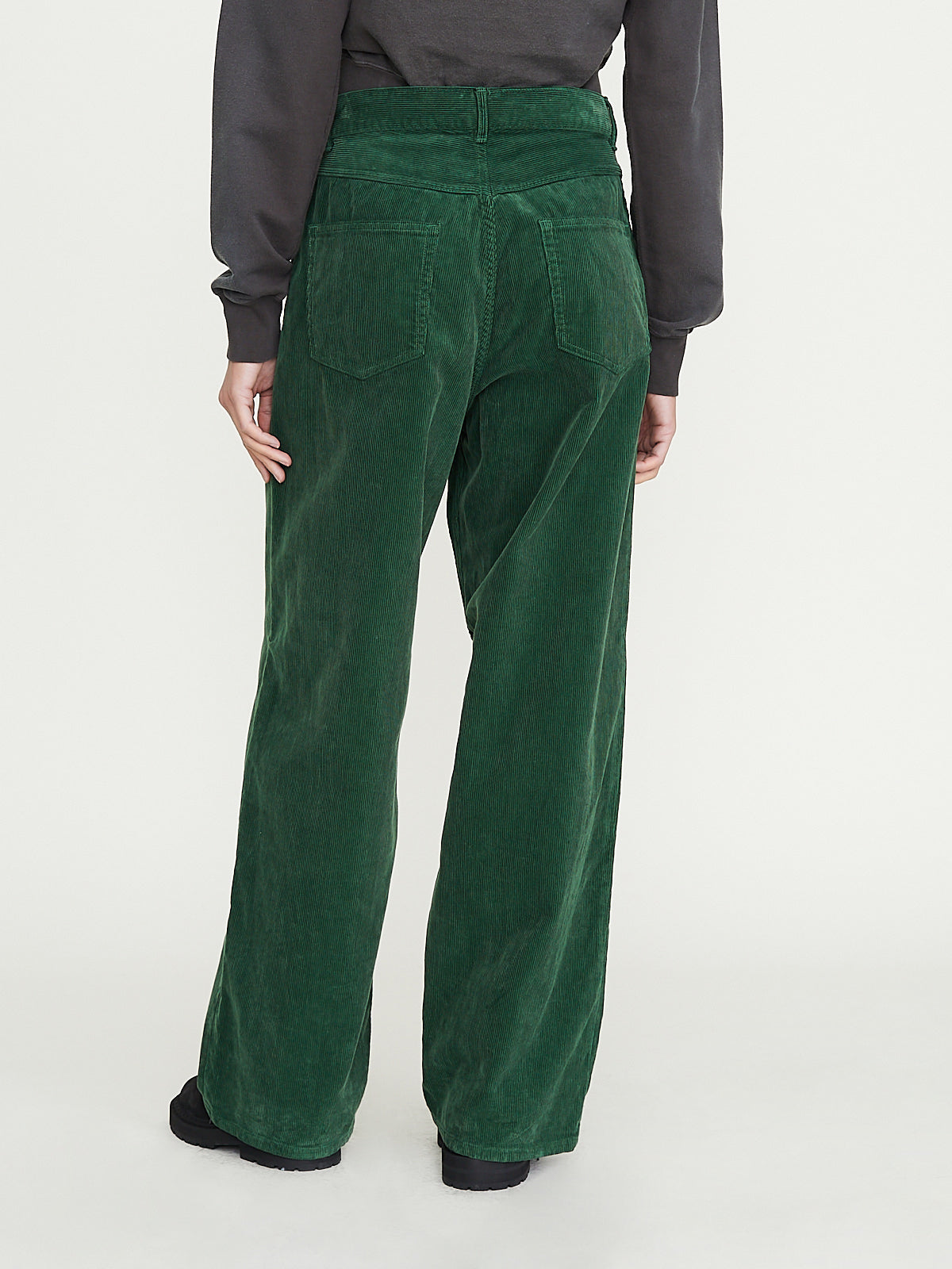 Wide leg pants crafted from garment-dyed forest green Egyptian Finx cotton. To create a soft texture, the fabric is carefully beaten and washed, resulting in a smooth feel. Belt loops and a single button and zip fastening. Classic 5-pocket styling. Straight legs.