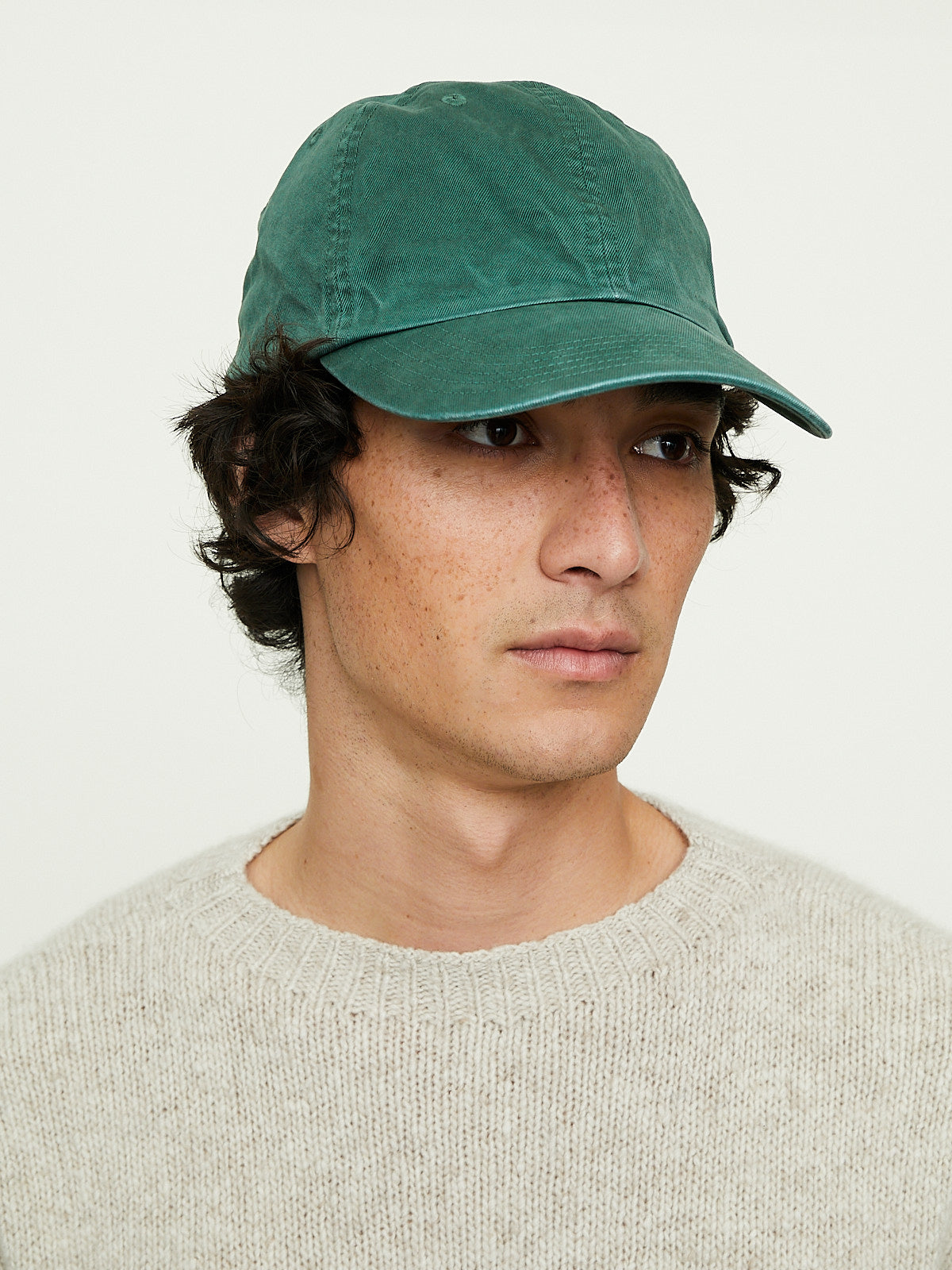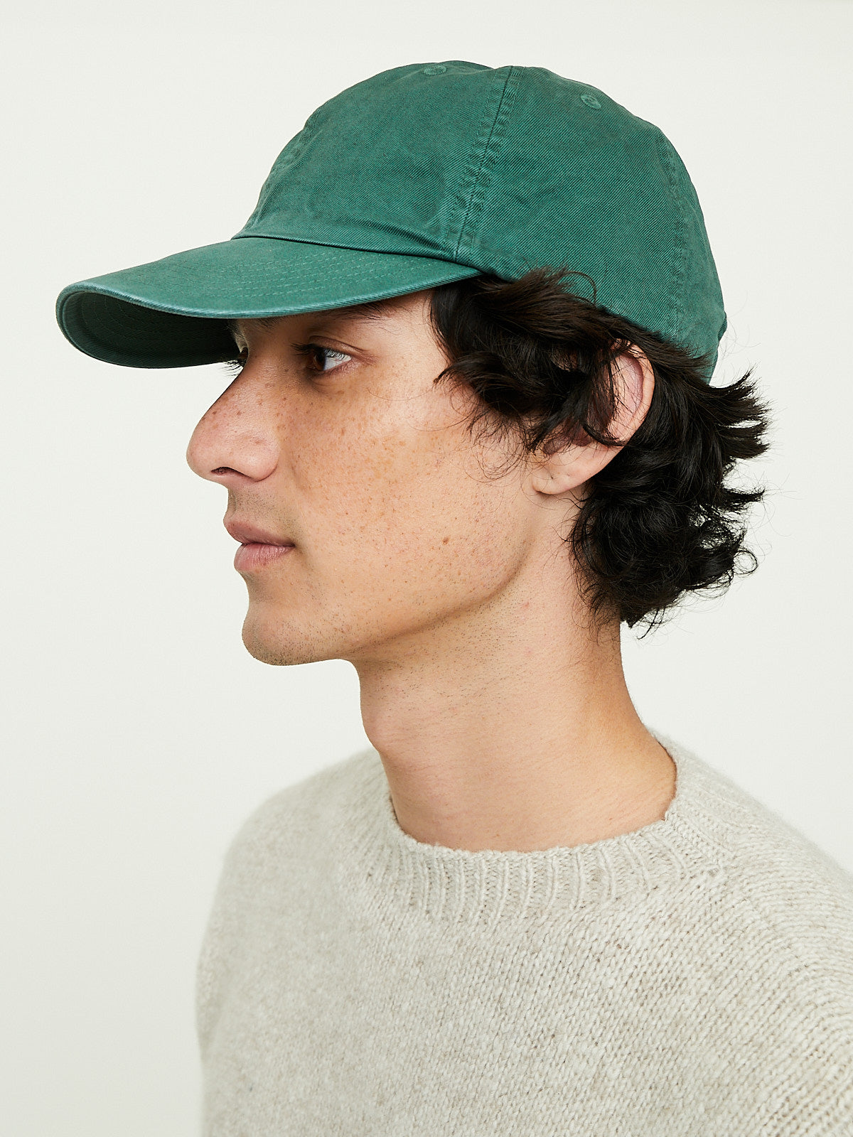 Classic cap made from green Egyptian extra-long staple Finx cotton,' with threads twisted into three strands to bring out its natural fullness and smooth texture. After product dyeing, craftsmen carefully apply hand-finishing techniques, creating a unique, uneven colour tone.