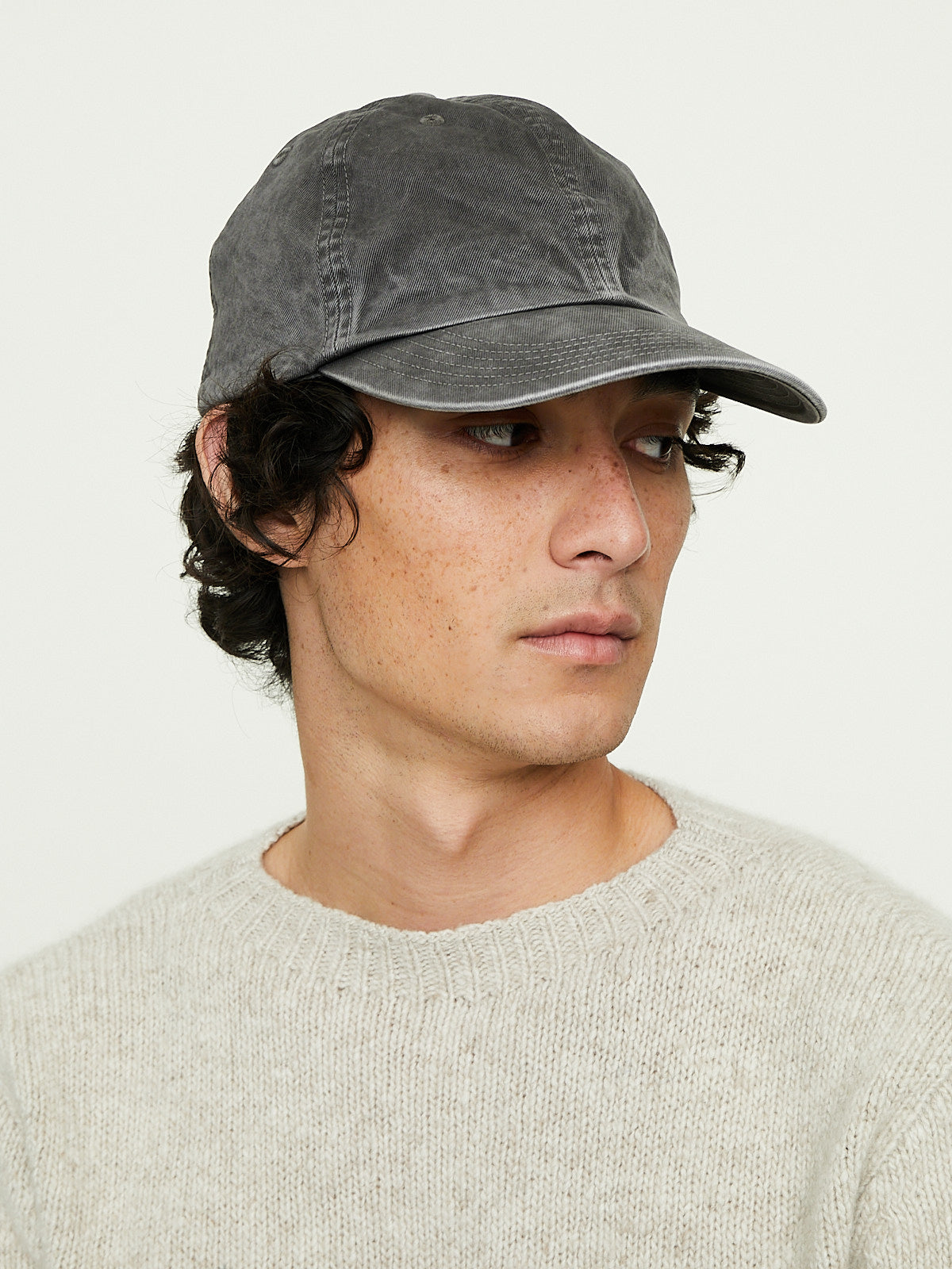 Classic cap made from grey Egyptian extra-long staple Finx cotton,' with threads twisted into three strands to bring out its natural fullness and smooth texture. After product dyeing, craftsmen carefully apply hand-finishing techniques, creating a unique, uneven colour tone.