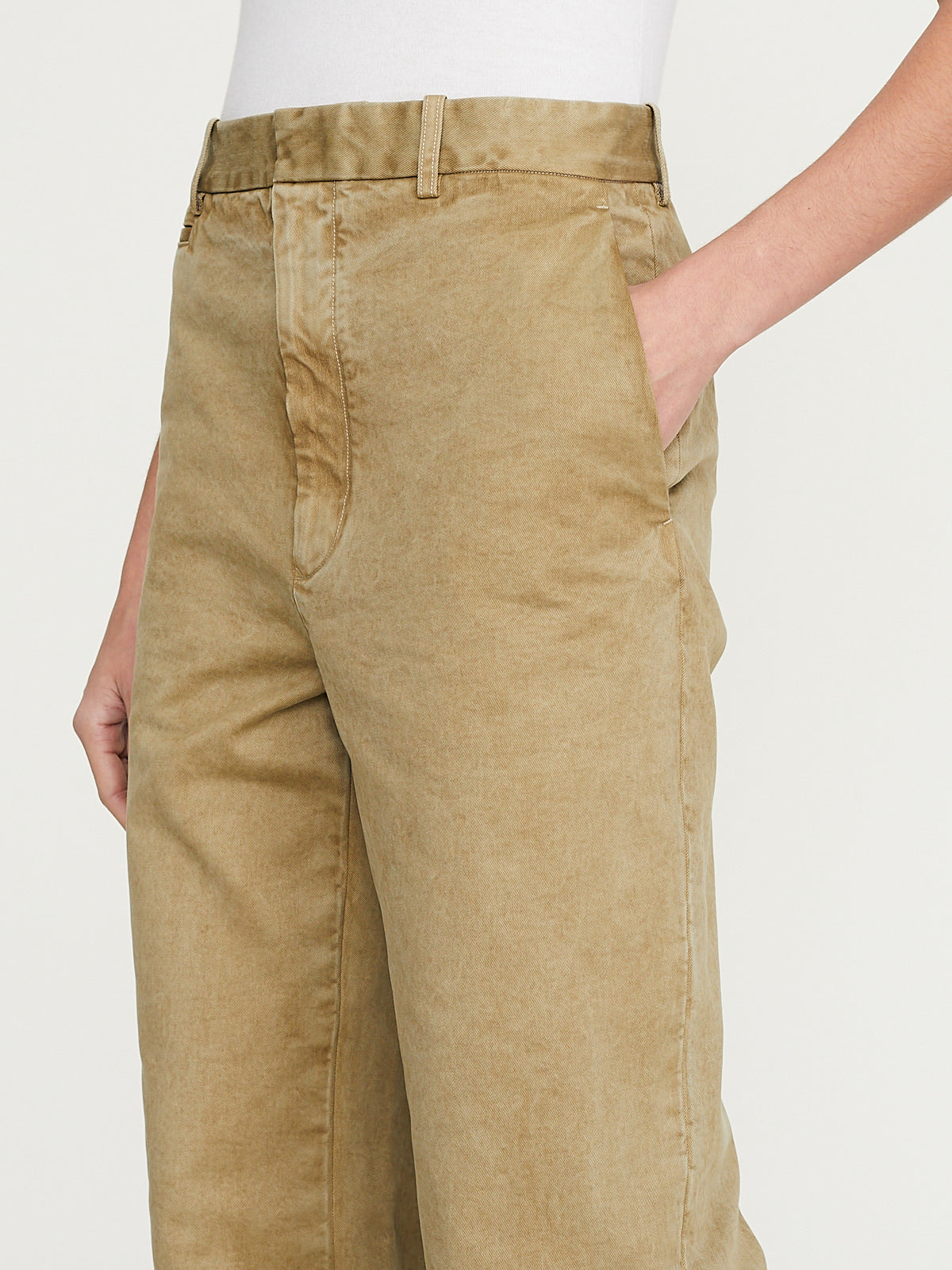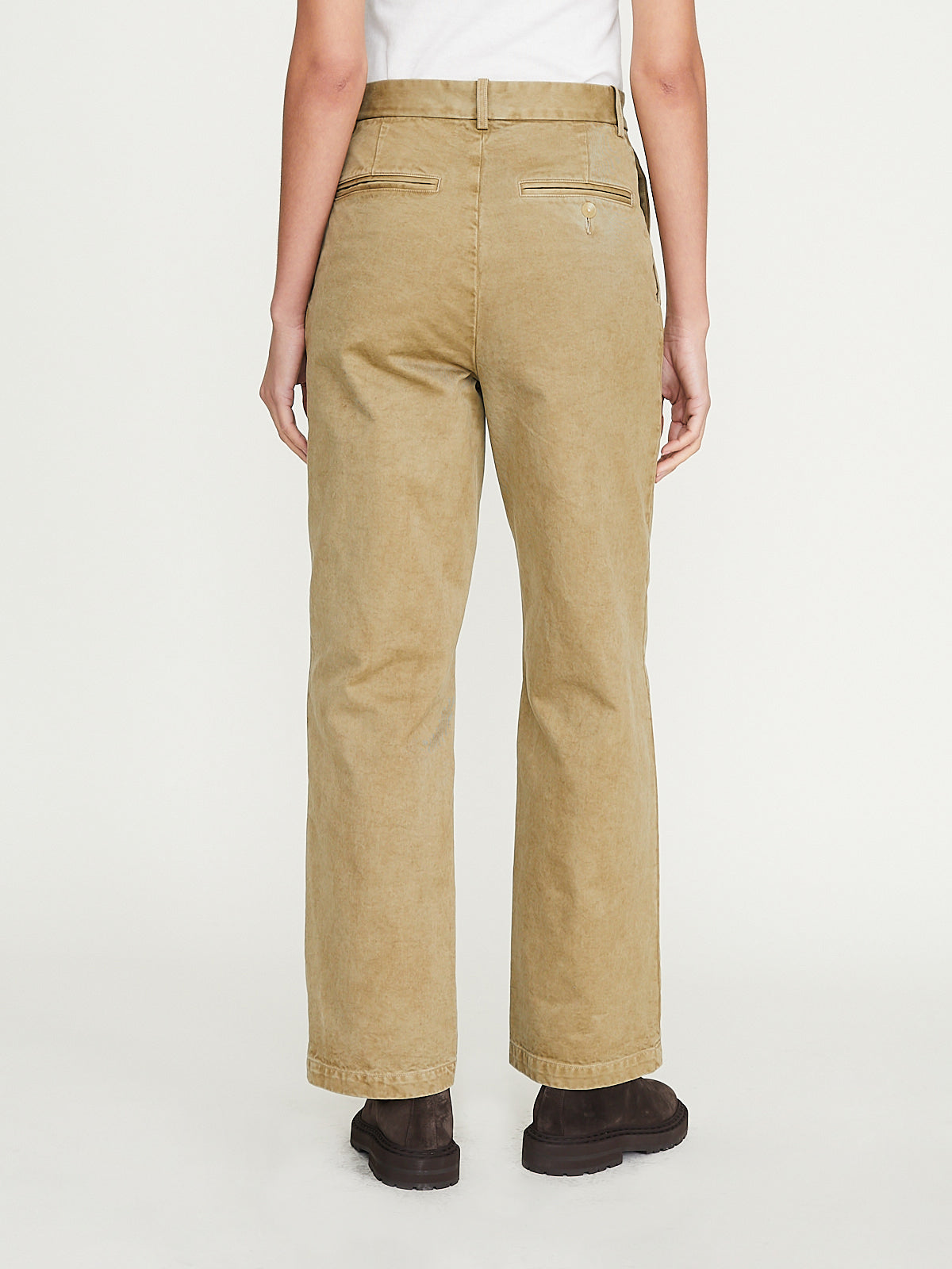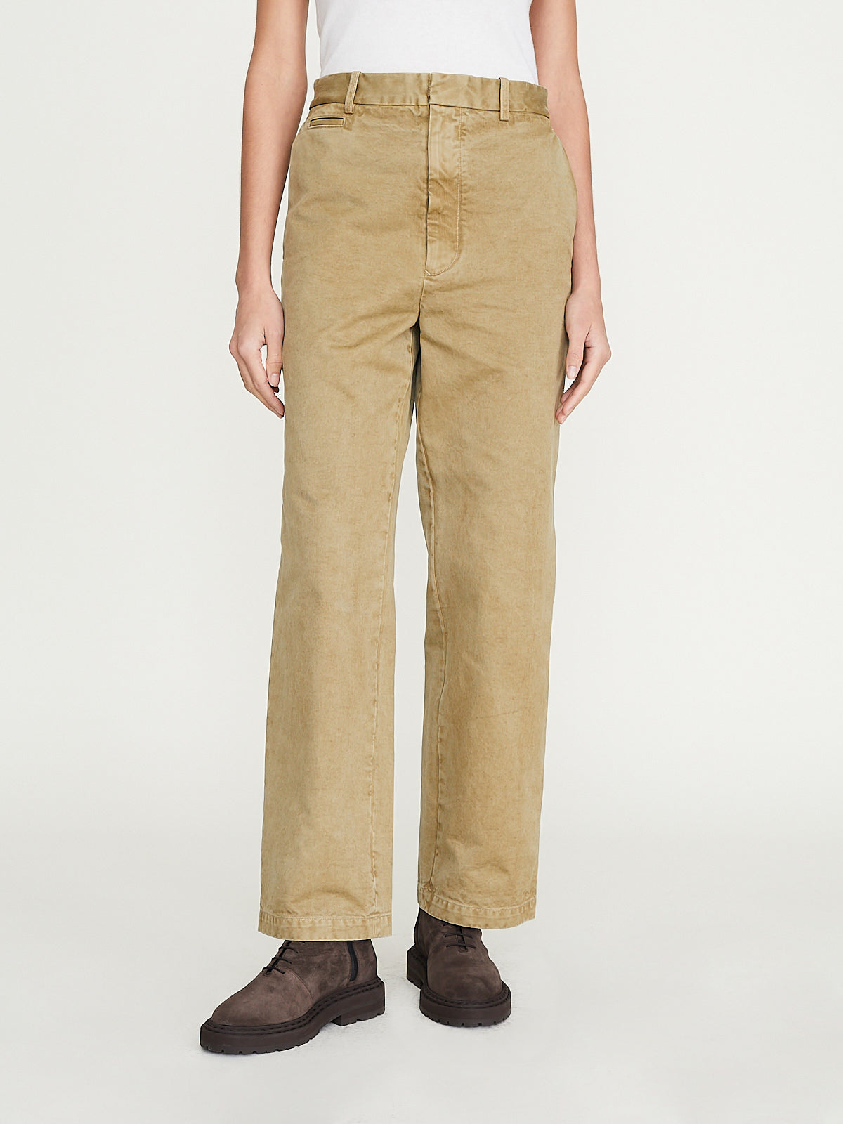 Regular chino in garment-dyed beige Egyptian extra-long staple Finx cotton, with threads twisted into three strands to bring out its natural fullness and smooth texture. Belt loops, hook and zip fastening. Coin pocket on the front and jetted pockets on the back, one with a button fastening. Straight legs.