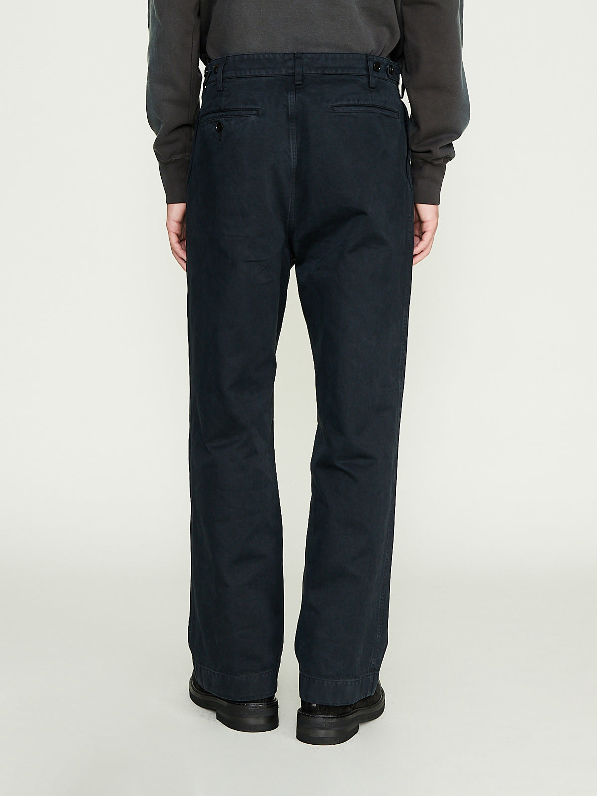 Unisex chino made from black Egyptian extra-long staple Finx cotton, with threads twisted into three strands to bring out its natural fullness and smooth texture. After product dyeing, craftsmen carefully apply hand-finishing techniques, creating a unique, uneven colour tone. Belt loops, off-centre button fastening and a zip fly. Adjustable button tabs on the side of the waist. Welted side seam pockets and tuck-pleats on the front. Welted pockets on the back, one with a button fastening. Relaxed fit and straight legs.