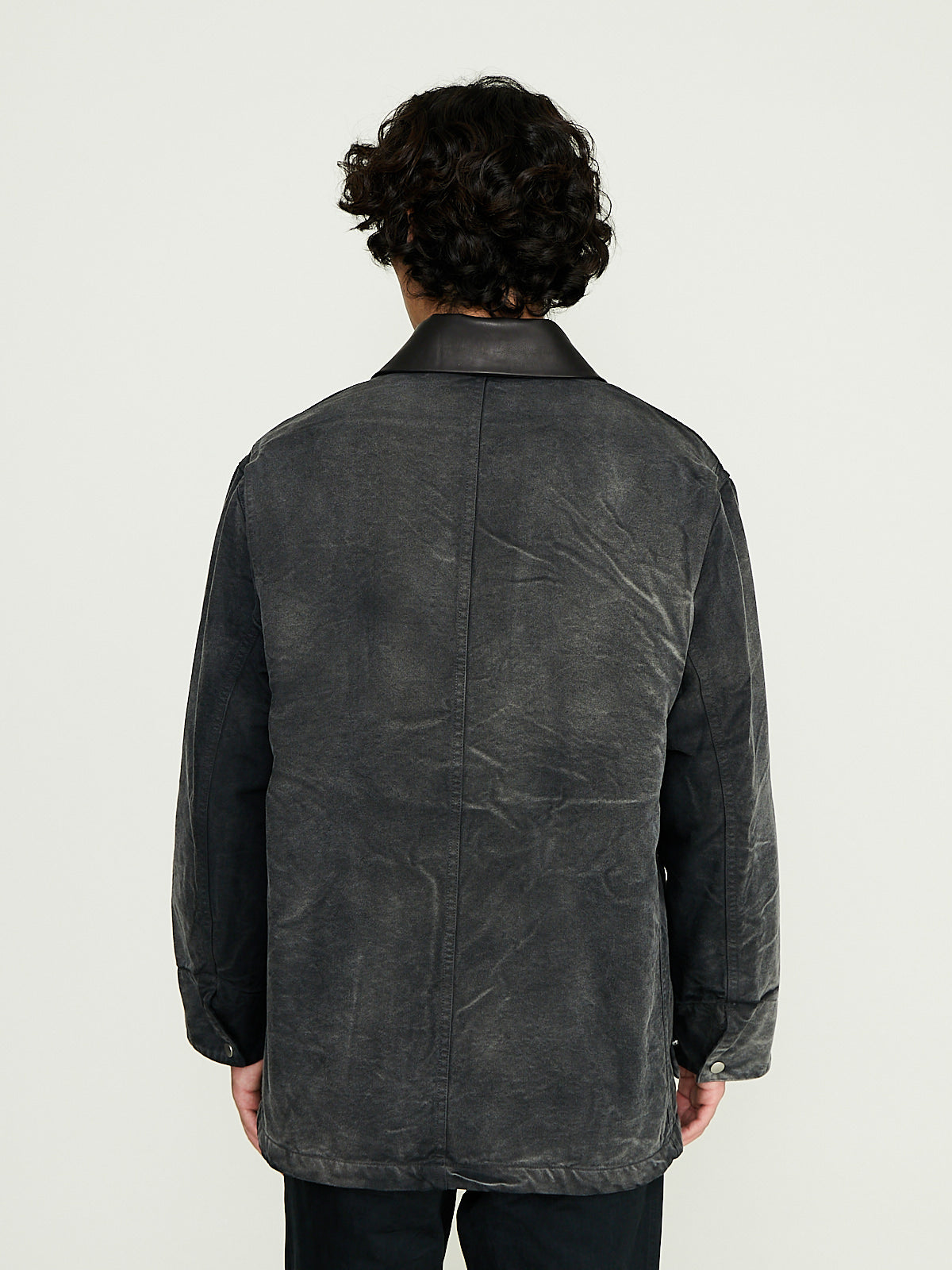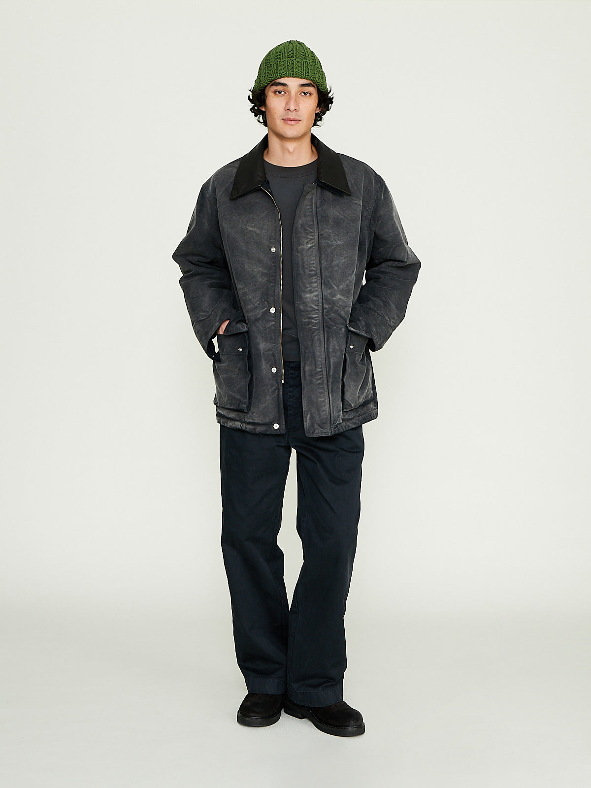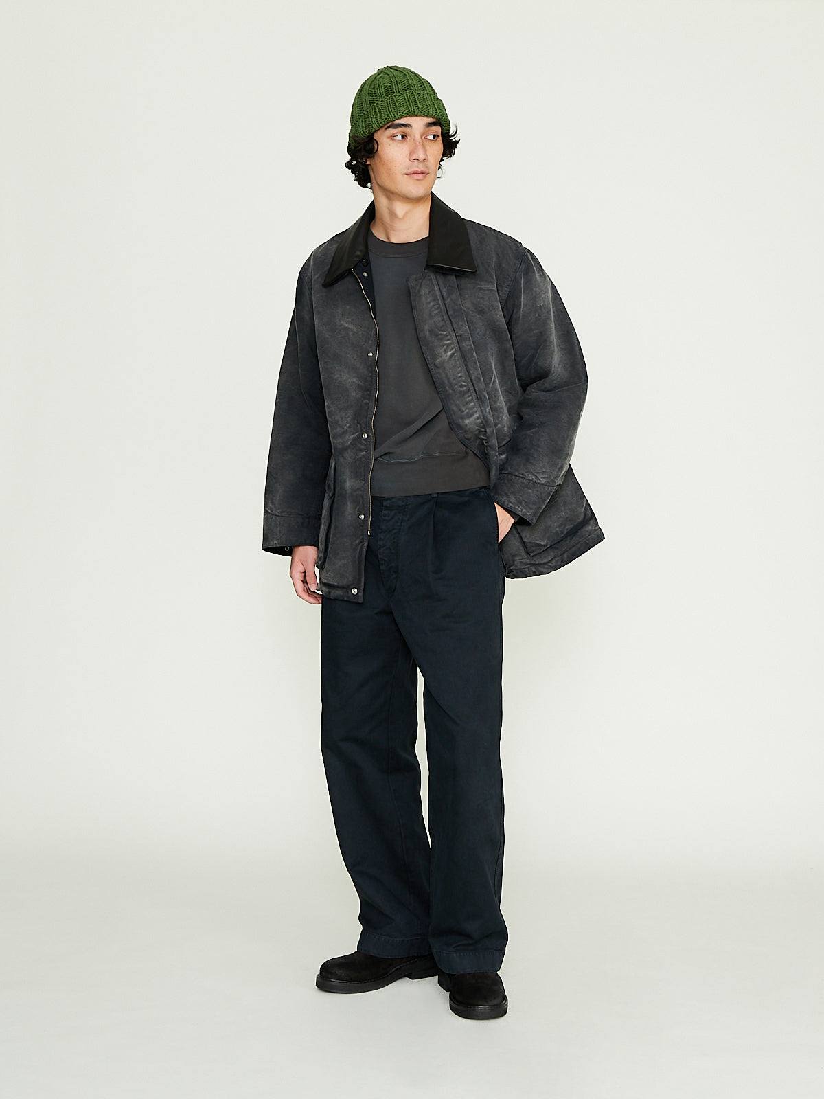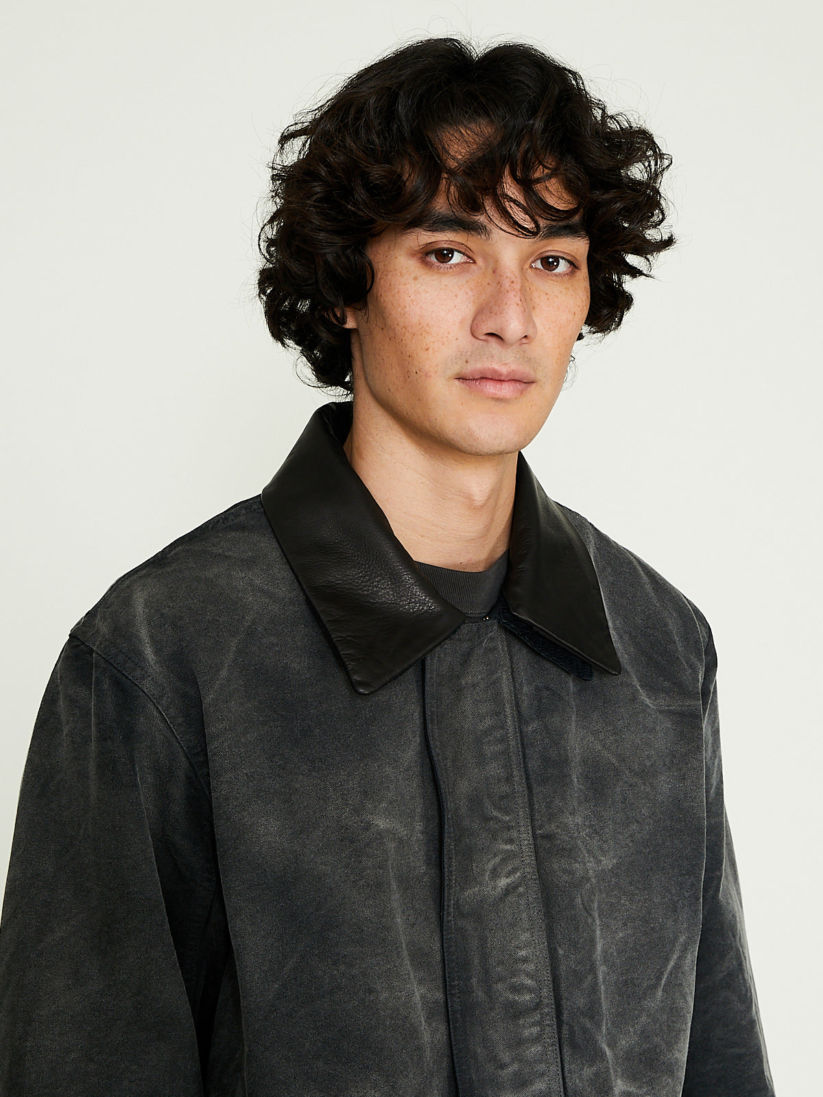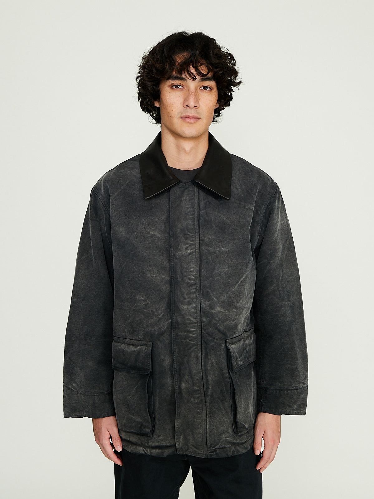 Oversized workwear jacket in faded black garment-dyed duck fabric, densely woven from thick organic cotton yarns, both in the warp and weft. Each piece is carefully hand-finished to bring out a vintage-inspired feel, giving every fabric a unique expression. Detachable leather collar, front zip and snap-button fastening. Long sleeves with a dropped shoulder and buttoned cuffs. Flap pockets on the front. Unlined.