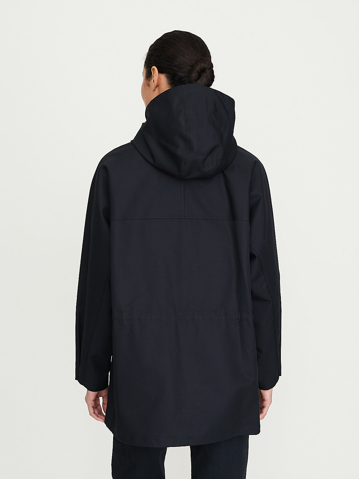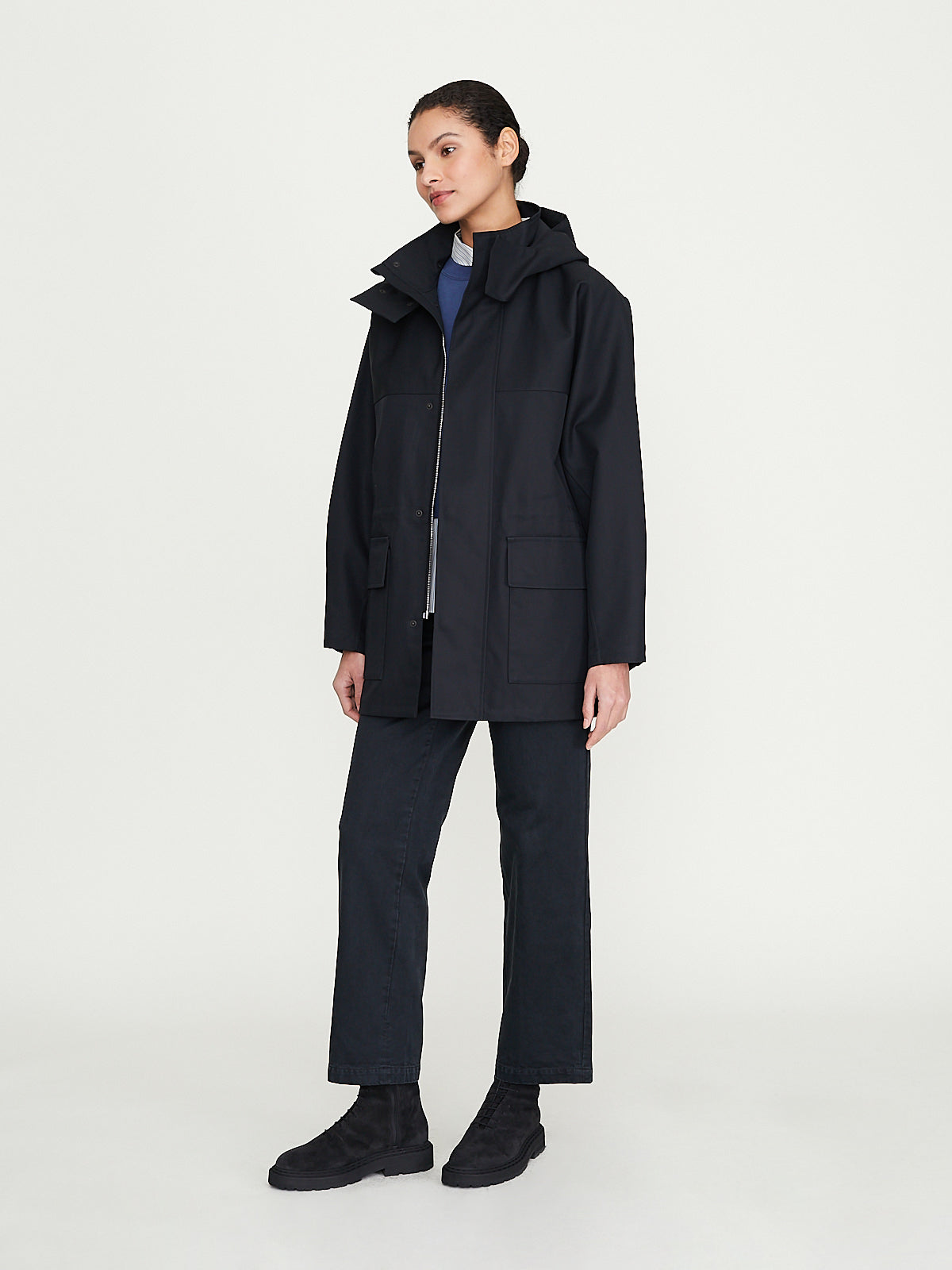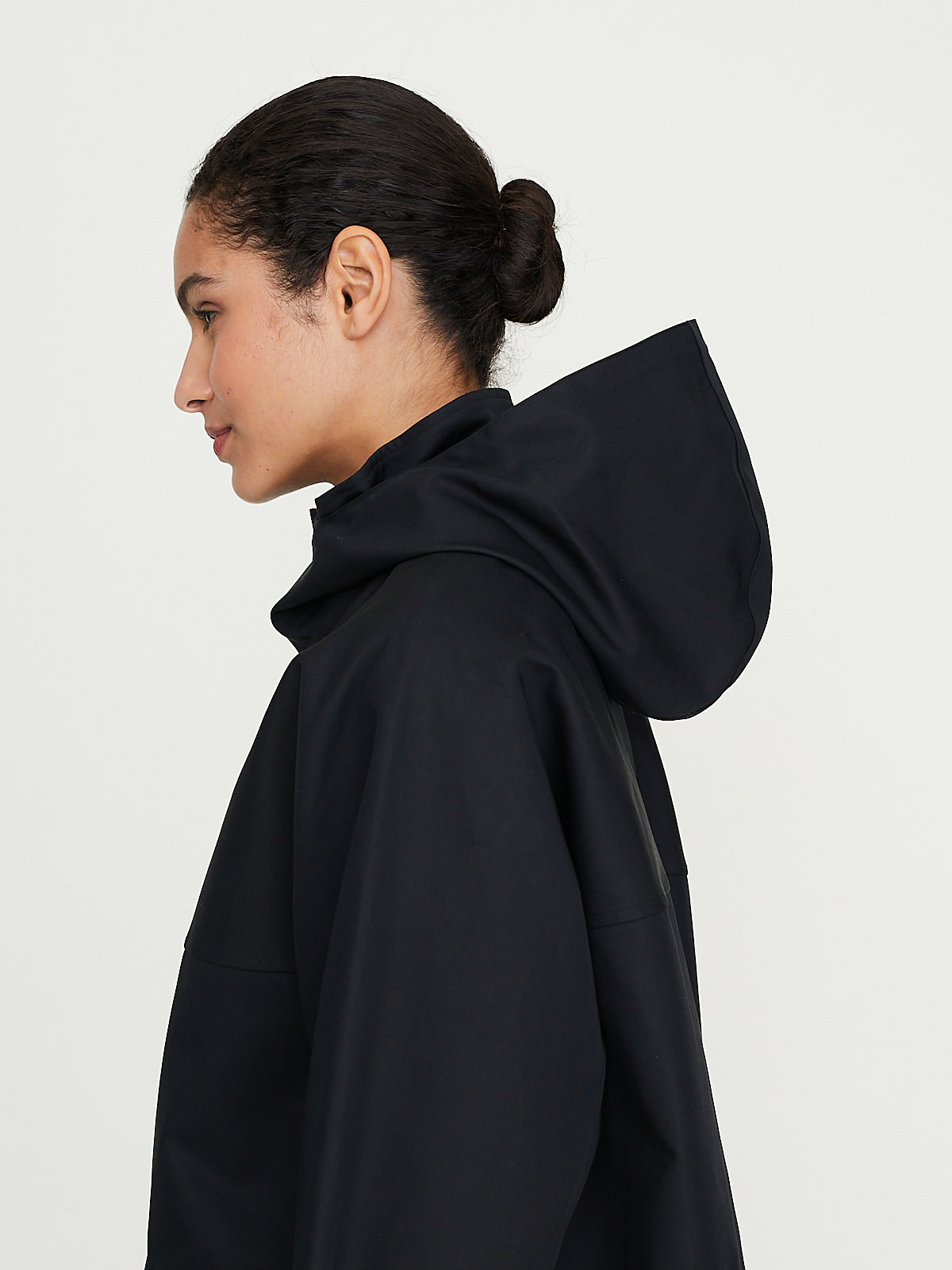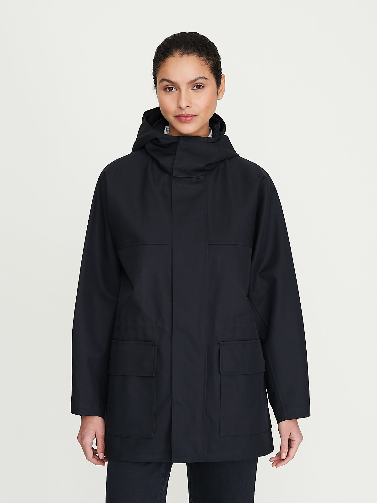 Stand collar, detachable hood and with a concealed front snap-button fastening. Flap pockets on the front and an internal drawstring around the waist and bottom hem. Unlined.