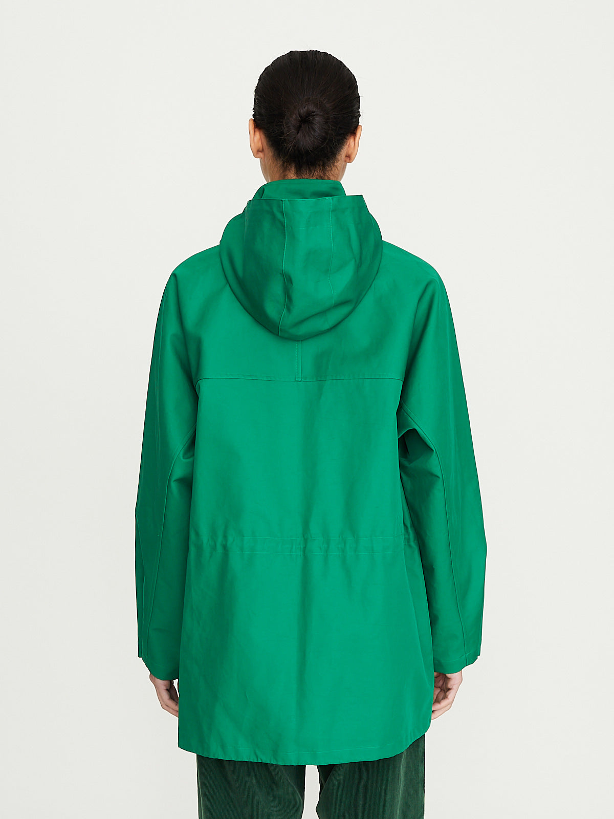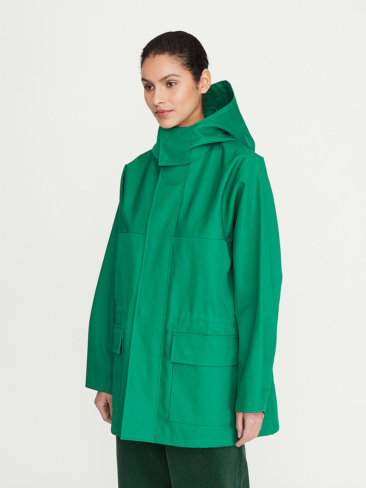 Stand collar, detachable hood and with a concealed front snap-button fastening. Flap pockets on the front and an internal drawstring around the waist and bottom hem. Unlined.