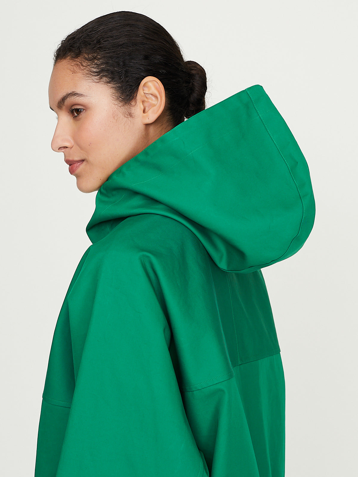 Oversized jacket in green lightweight yet structural cotton gabardine, densely woven and bonded on both sides. The surface is delicately brushed, adding a subtle texture adding to its refined balance of volume, resilience, and a smooth finish.