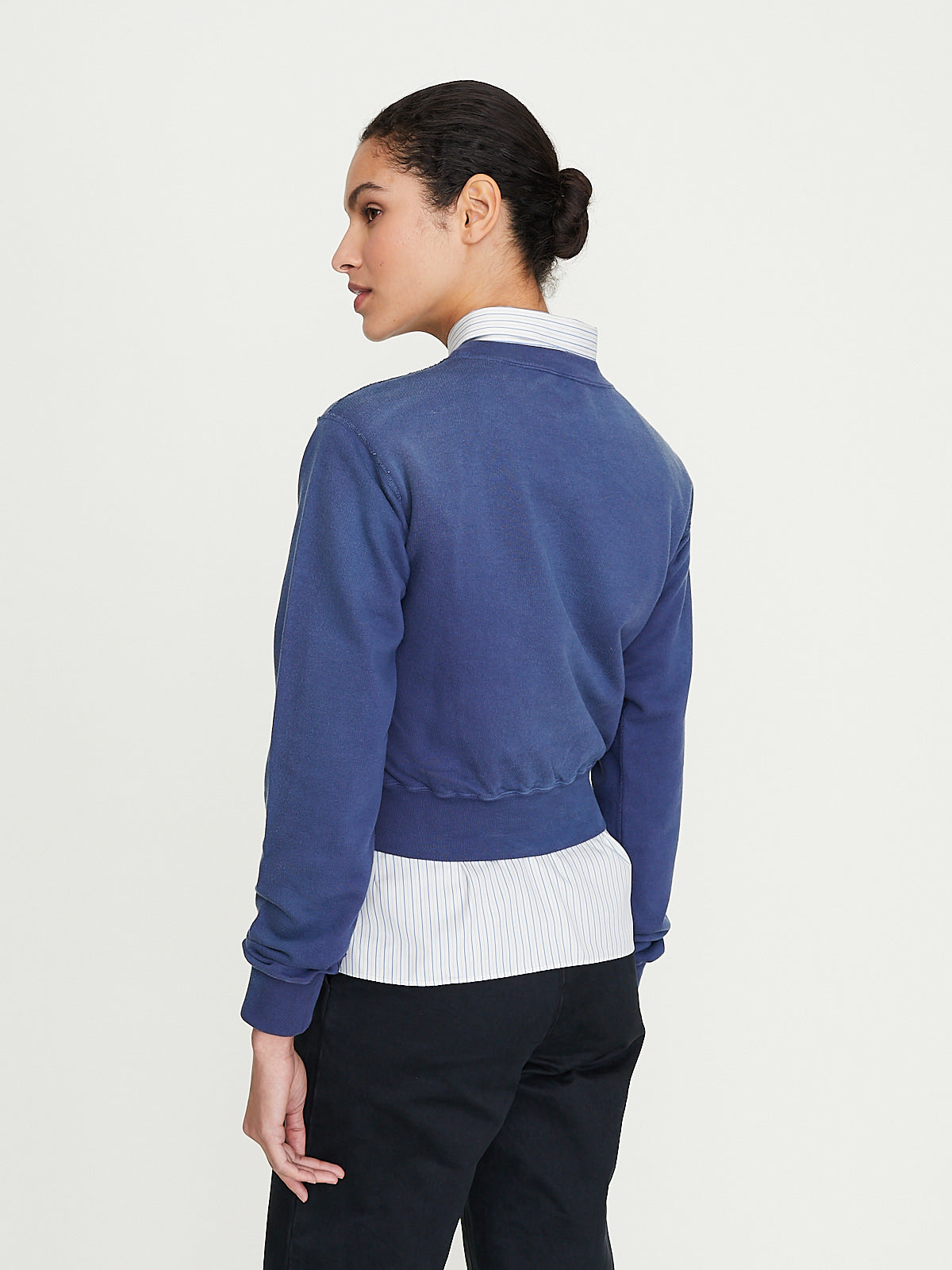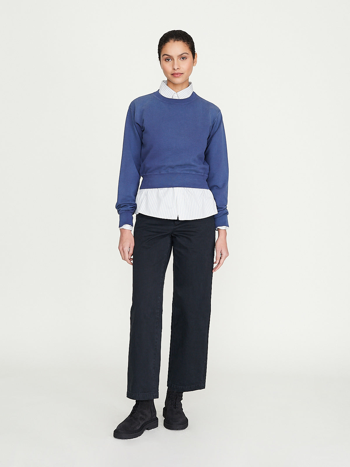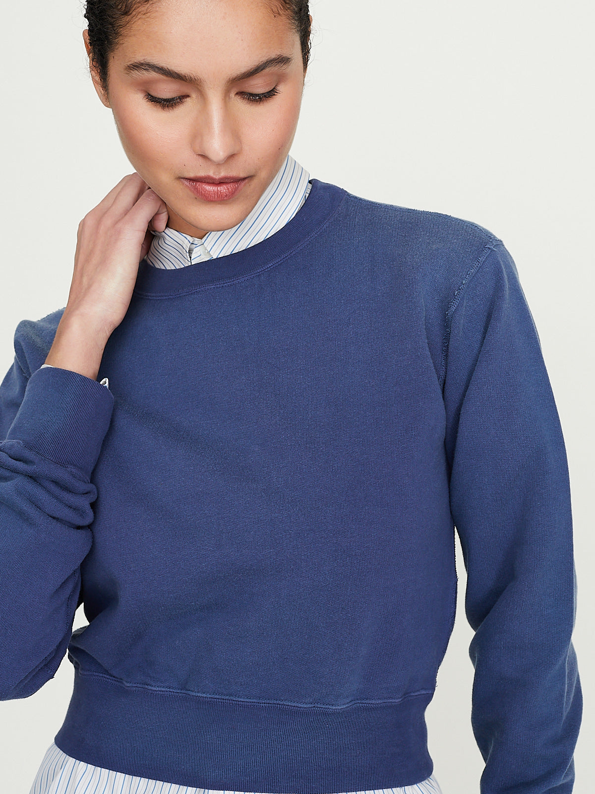 Classic garment-dyed sweatshirt made by using Pima cotton and elastic spun yarn with a worn-in light navy colour. Crewneck and slightly cropped. Rib detail around the neck, cuffs and bottom hem. Slim fit.