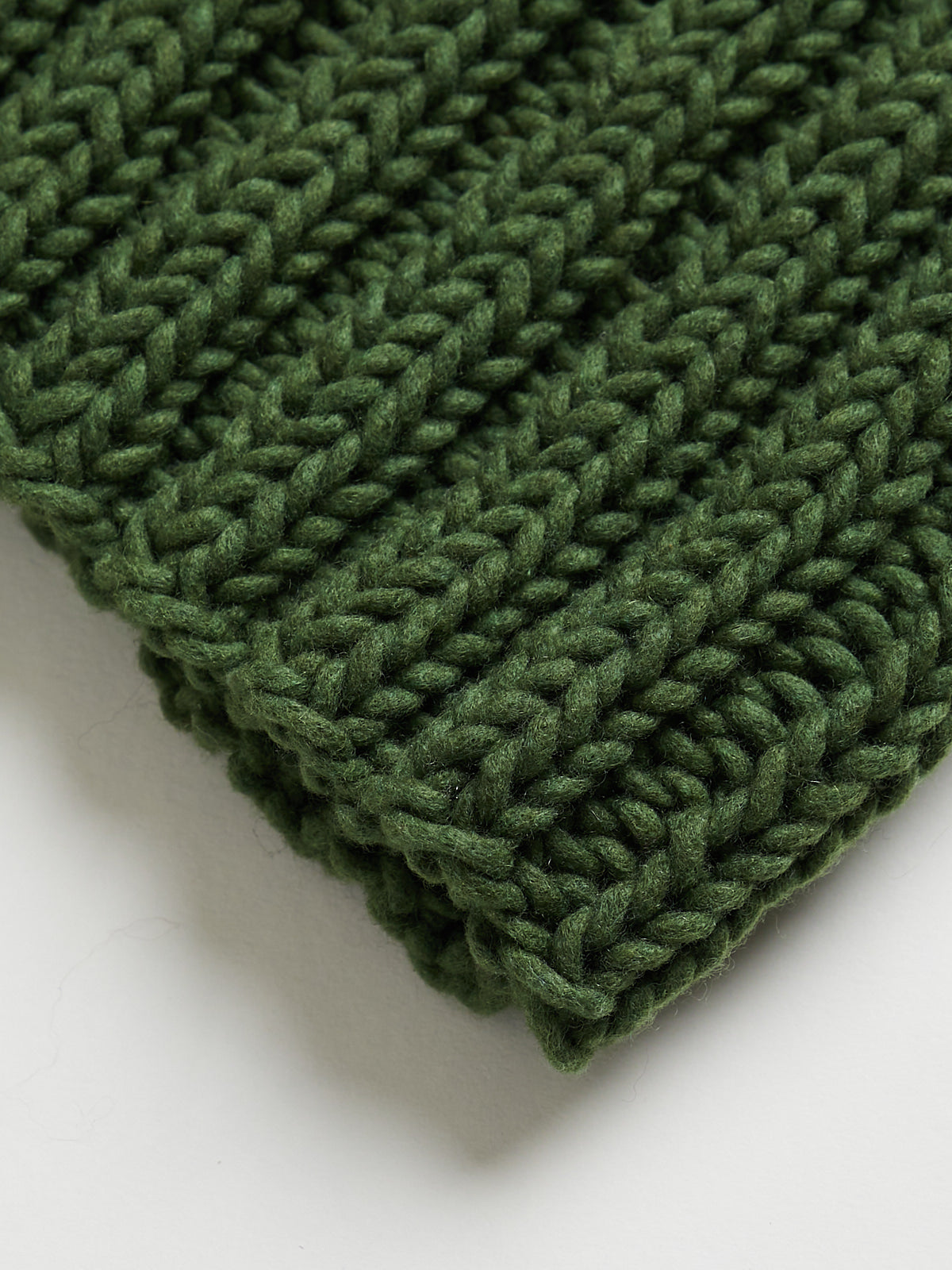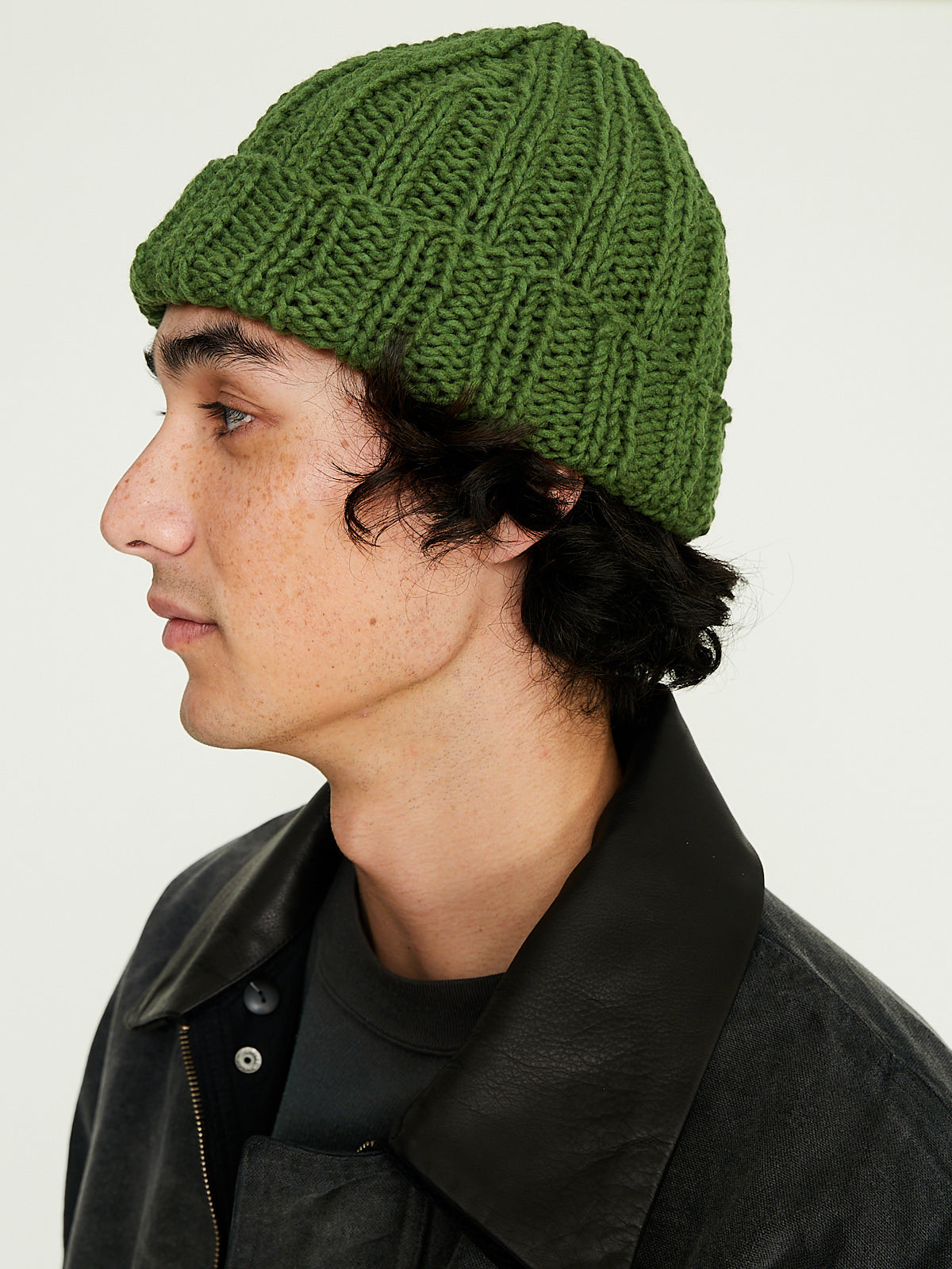 Knitted beanie in olive green thick-spun wool/cashmere yarn which are twisted in multiple strands and felted. Features a turned-up cuff.