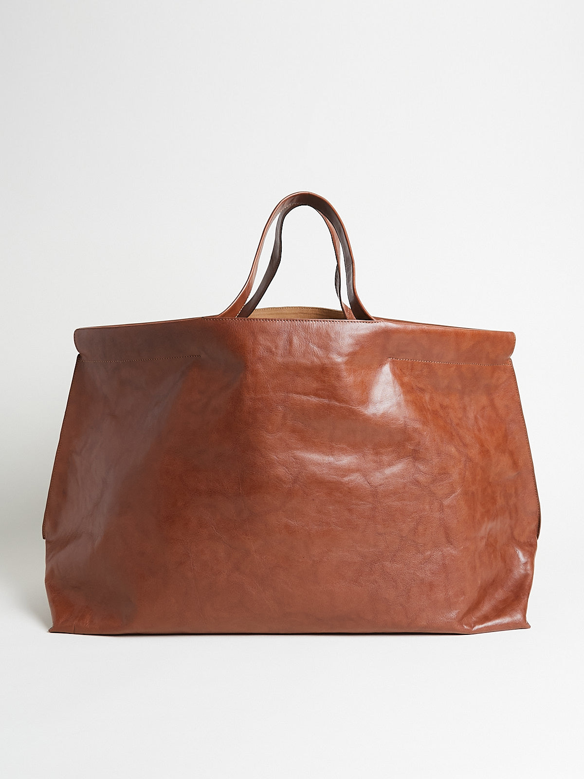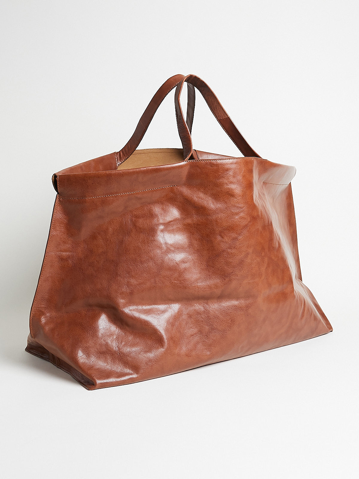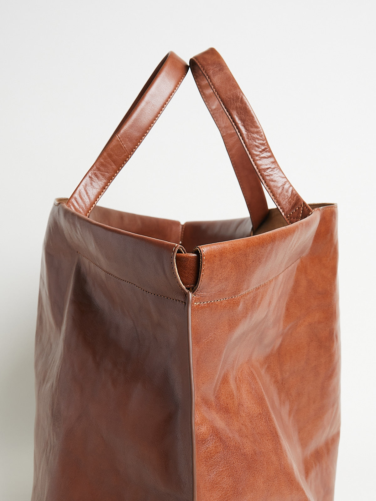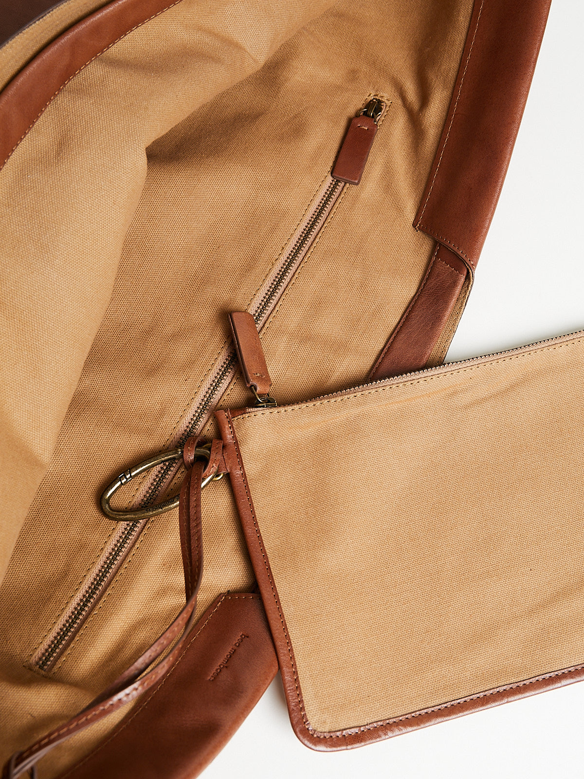 Extra large shopper bag in tan brown buffalo leather. Detachable interior pouch and top handles that can convert into a single shoulder strap with a ruching effect. Features a single interior zippered pocket, a detachable clasp key ring and three interior slip pockets. Lined in cotton canvas.