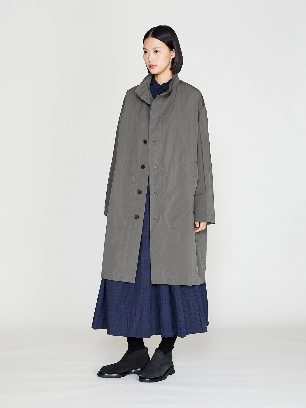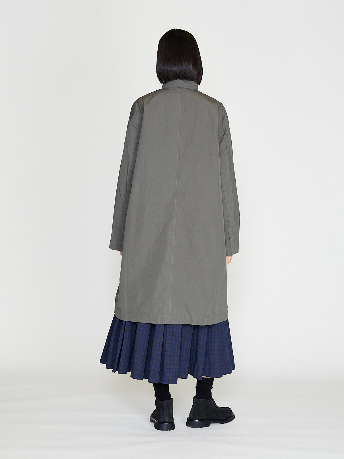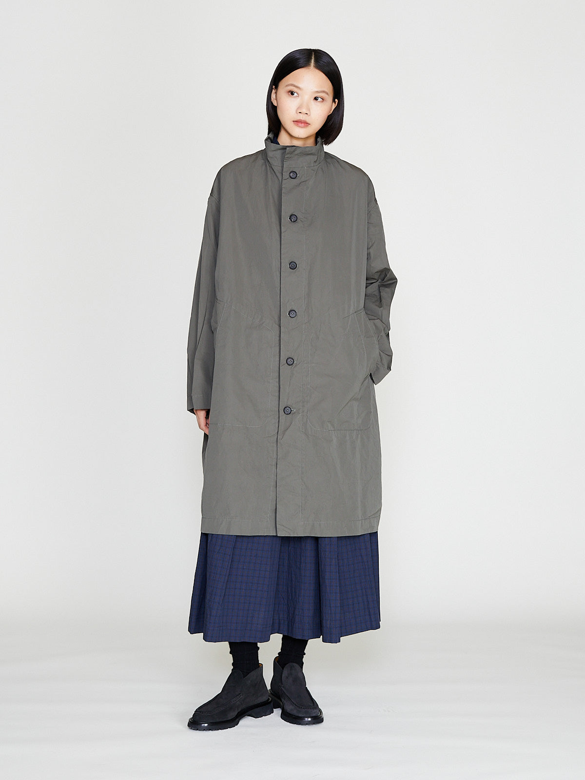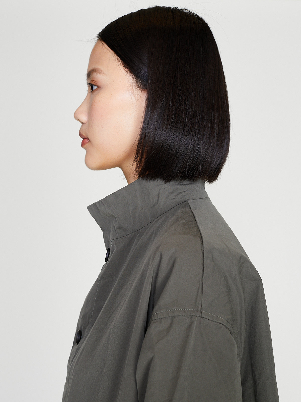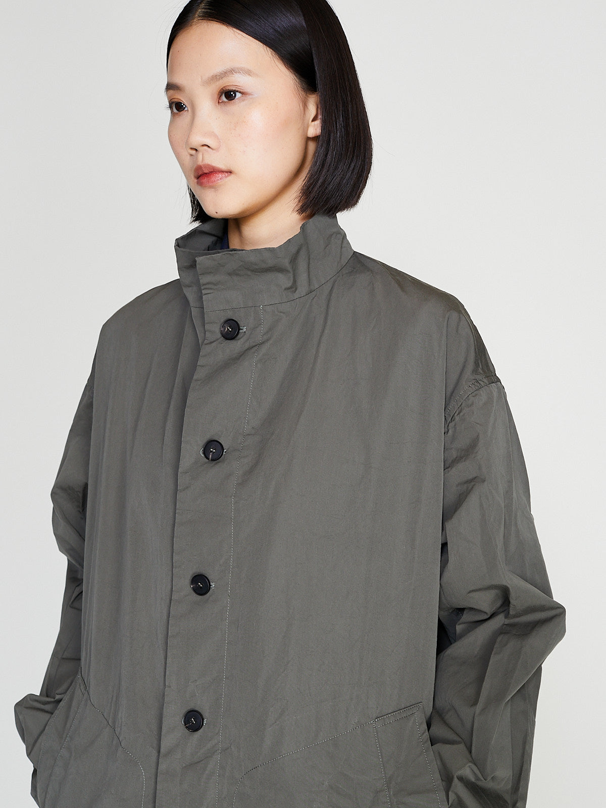 Oversized coat in taupe cotton. Funnelneck, long sleeves with a dropped shoulder and welted pockets on the front.