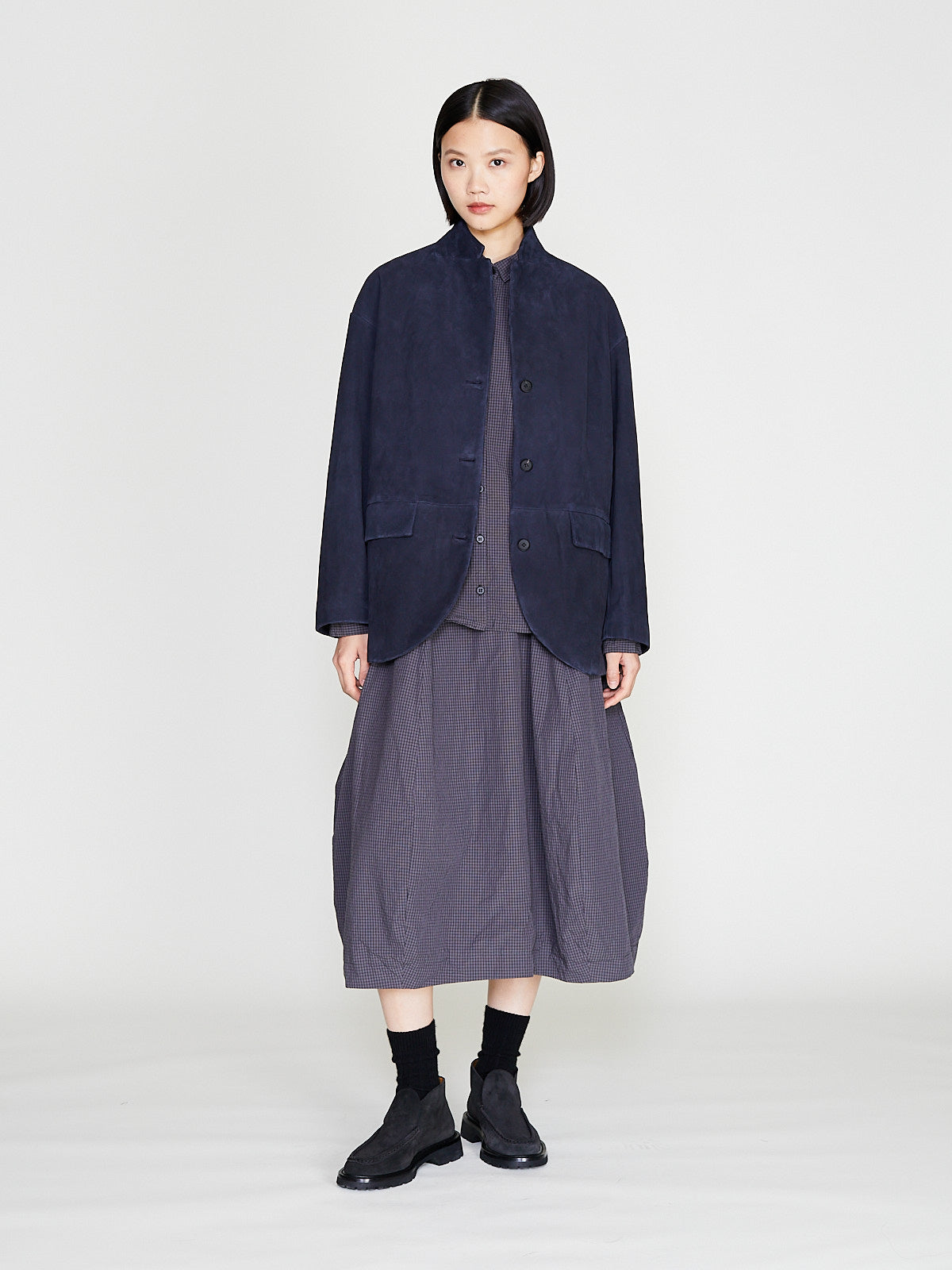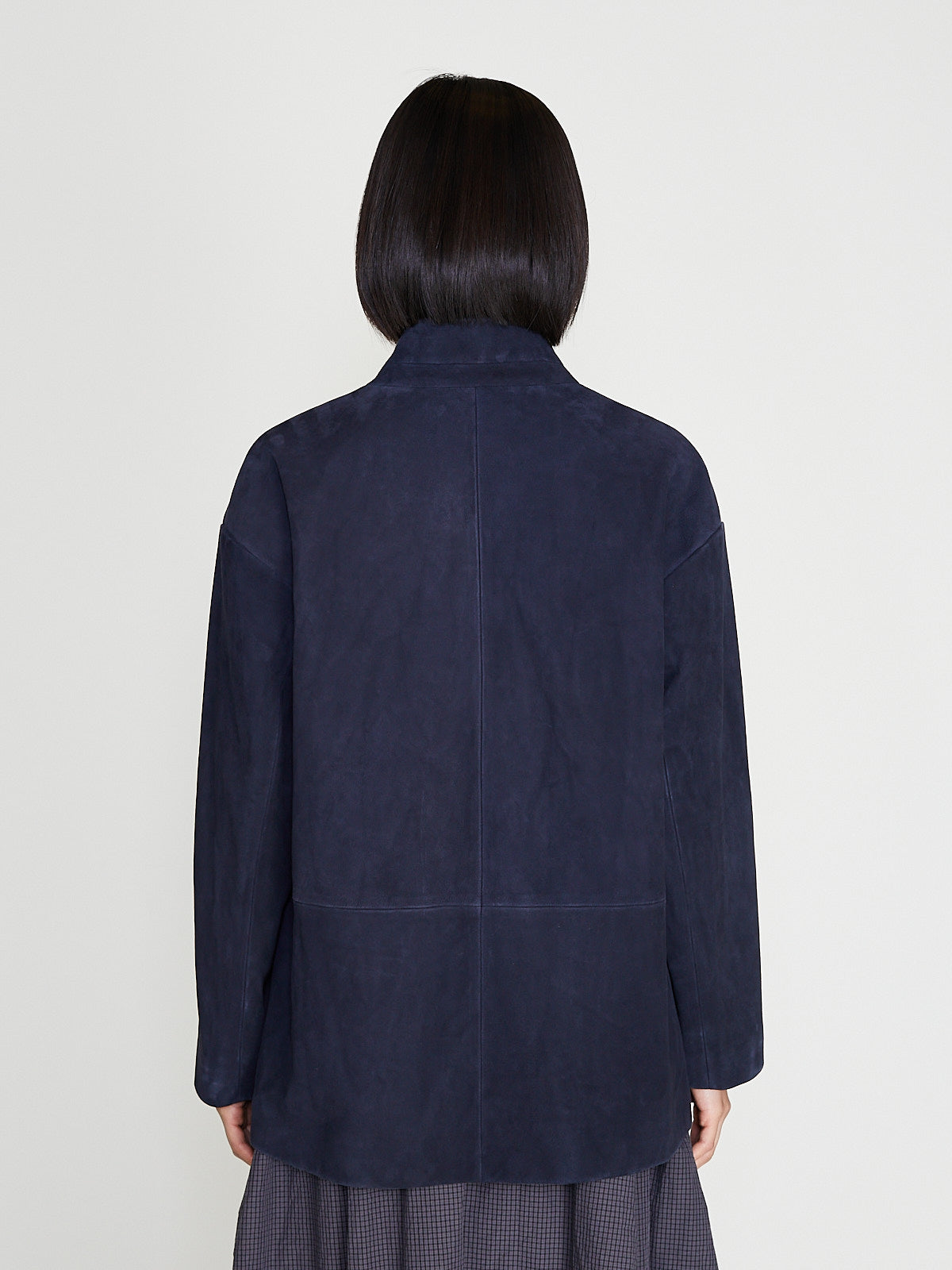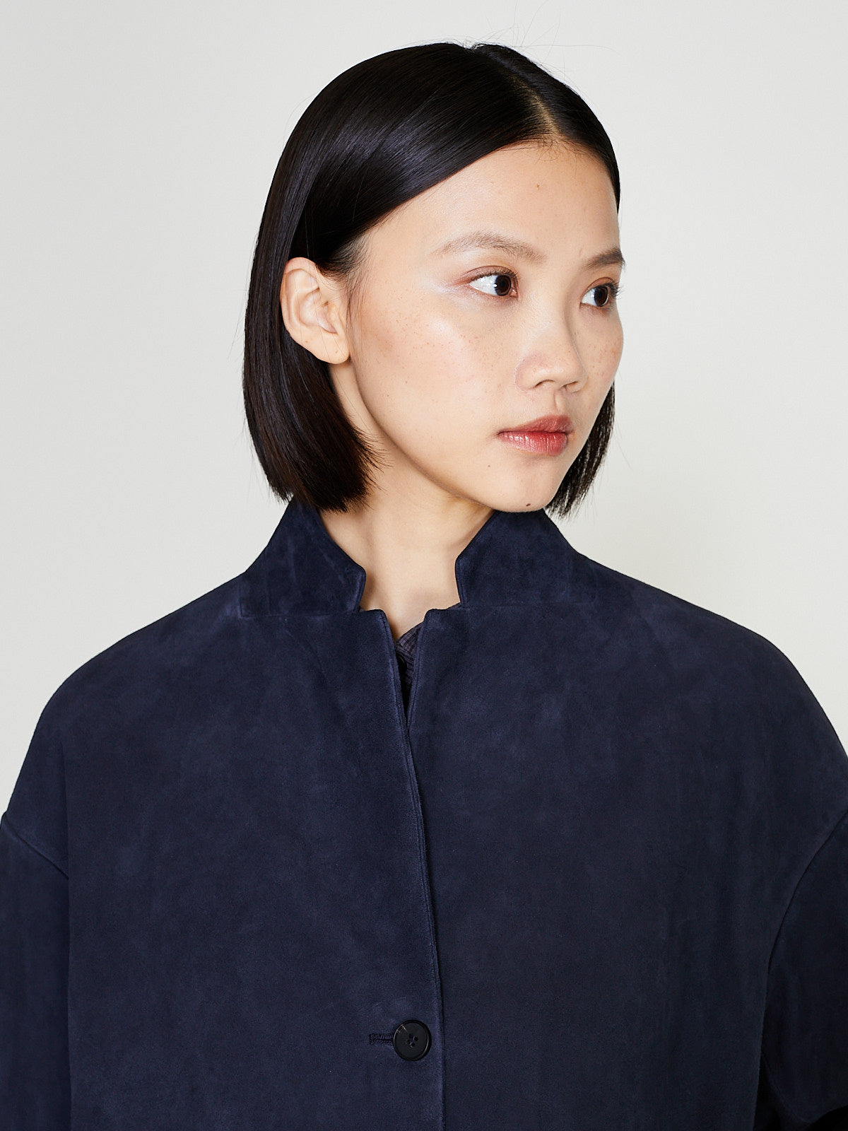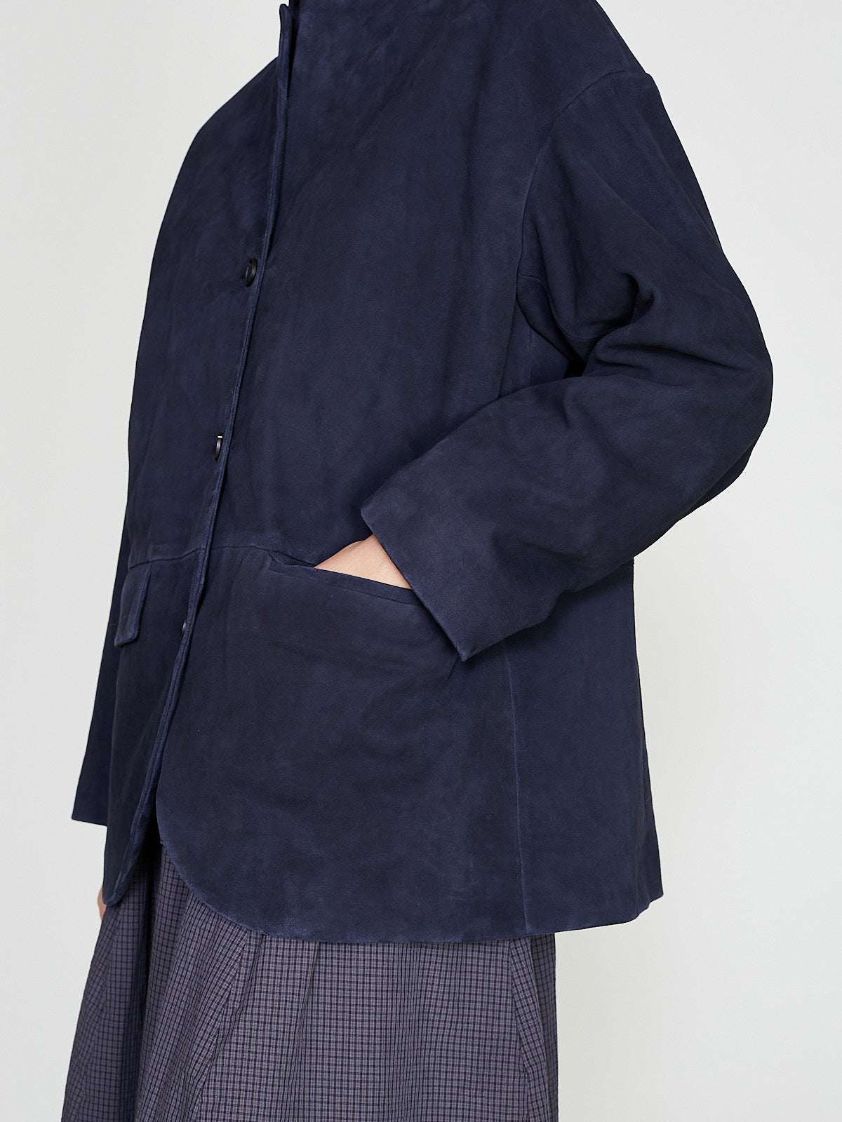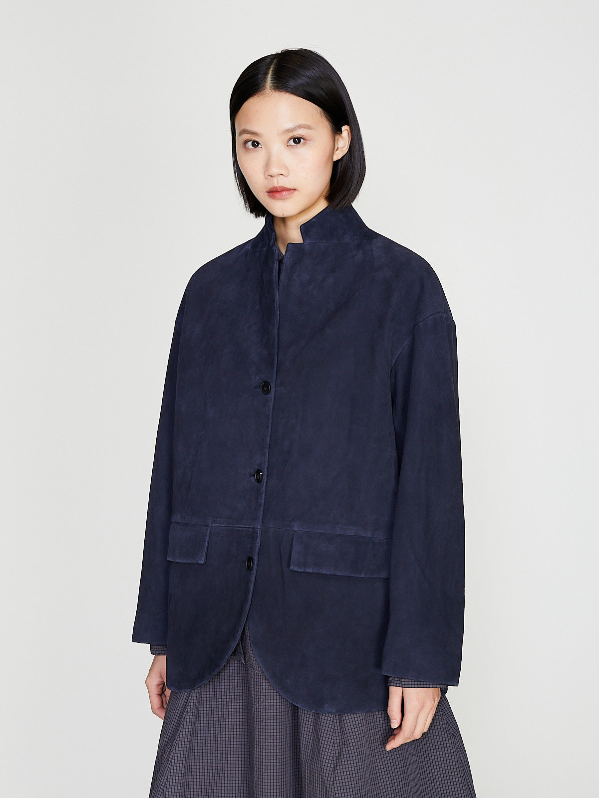 Classic blazer in navy suede leather. Convertible collar, front button fastening and long sleeves with a dropped shoulder. Flap pockets on the front. Tulip hemline. Relaxed fit.