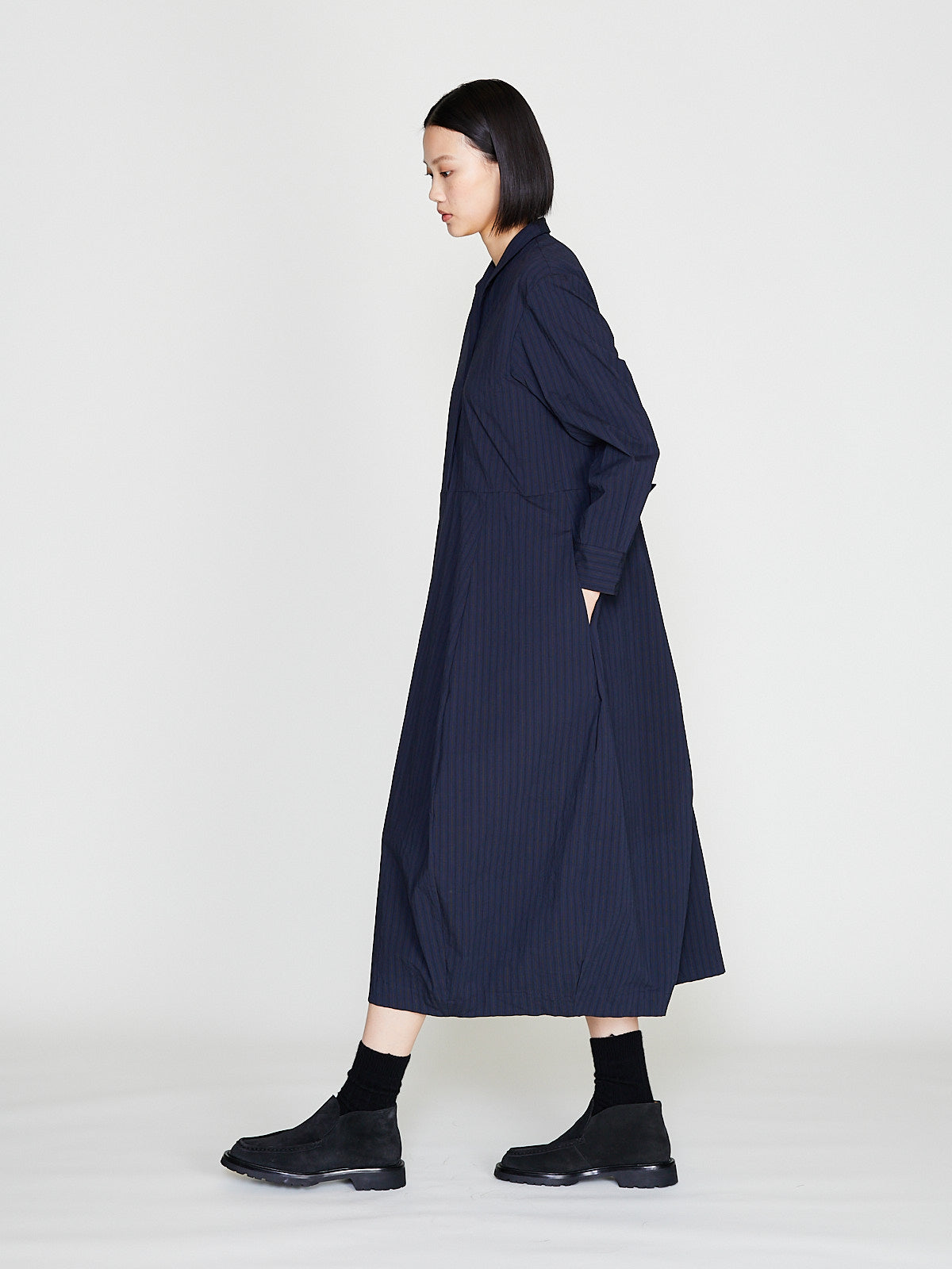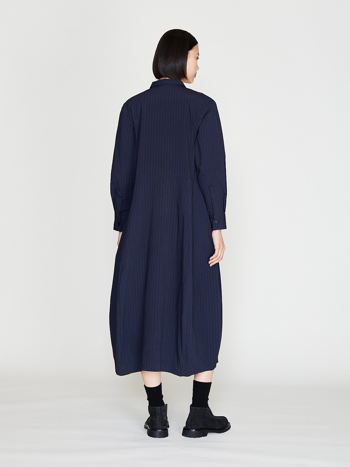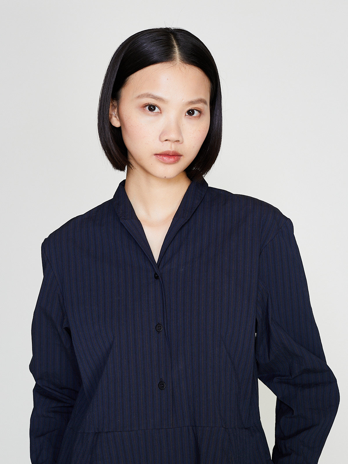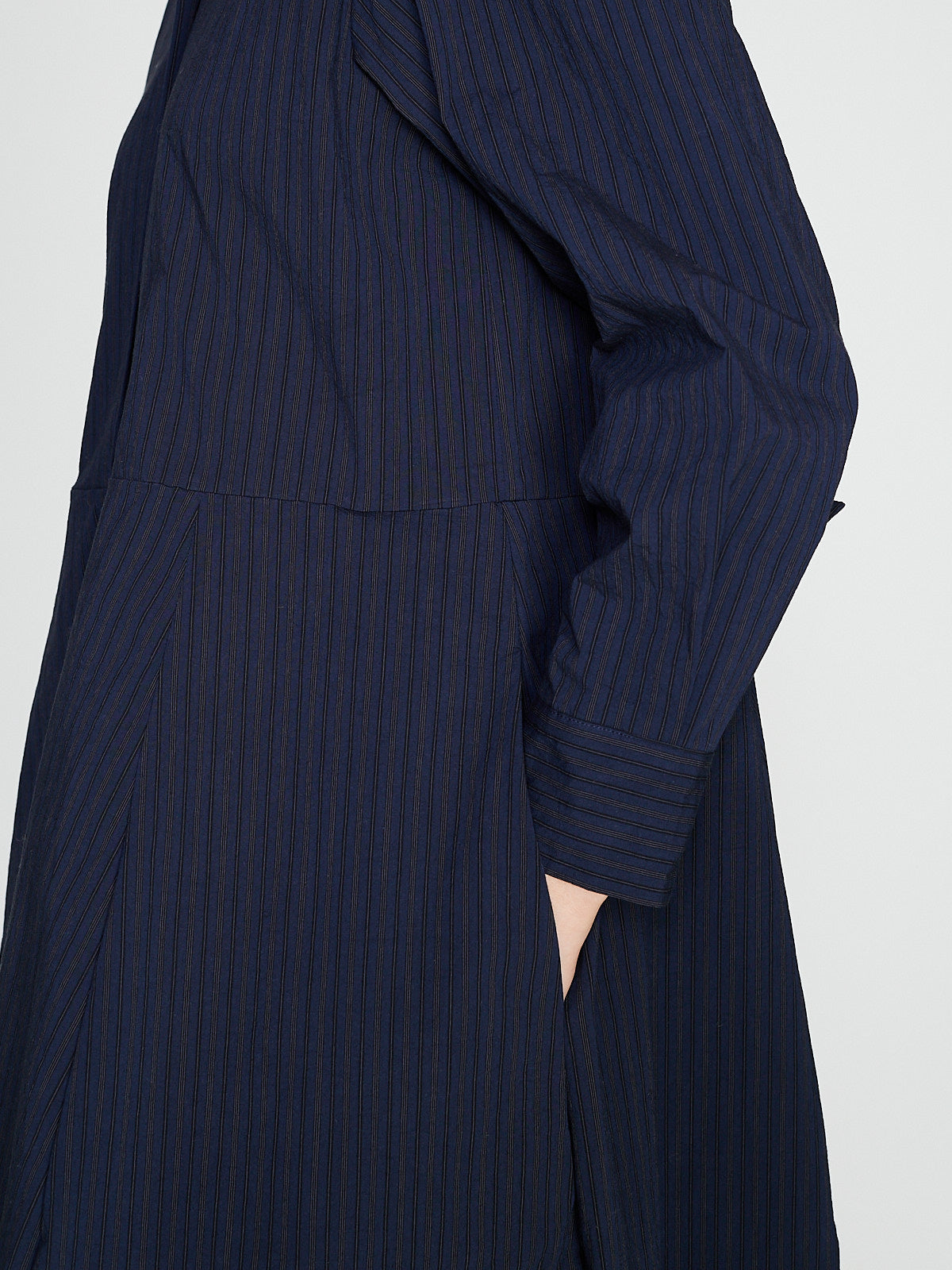 Relaxed dress in a striped navy cotton blend with subtle stretch. Convertible collar, v-neckline and partial front button fastening. Cropped dolman sleeves with buttoned cuffs and side seam pockets. Subtle balloon skirt.