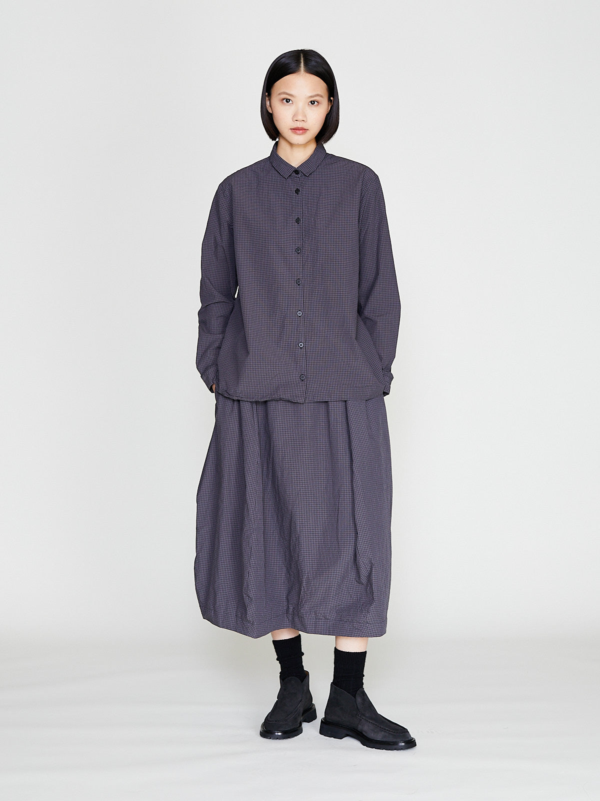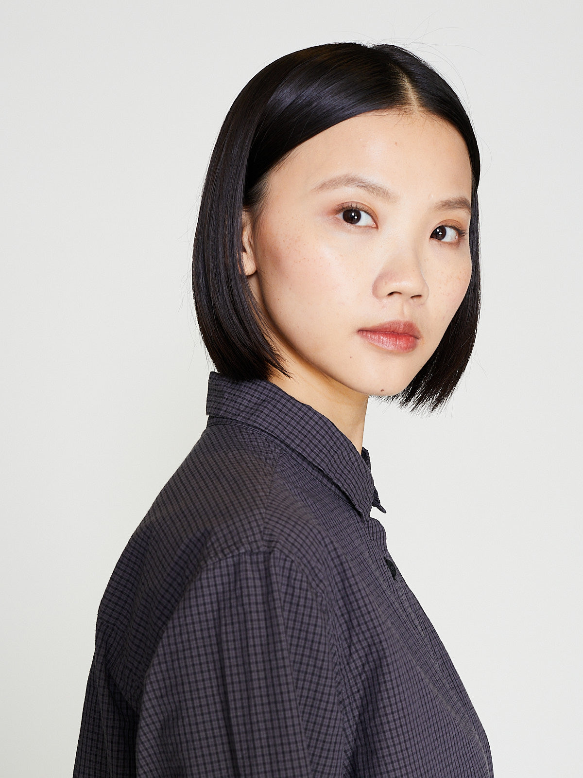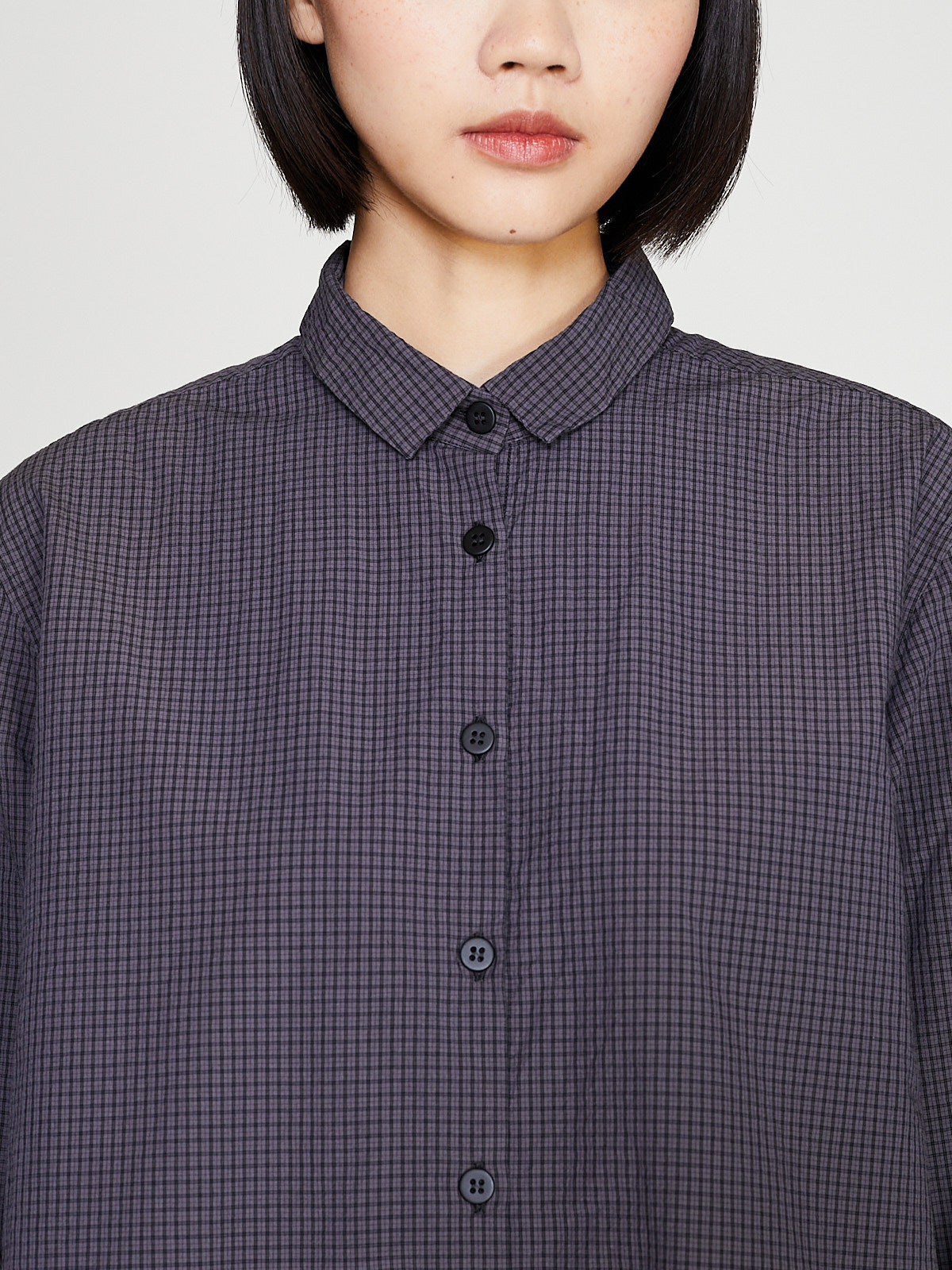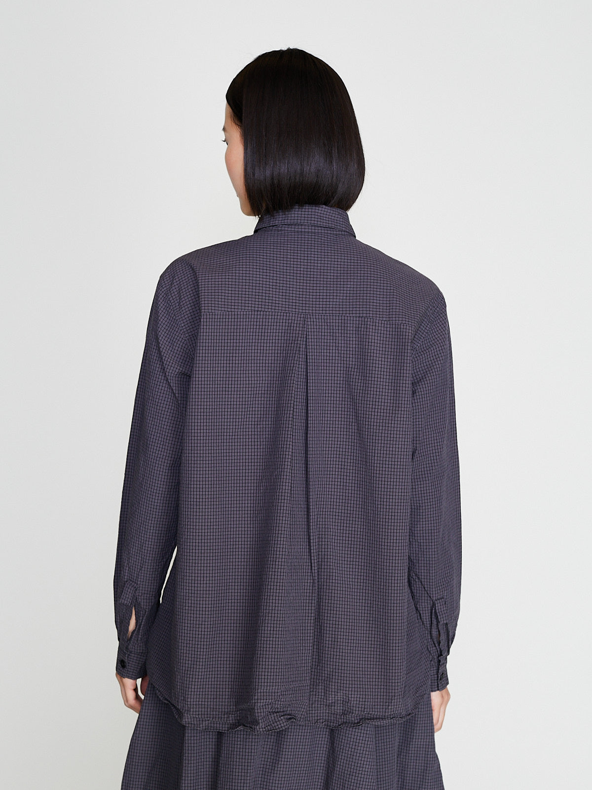 Relaxed classic shirt in checked grey cotton. Small shirt collar, front button fastening and buttoned cuffs. Features a back yoke with a pleat detail and a curved hemline. Boxy fit.