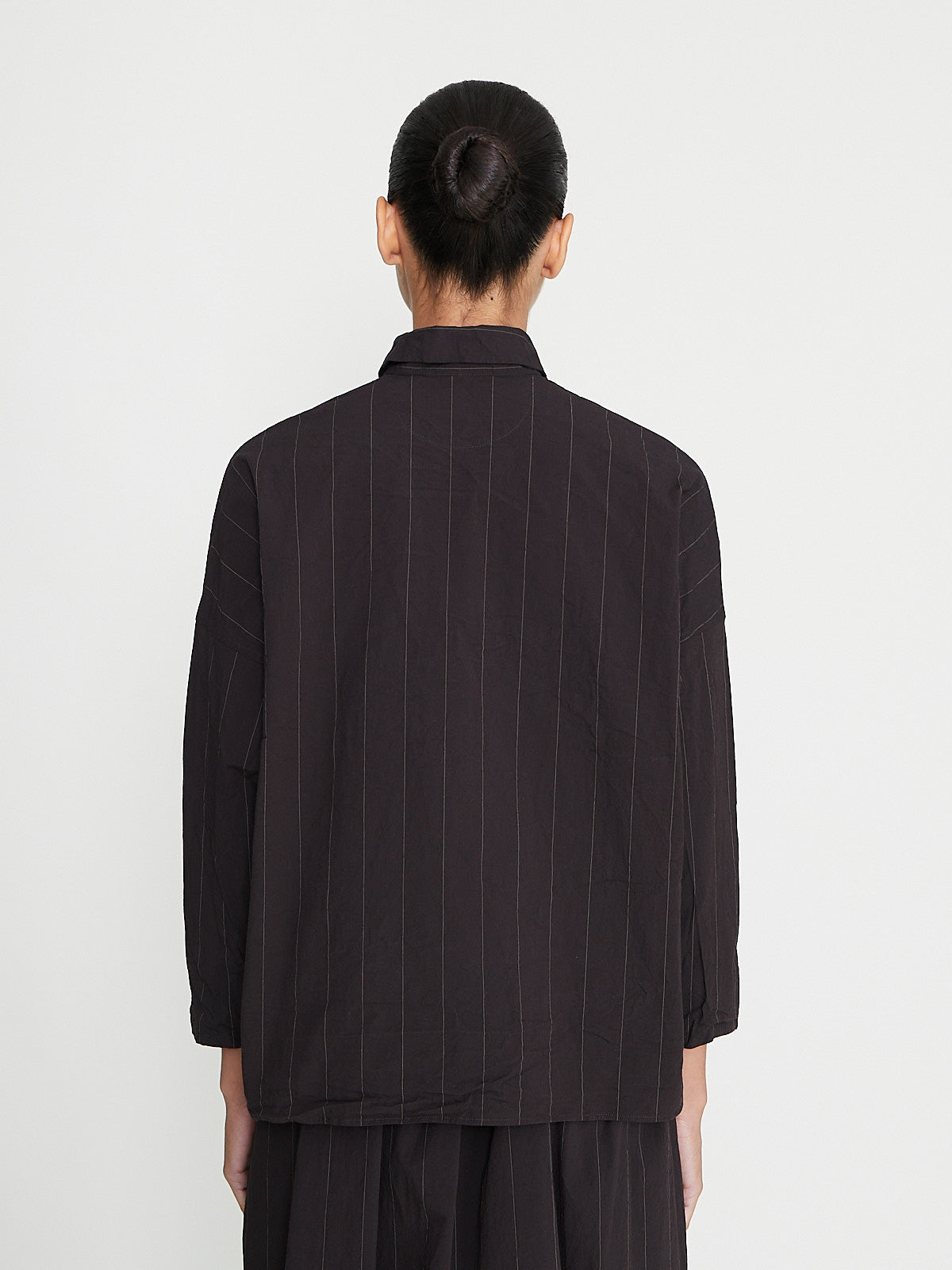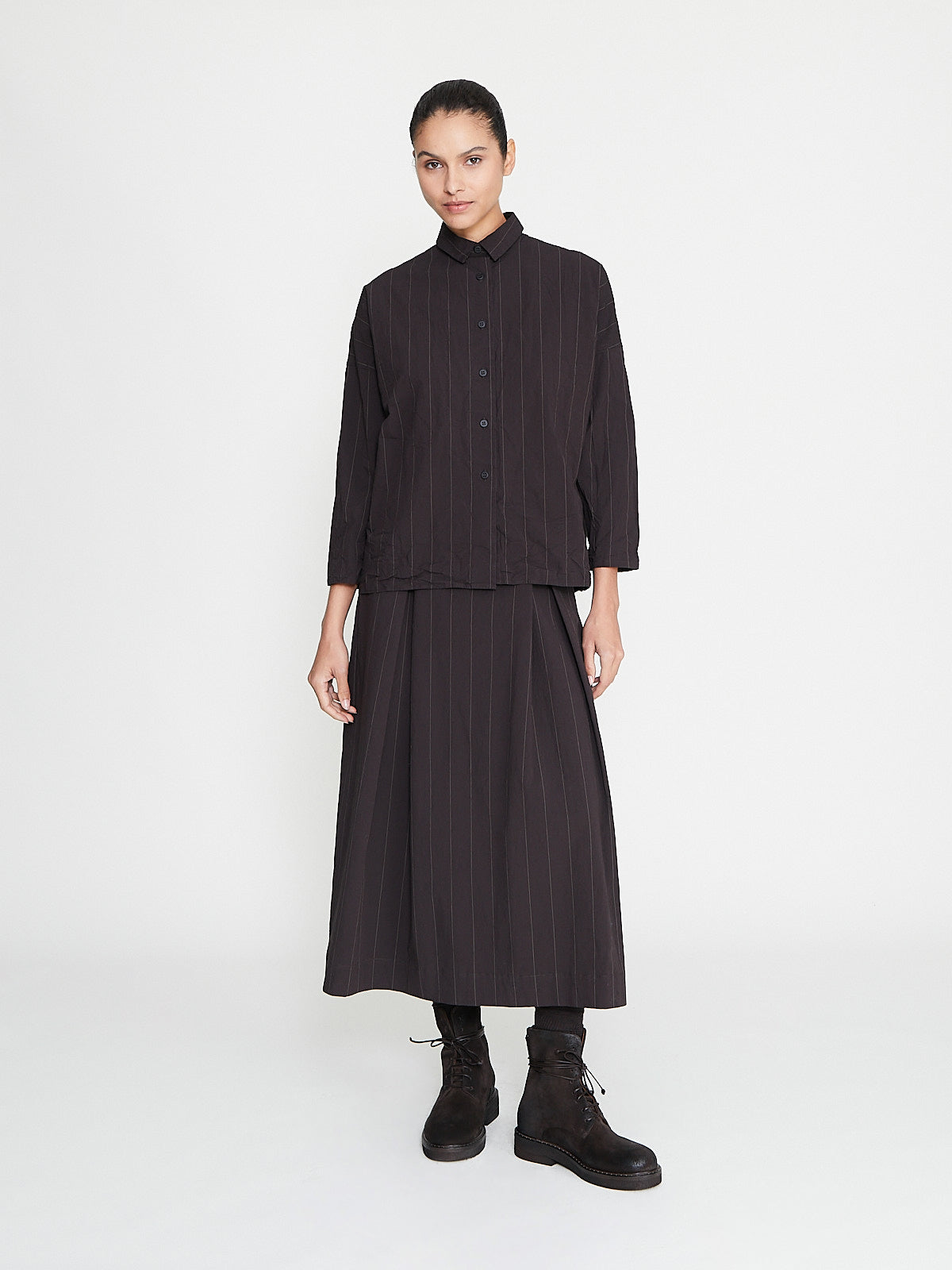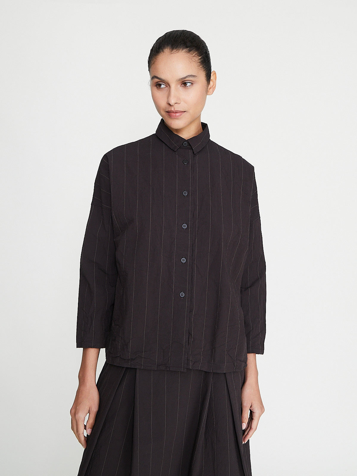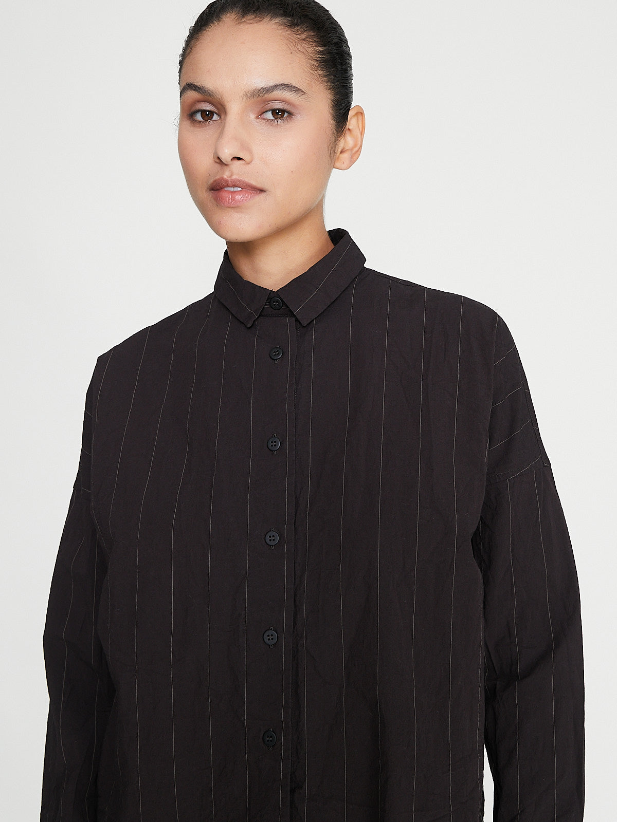 Boxy shirt in a stretchy dark burgundy cotton blend with a stripe design. Classic shirt collar, front button fastening and tapered bracelet sleeves with a dropped shoulder. Straight hemline.