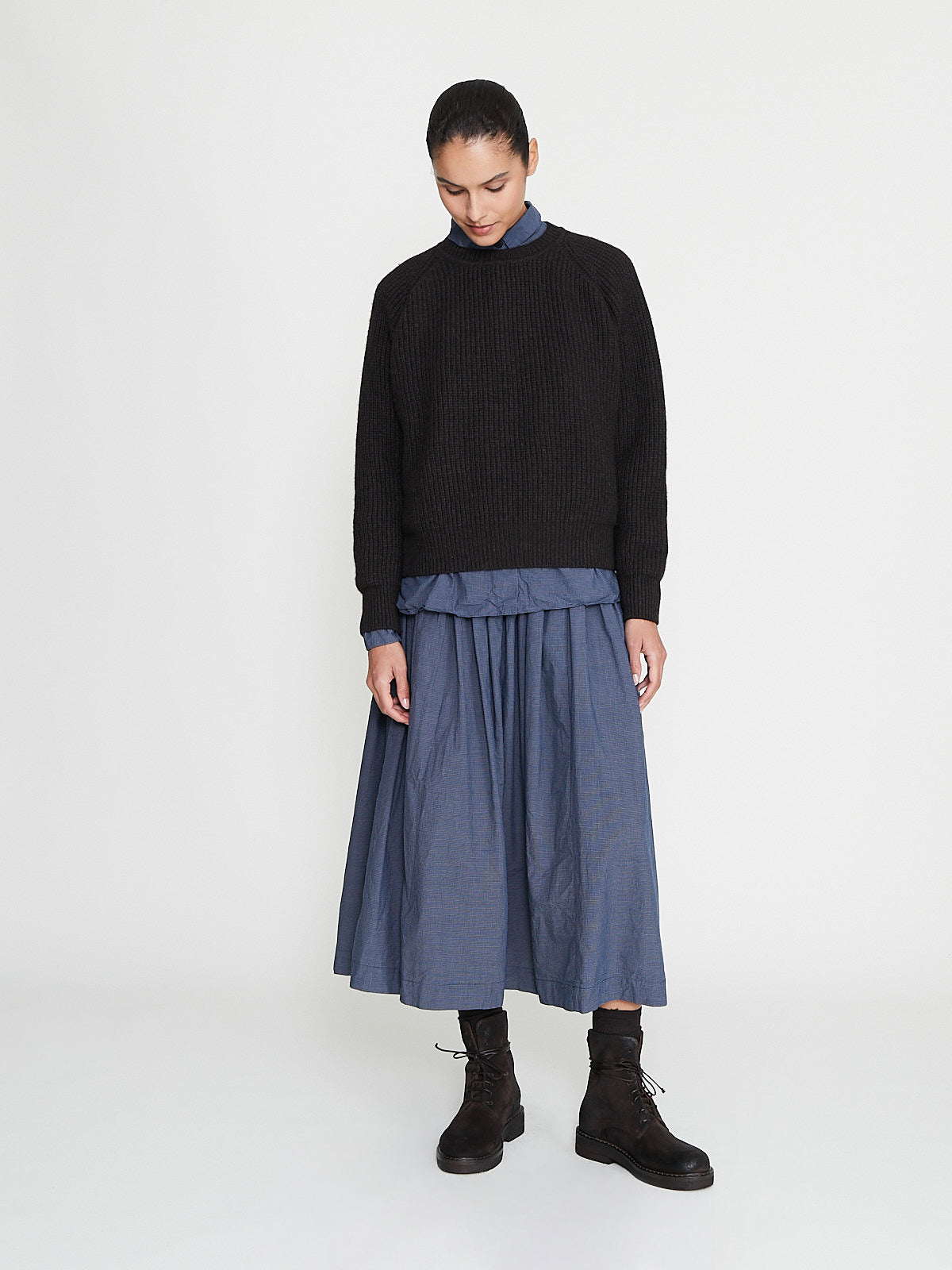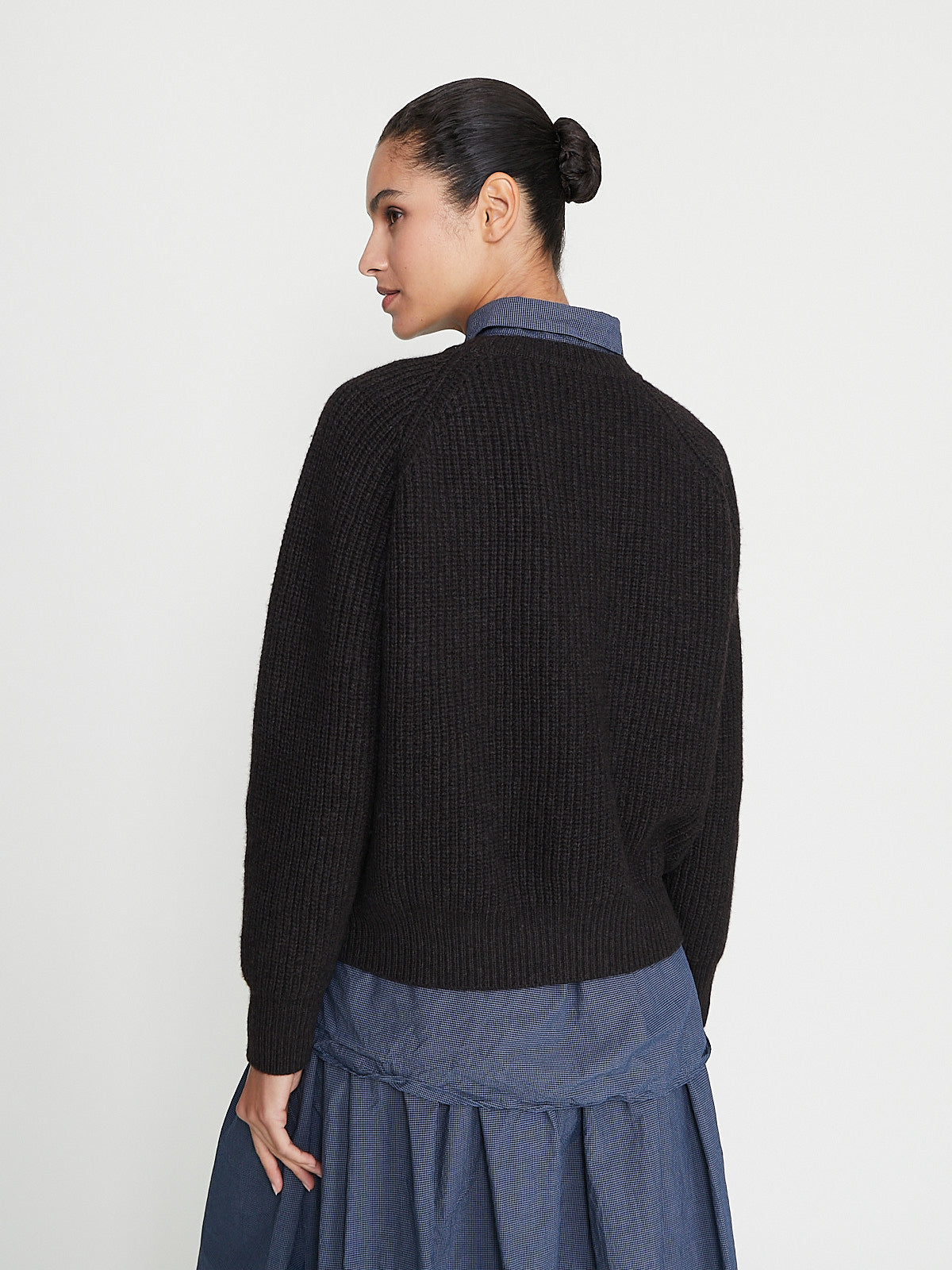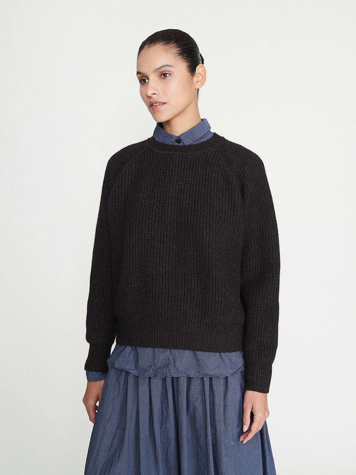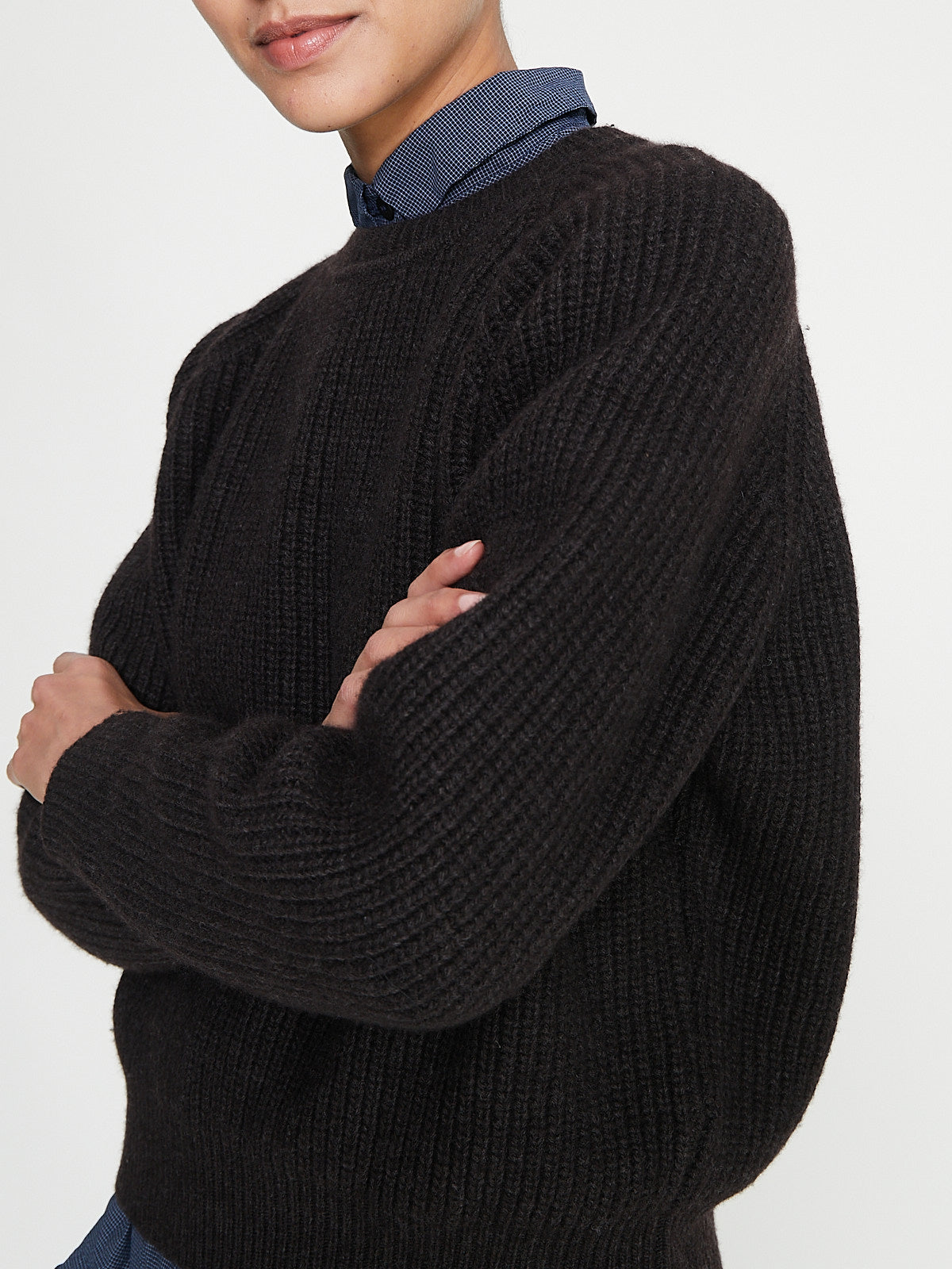 Classic rib-knit pullover sweater in dark brown lightweight wool/cashmere. Crewneck and long sleeves with a dropped shoulder. Ribbed trim around the neck, cuffs and bottom hem. Relaxed fit.