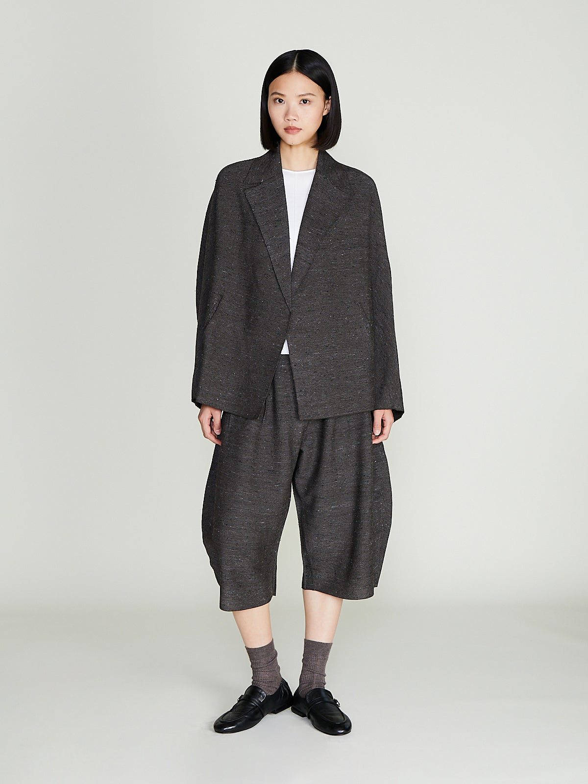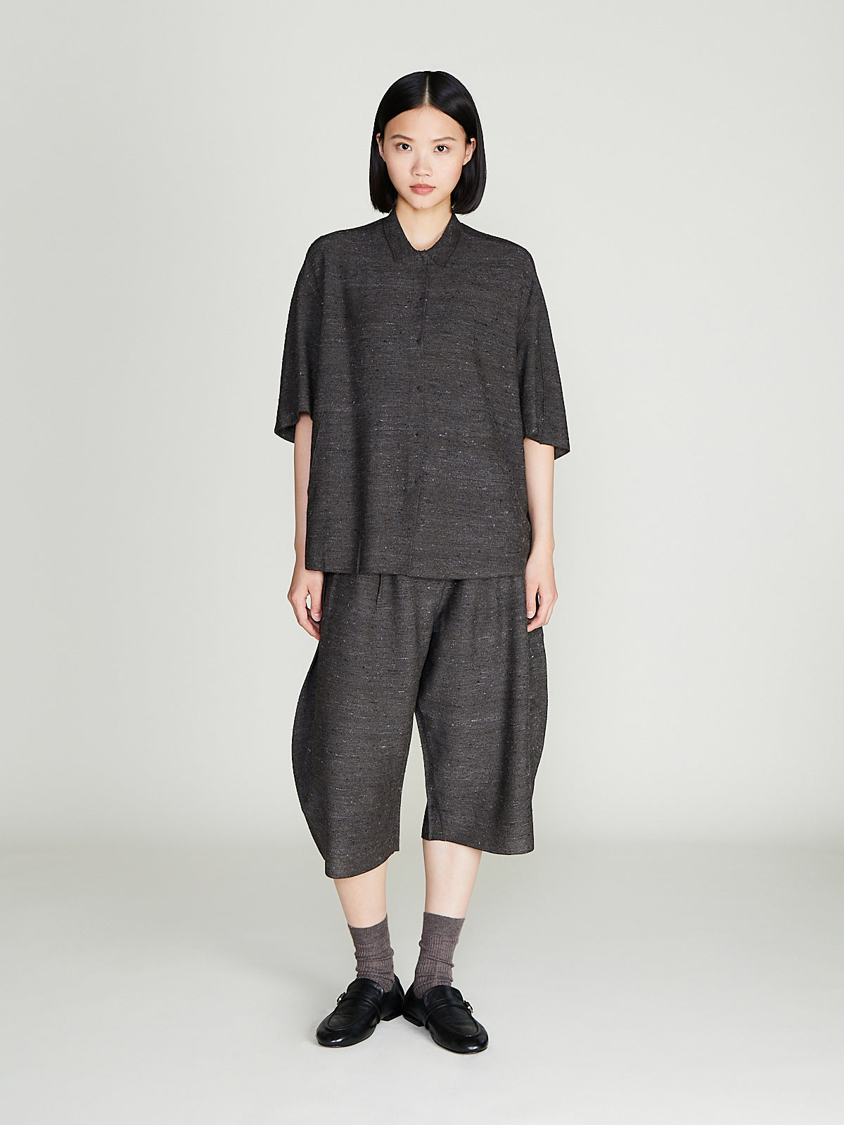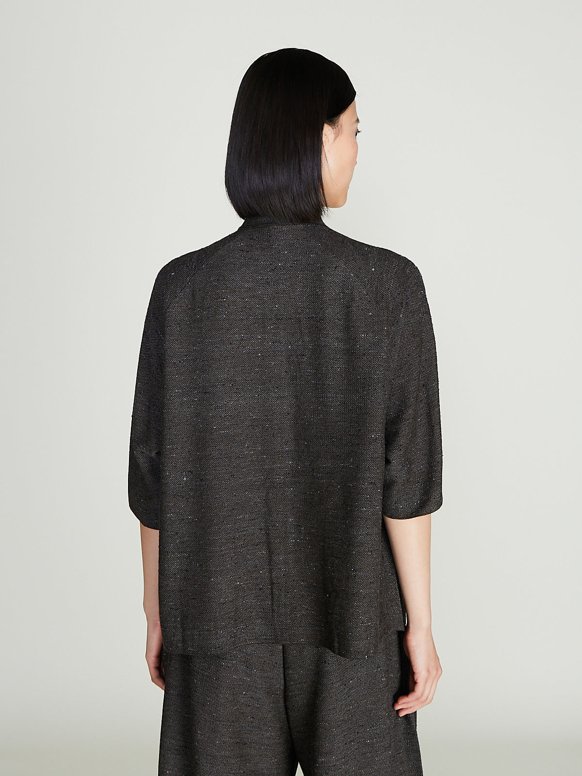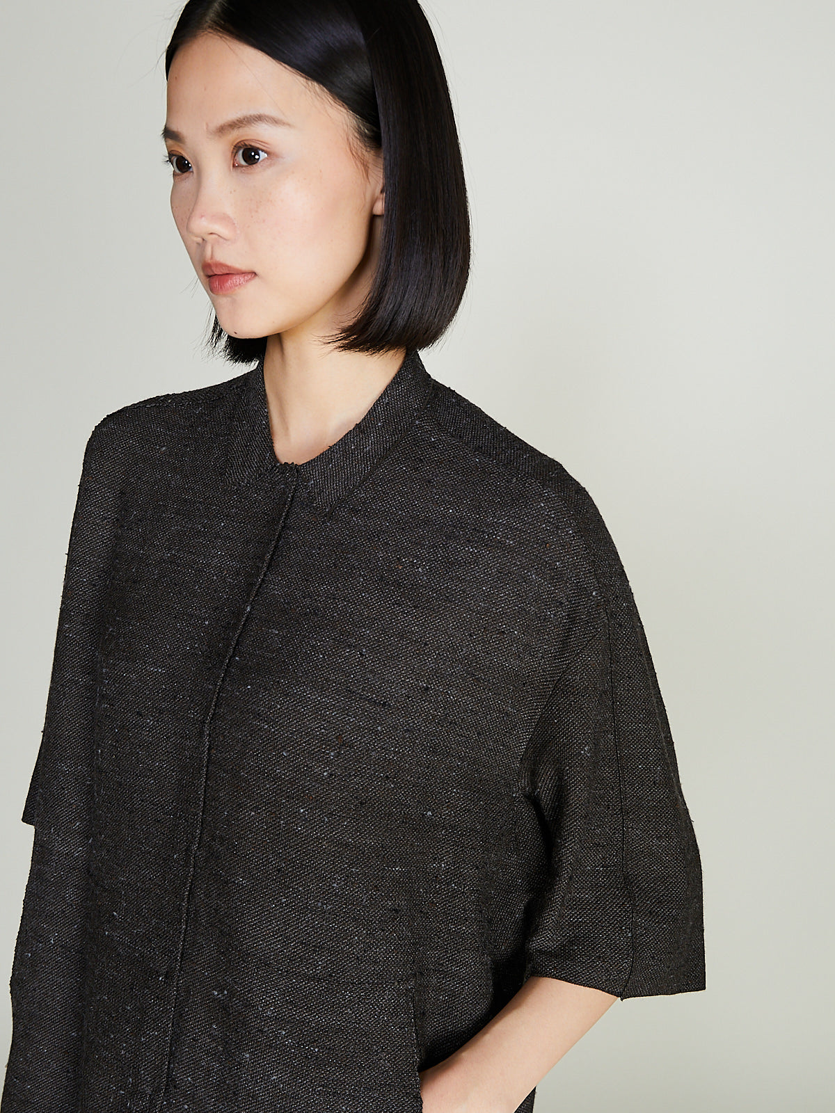 Oversized shirt in textured grey silk/cotton with hues of blues and brown. Small shirt collar, concealed front button fastening and elbow-length half raglan sleeves. Slip pockets on the front.