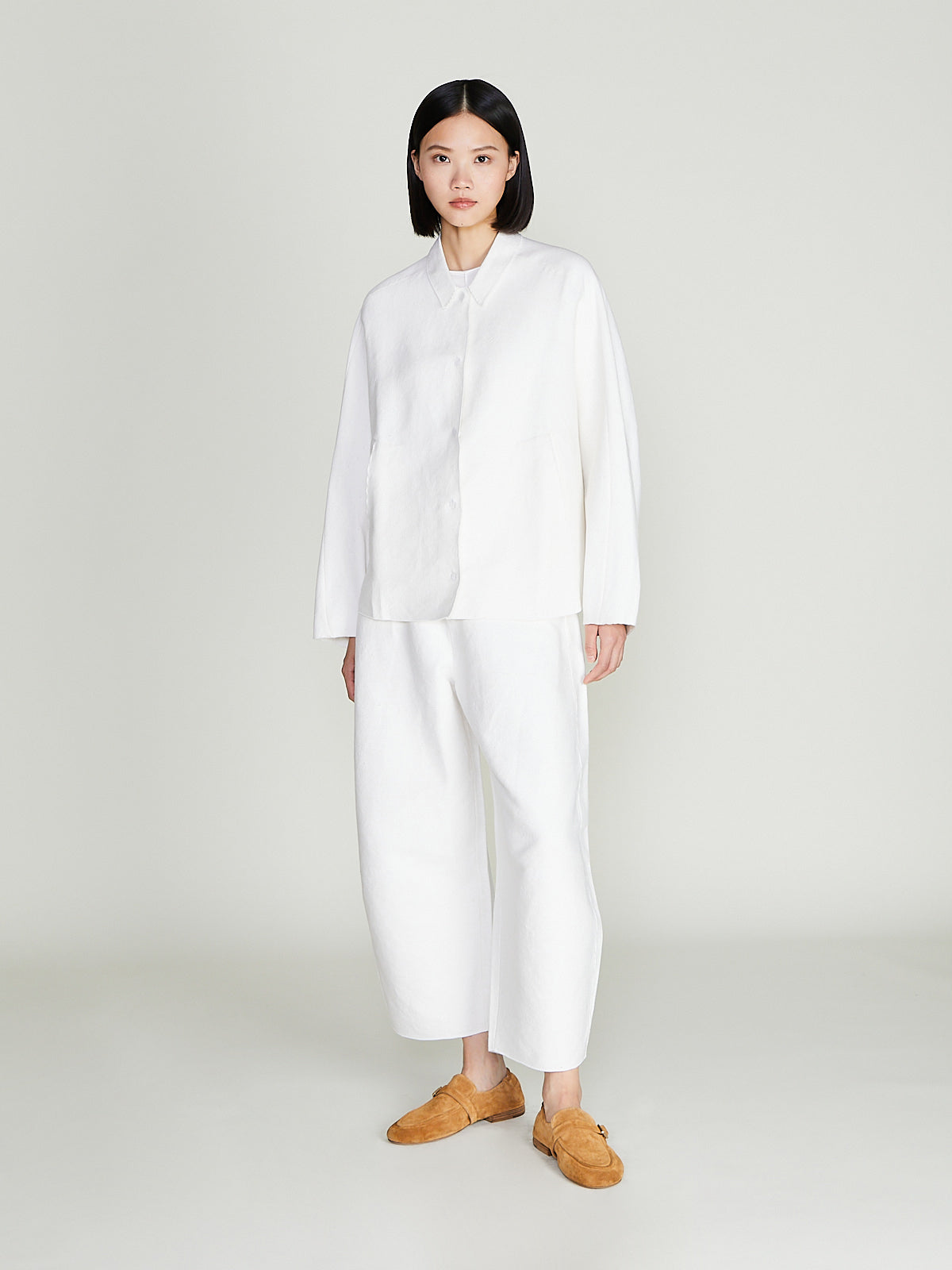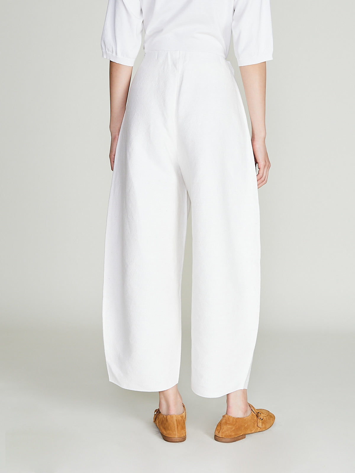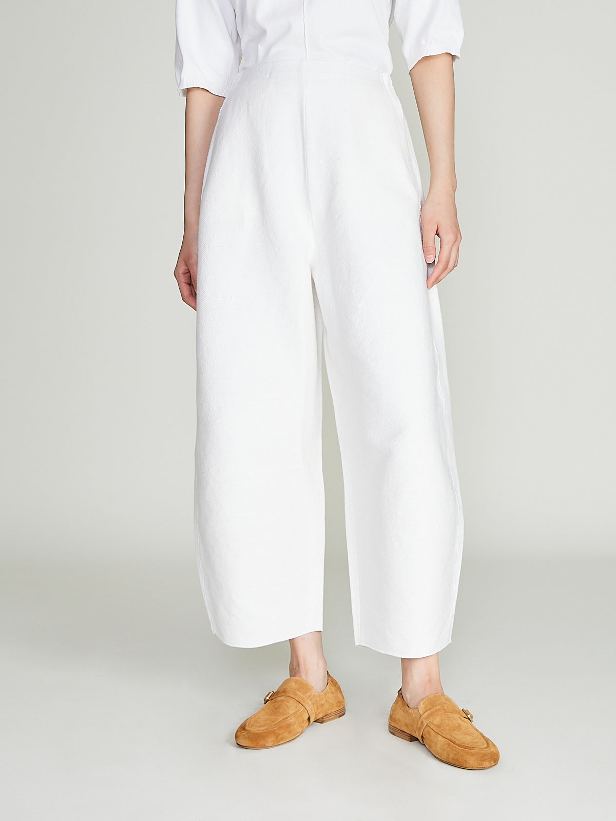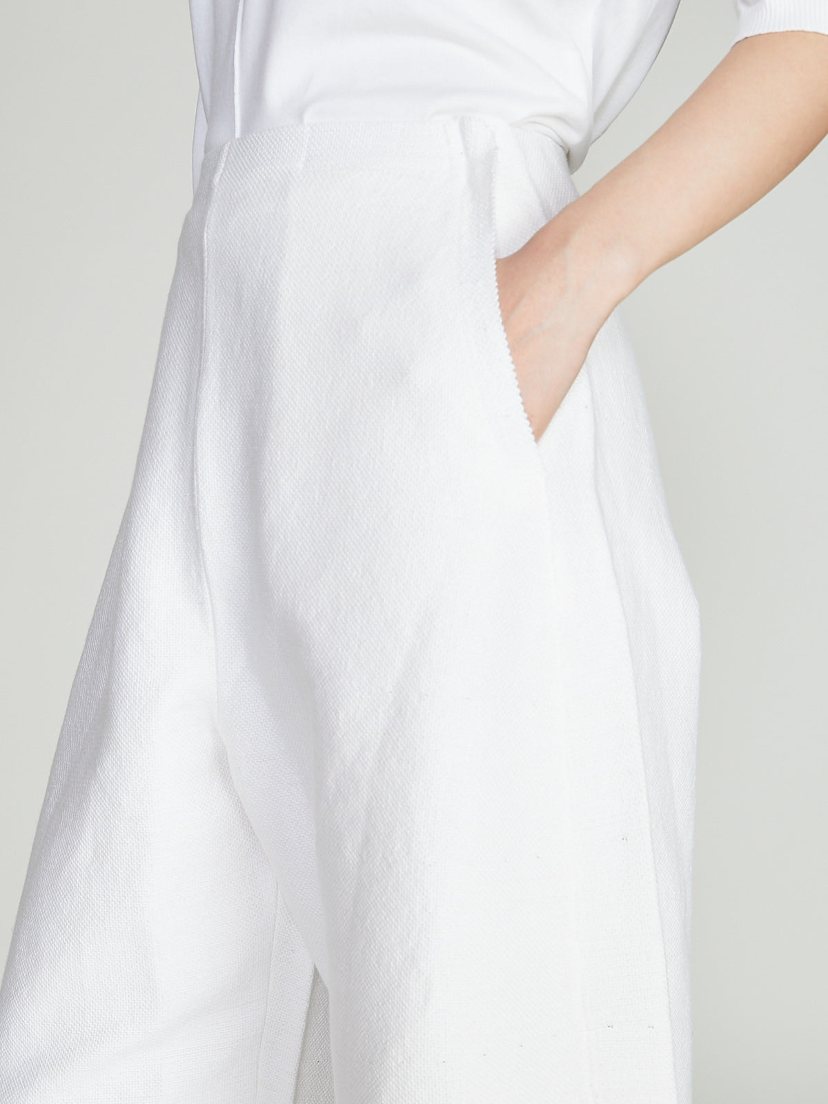 Oversized trouser in white textured cotton/linen blend. Concealed zip fastening on the side of the waist and side seam pockets. Subtle barrell leg.