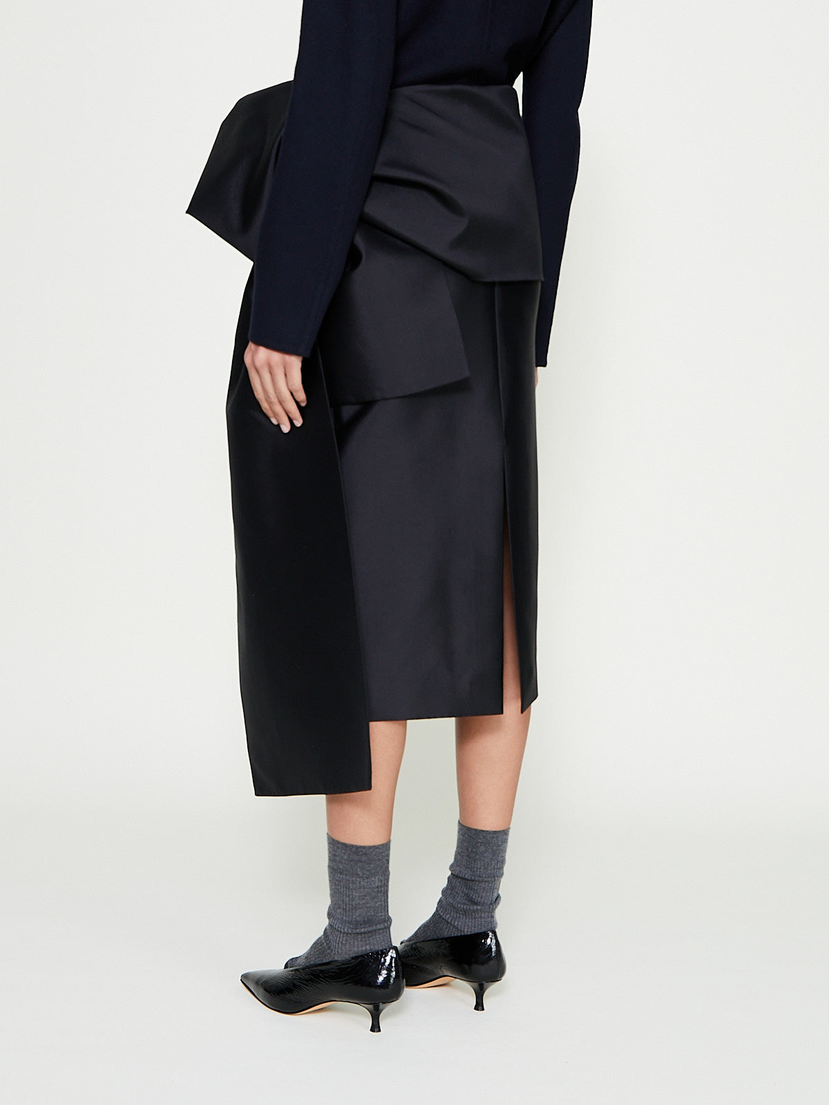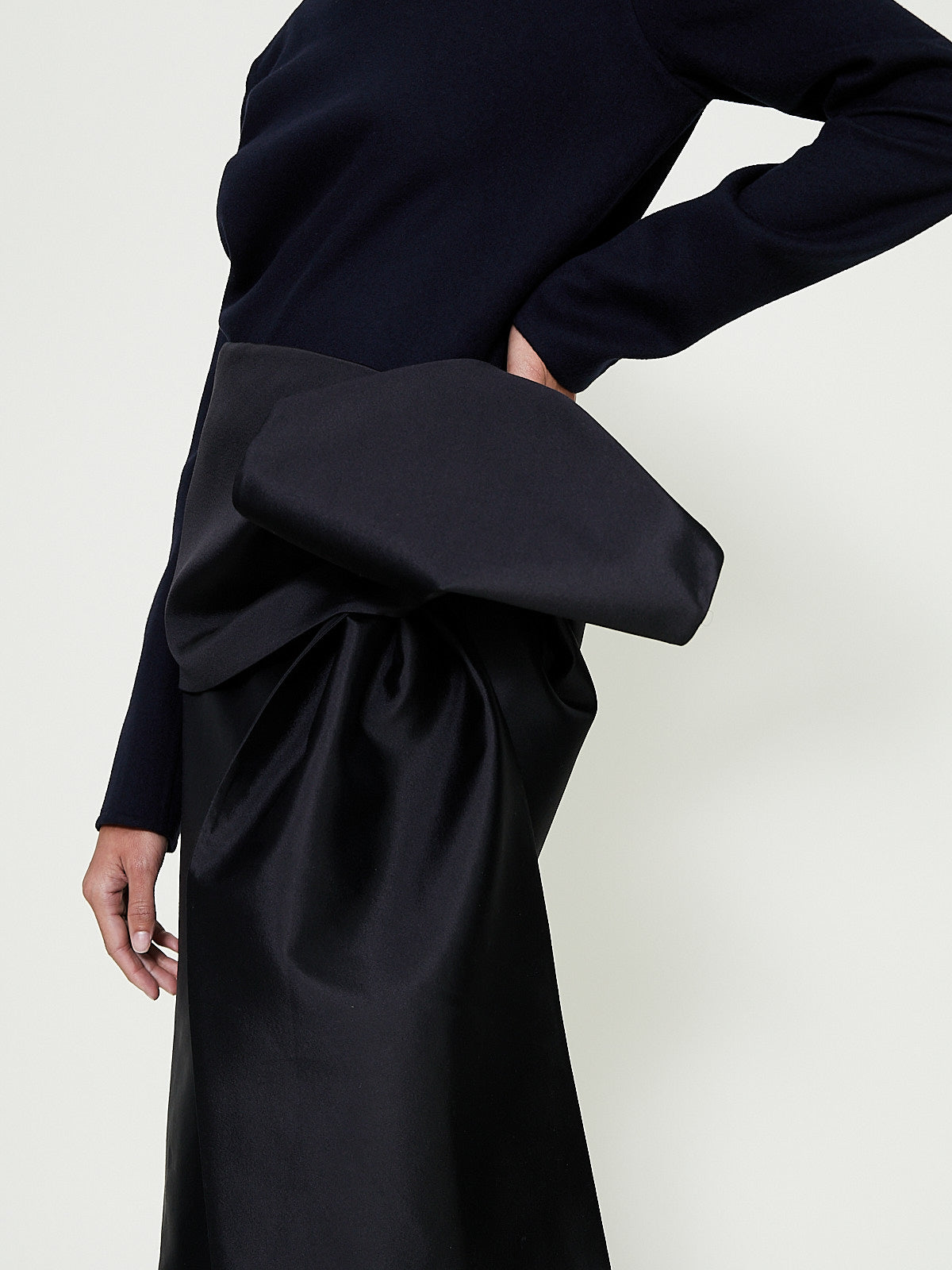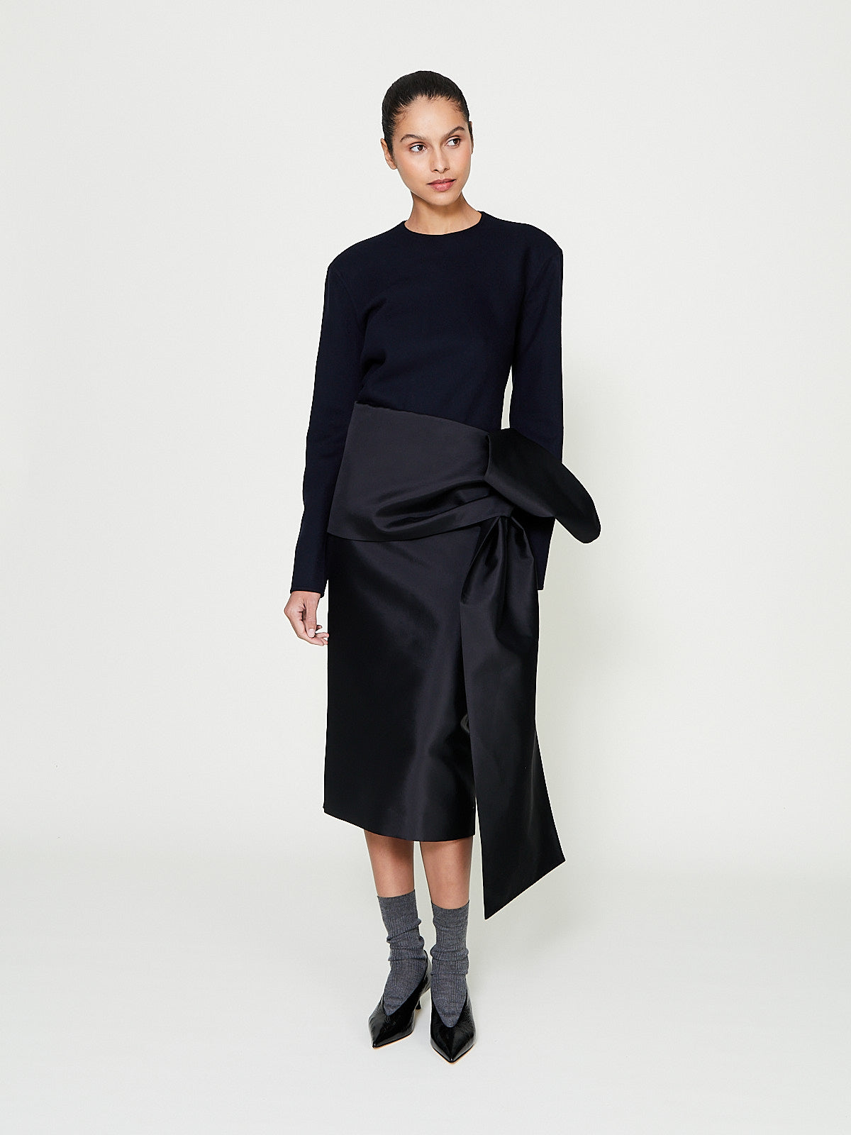 Voluminous skirt in black silk/wool couture. Concealed zip fastening and a back vent. Features a sash waistband which ties in a long bow at the side. Cuts below the knee. Unlined.