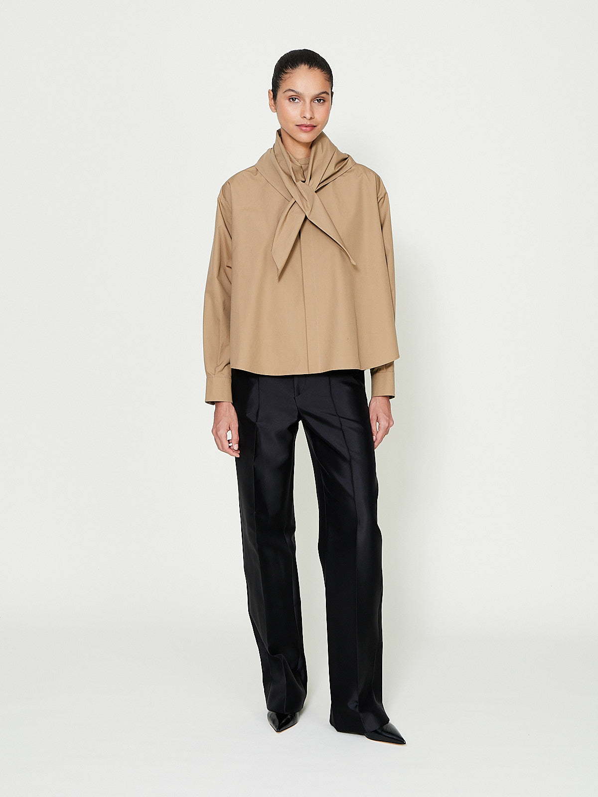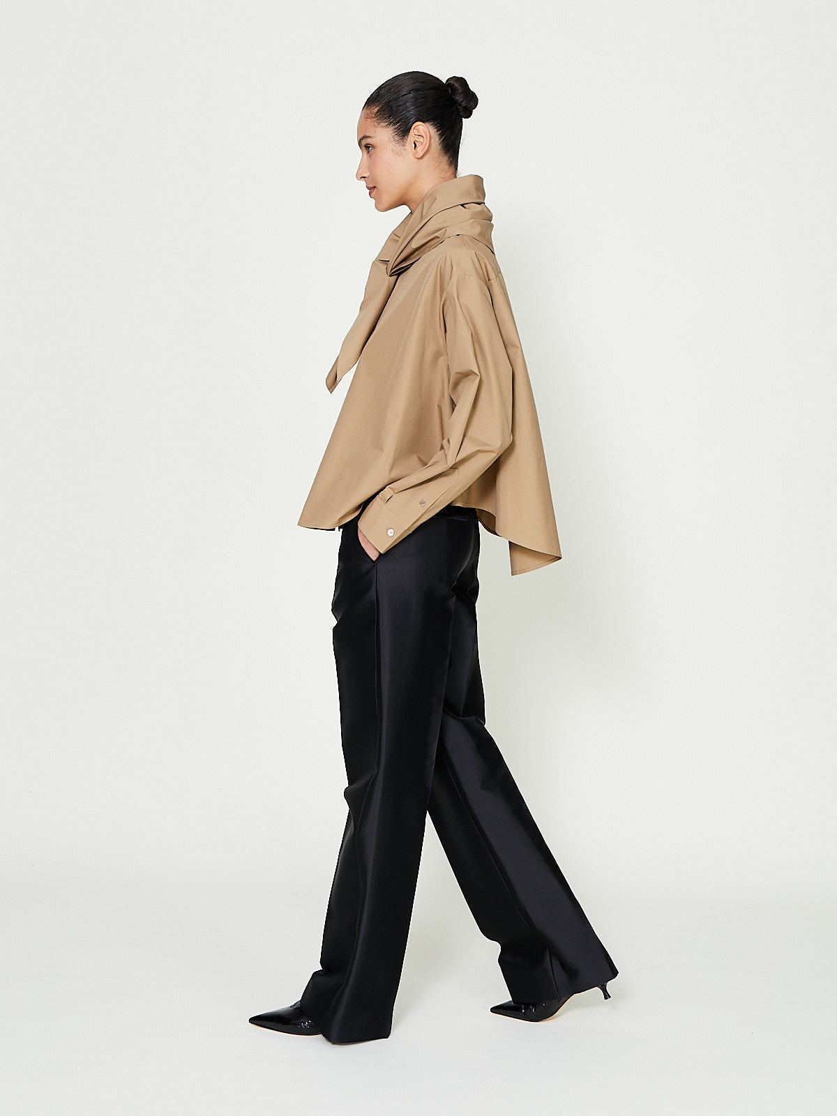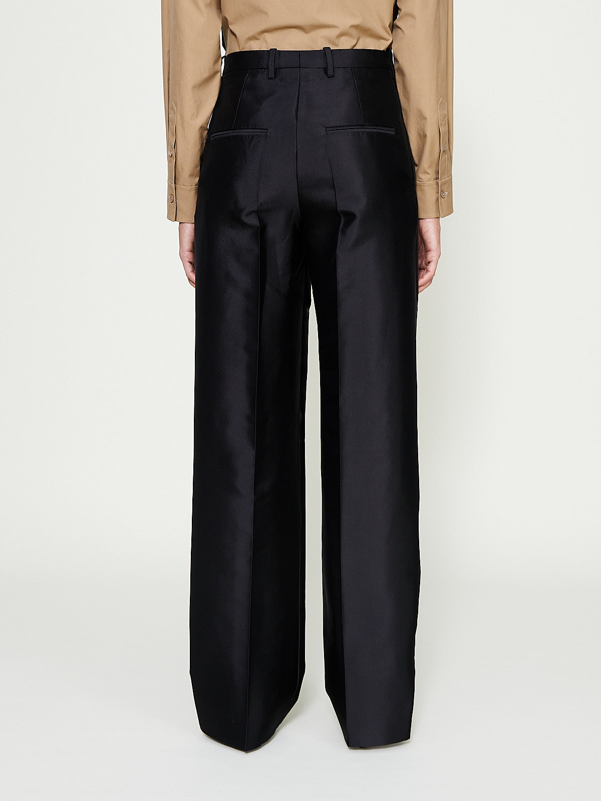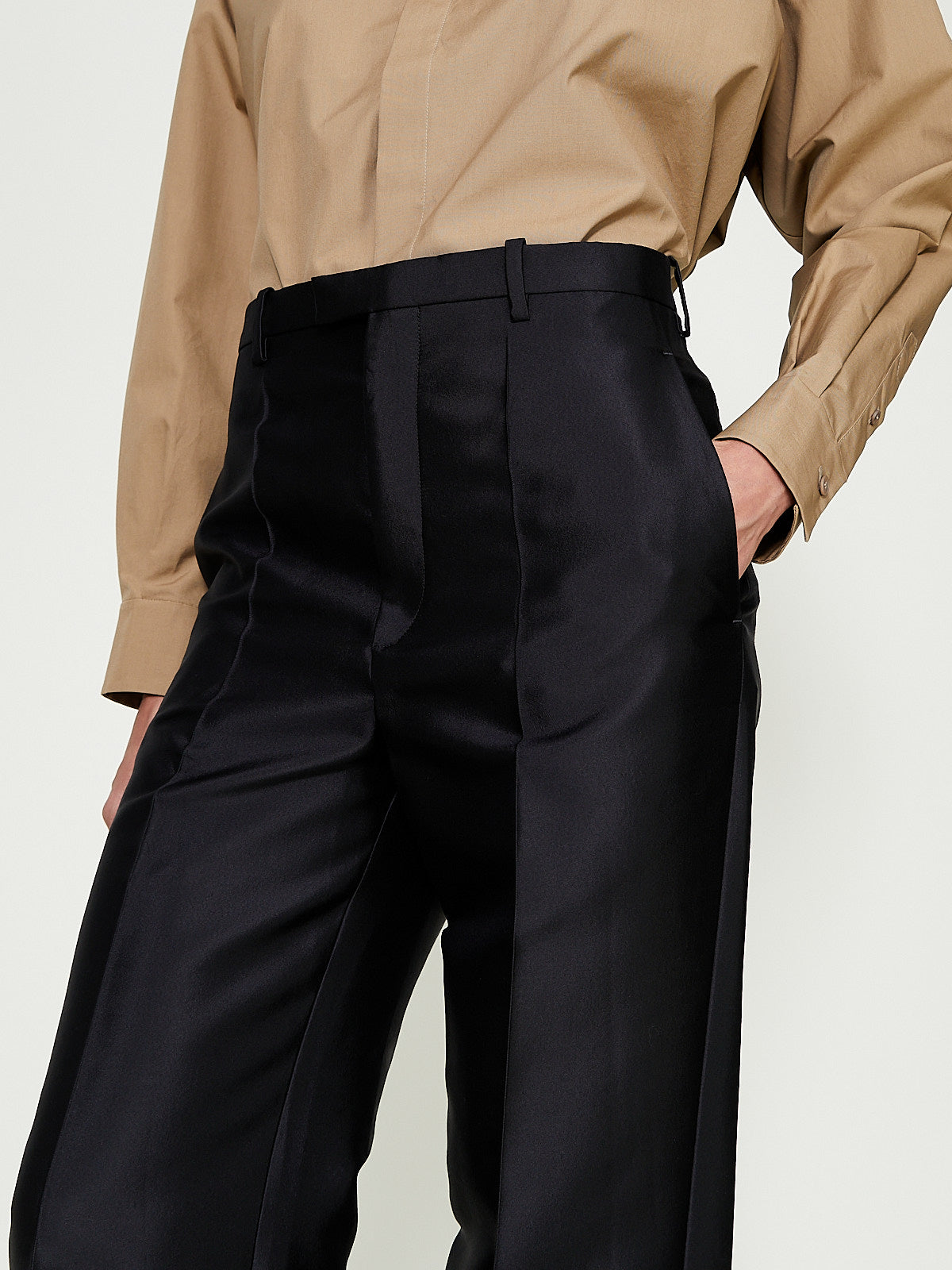 Straight leg trousers in black silk wool couture. Flat fronted with belt loops, a masculine cotton waistband construction and a metal hook and bar closure with horn stay button. Side seam pockets and welted pockets at the back. Features a pressed leg crease.