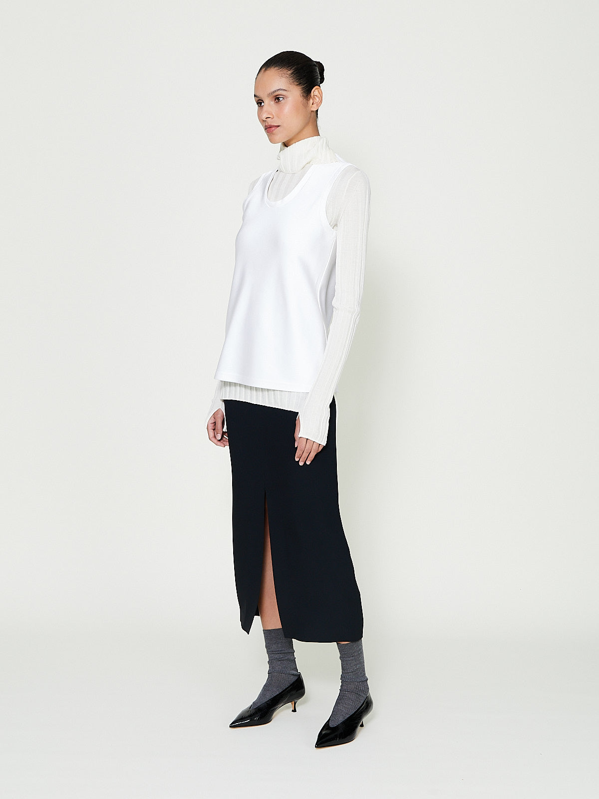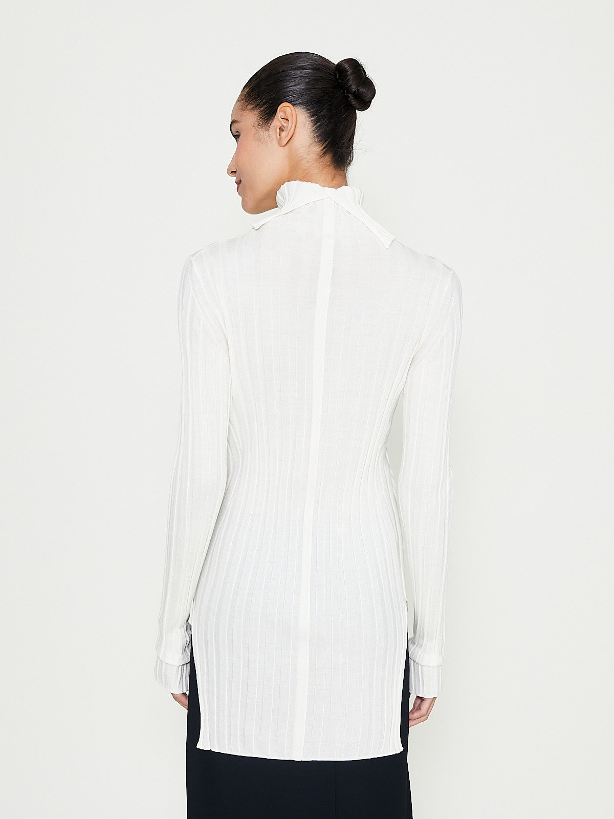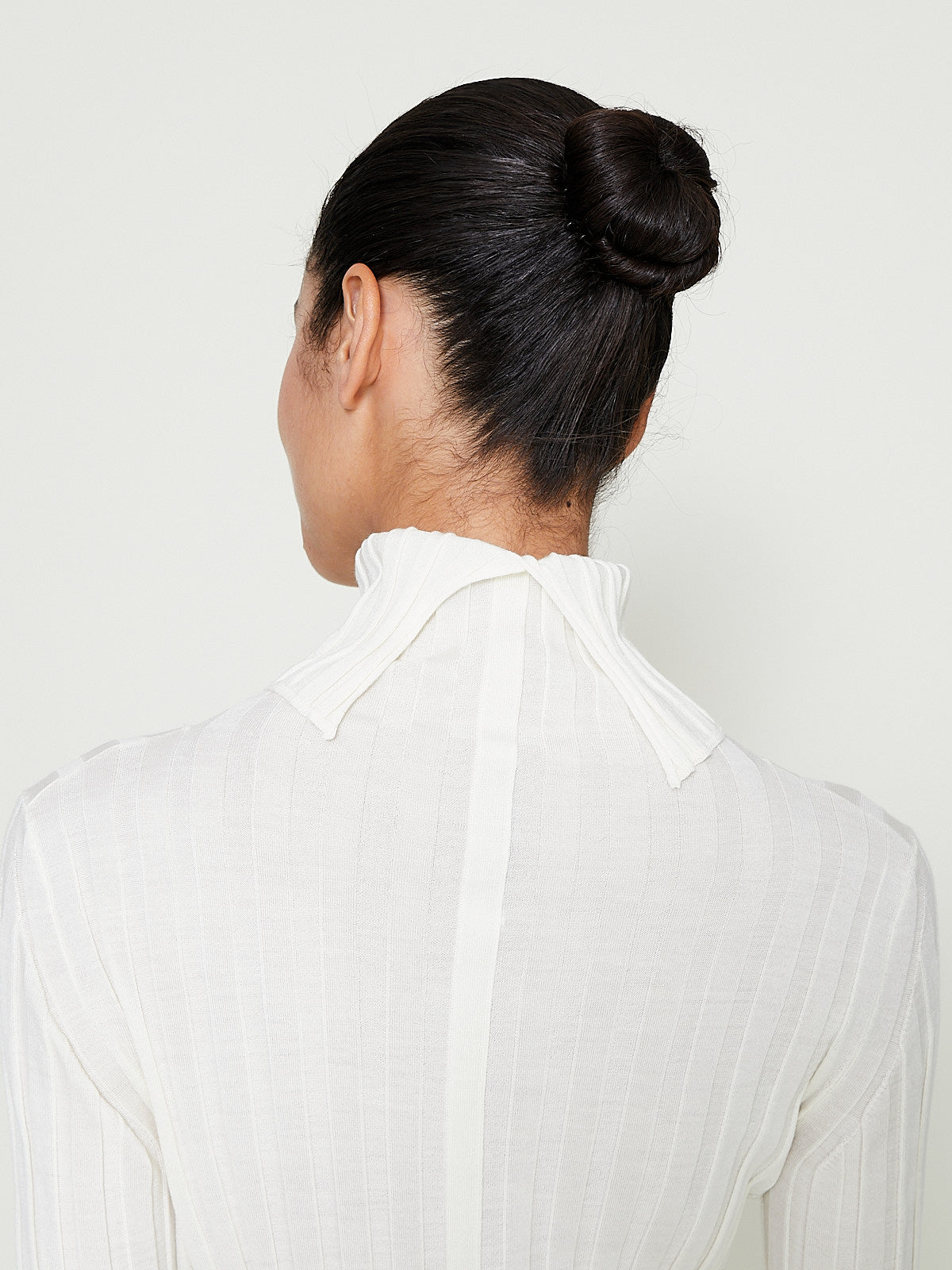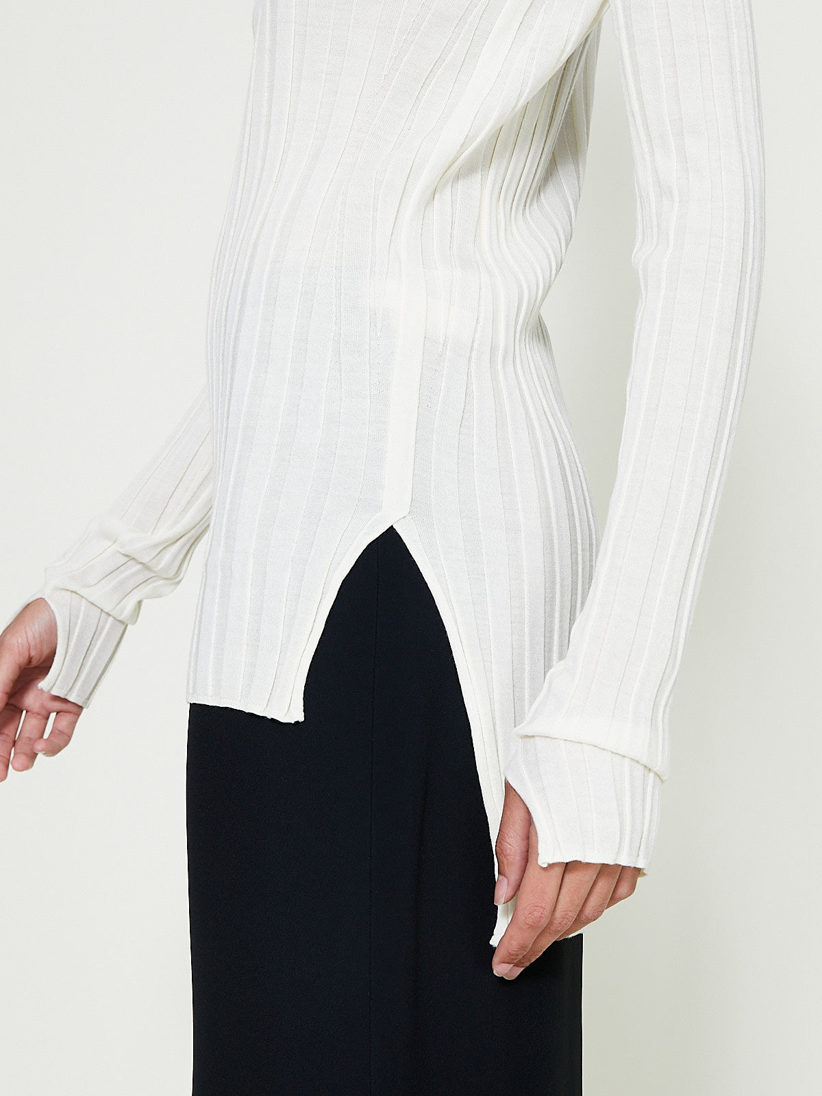 Turtleneck jumper in ecru rib-knit Merino wool/silk blend. Square neckline that has a small slit at the back. Features slits on the cuffs and at the back. Slim fit. Ideal to be worn as an underpinning.