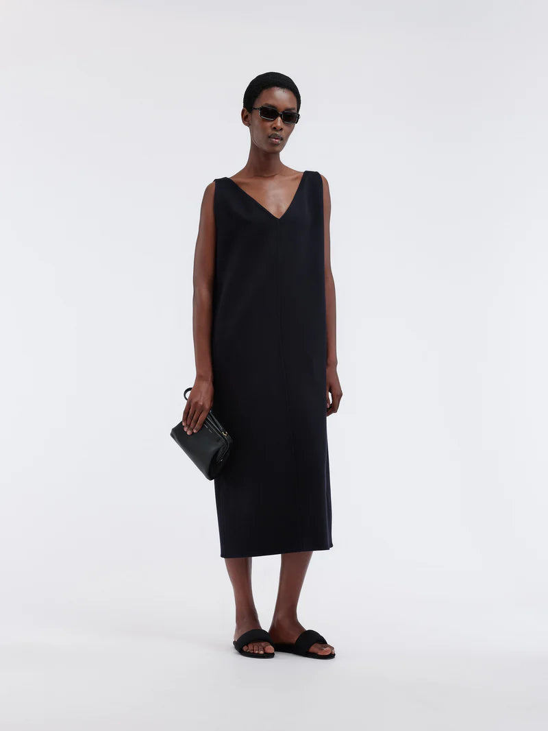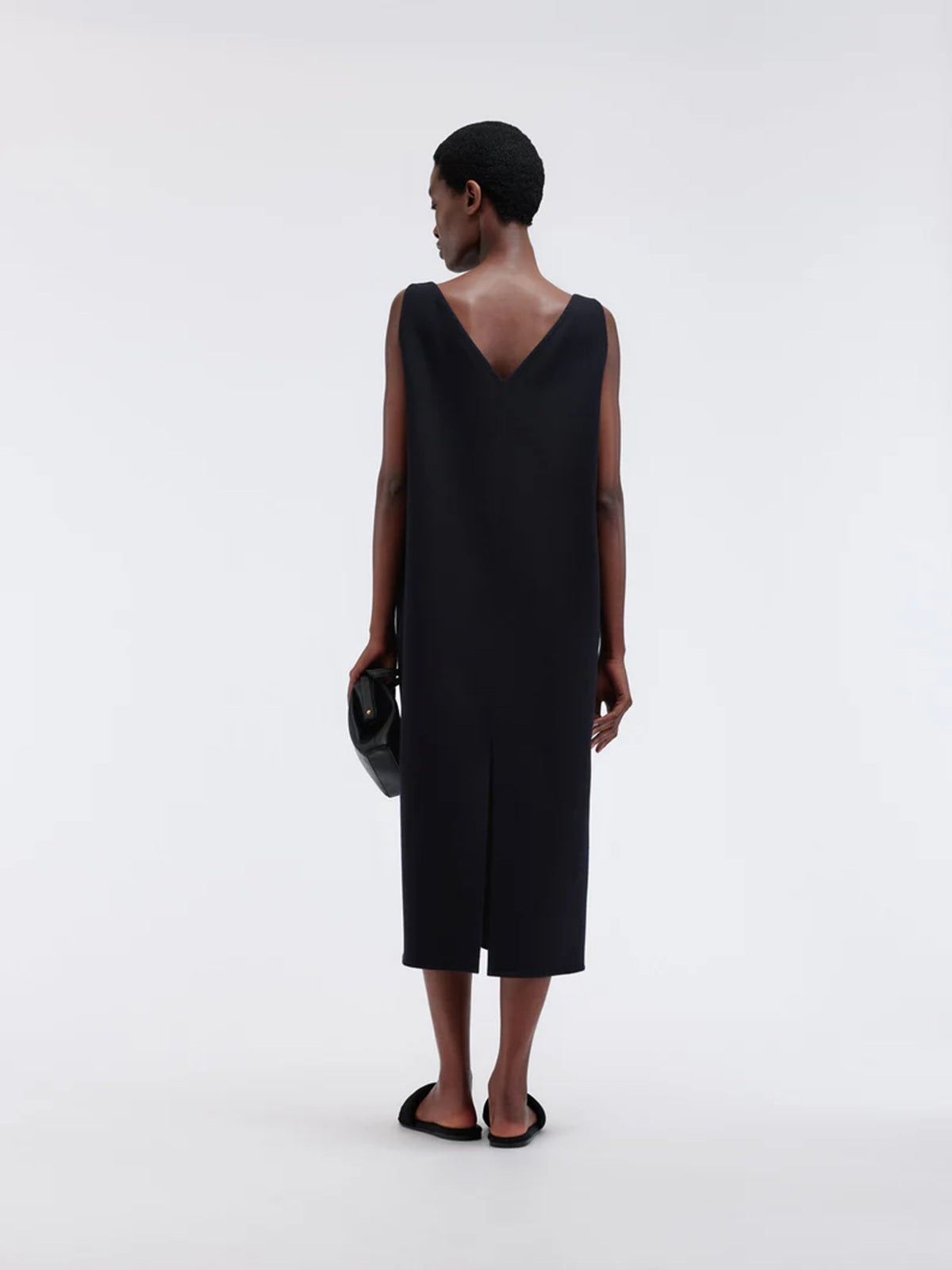 Straight dress in a double-faced navy wool blend. Sleeveless and deep v-neck on the front and back. Side seam pockets and a back vent. Mid-calf length. Unlined.
