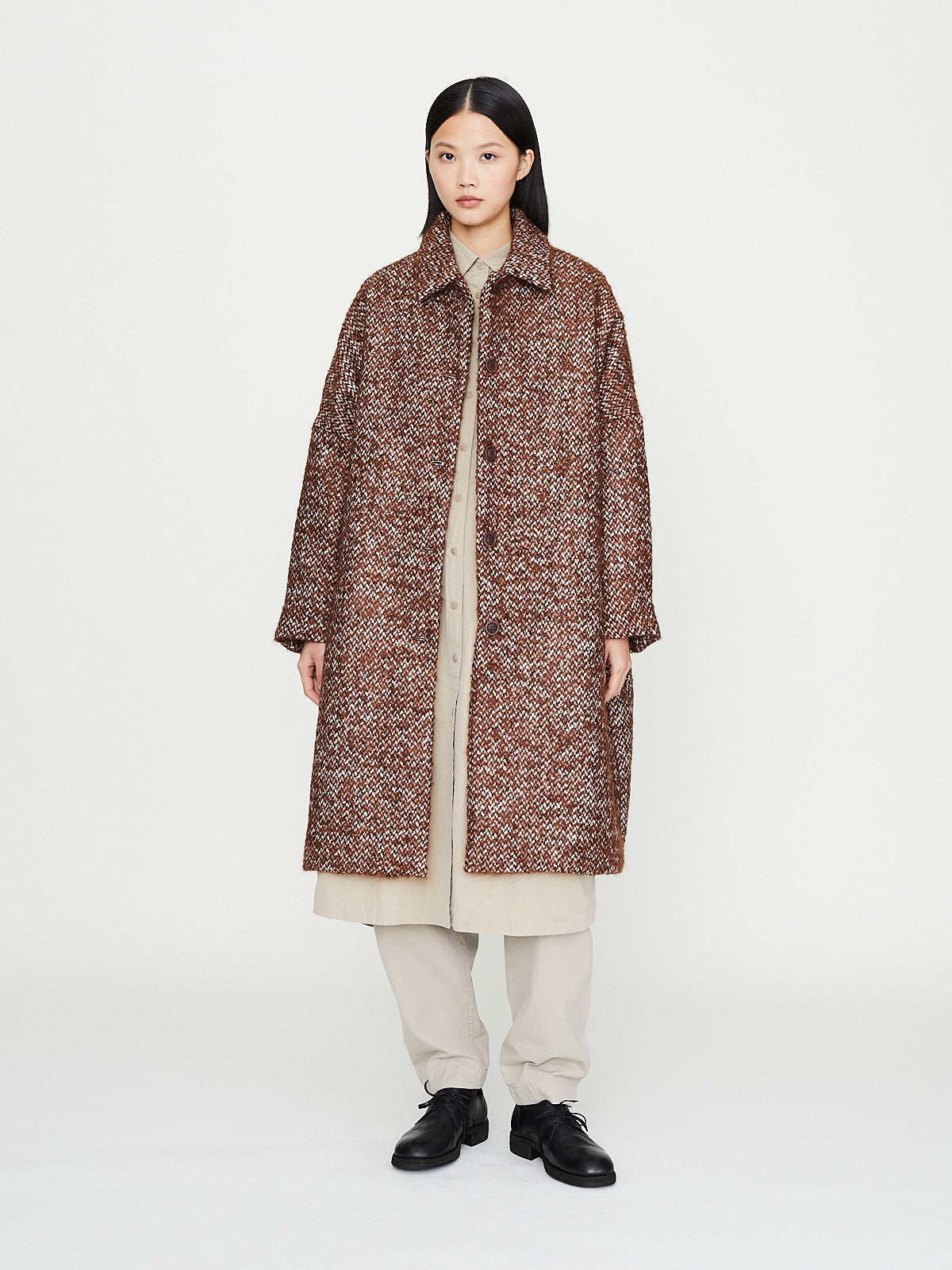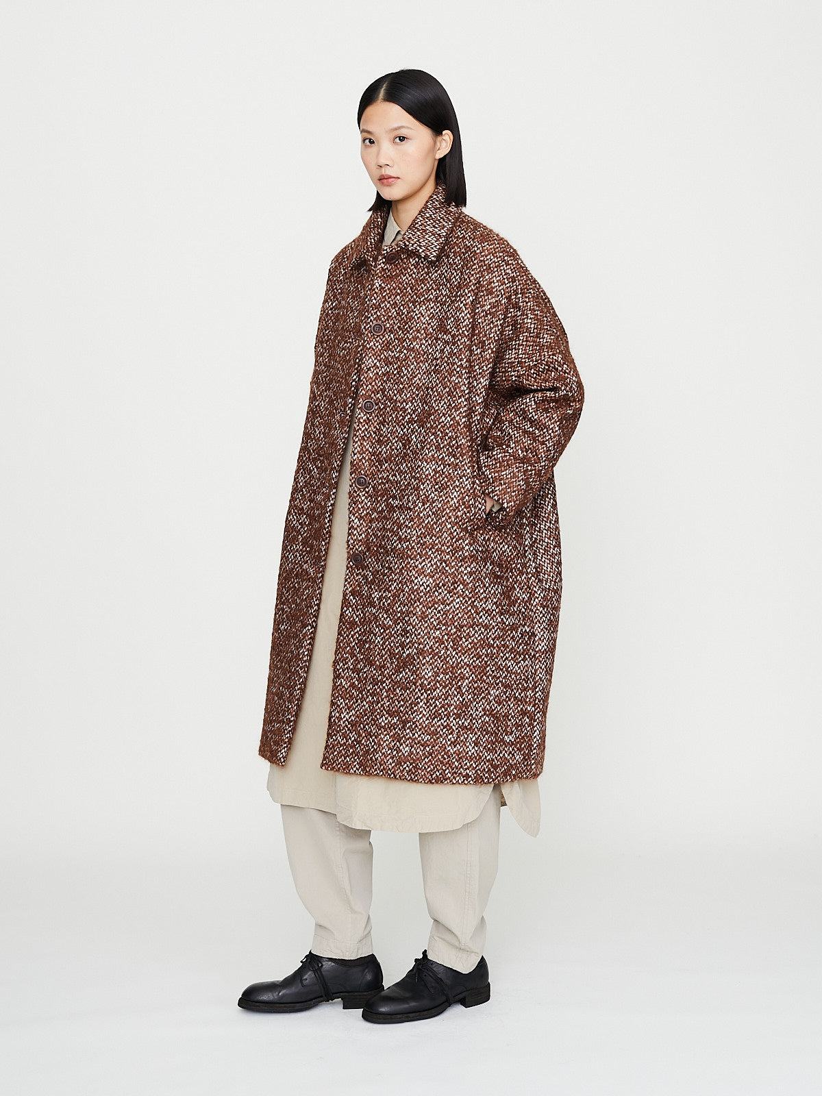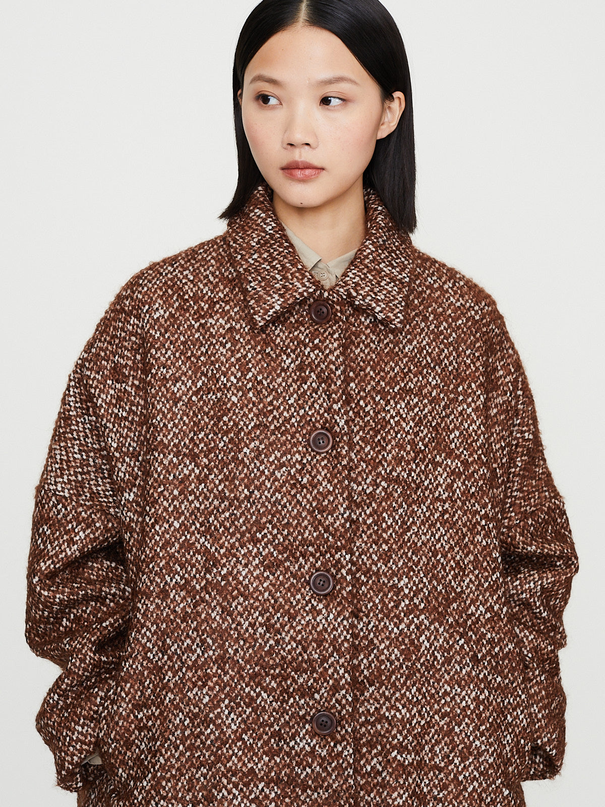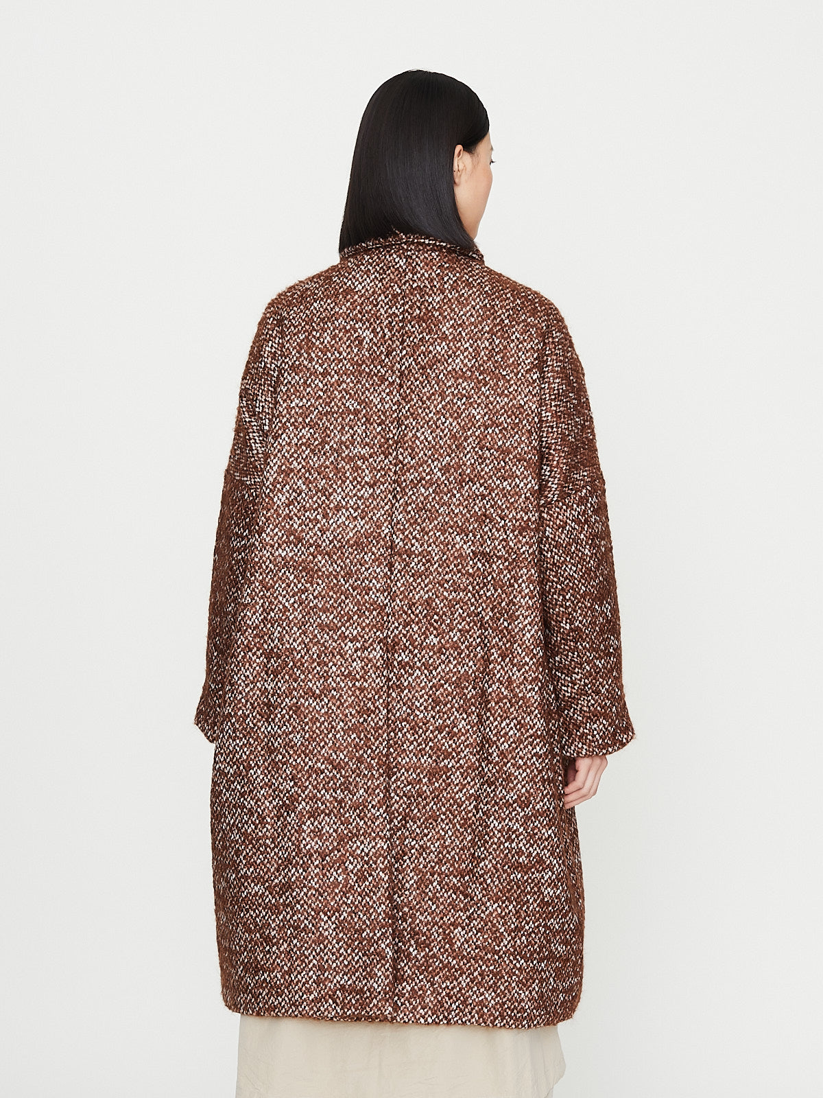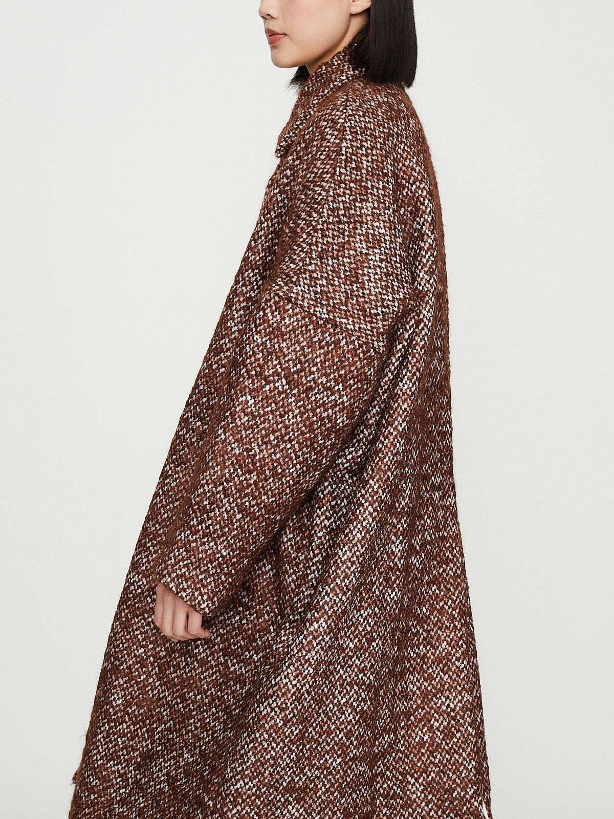 Voluminous coat in brown mohair blend textured tweed with subtle irregularities. Spread collar and long sleeves with an exaggerated dropped shoulder. Slash pockets on the front, two interior pockets and a back vent. Fully lined in cotton. Subtle cocoon silhouette.