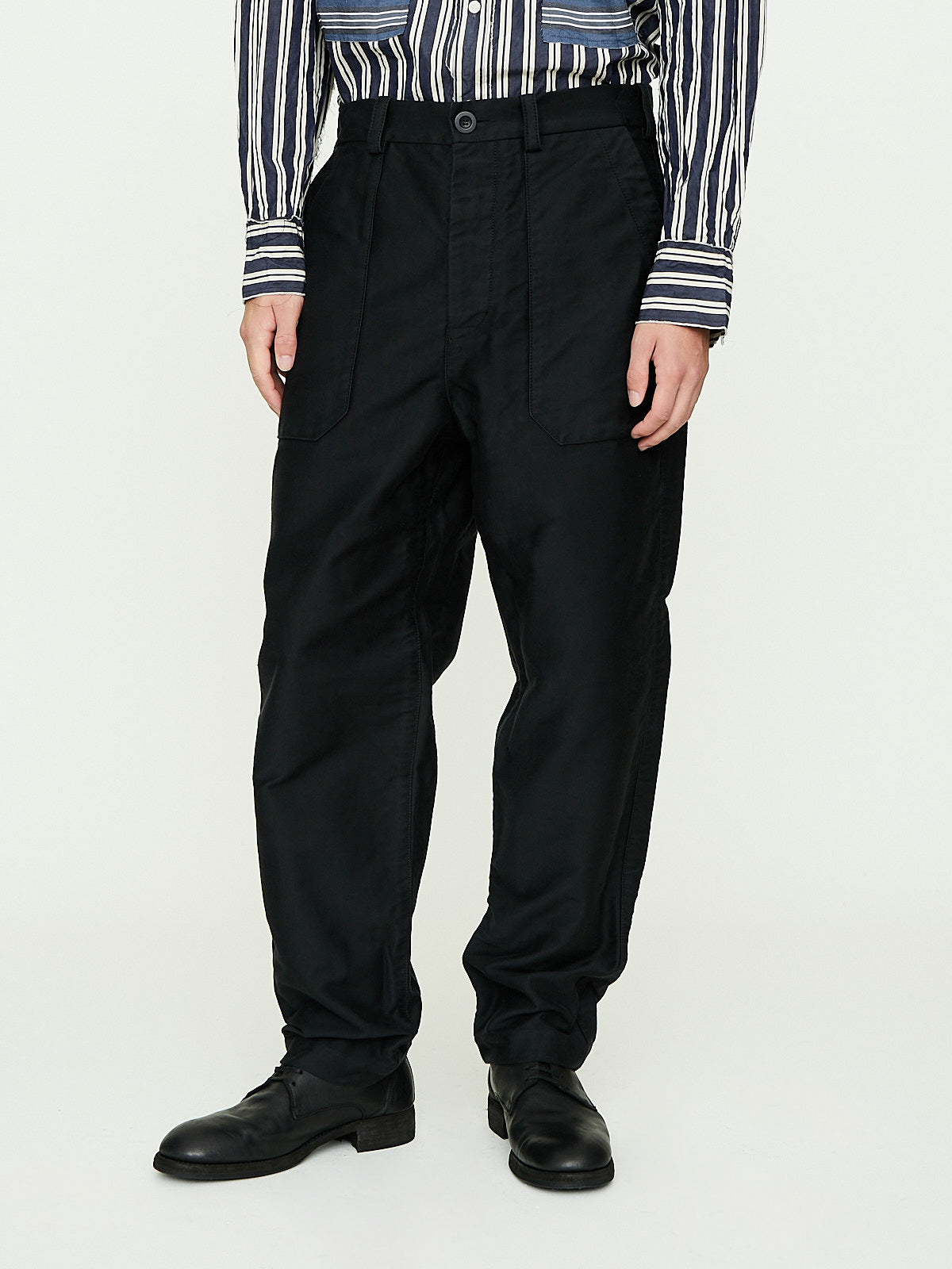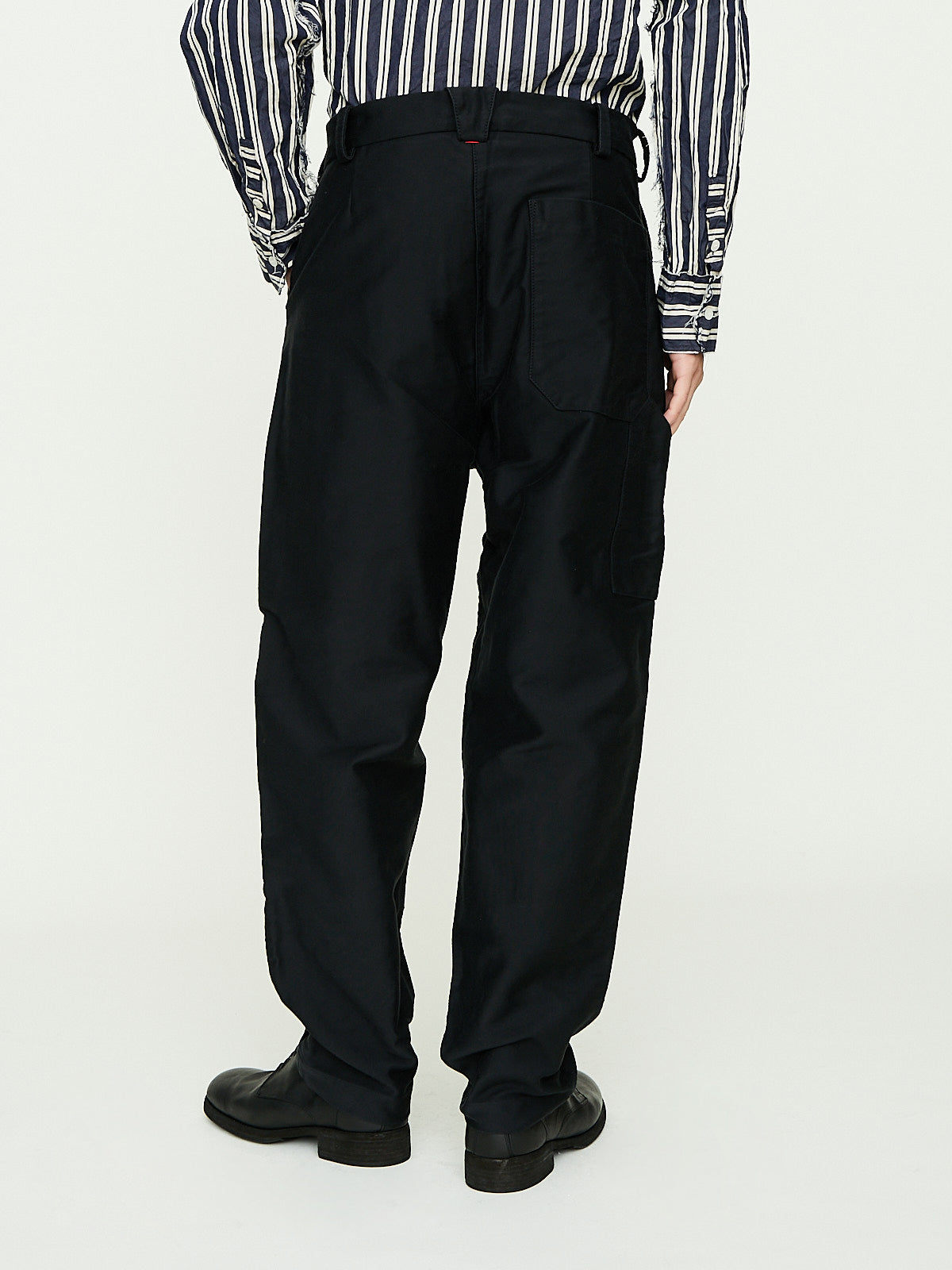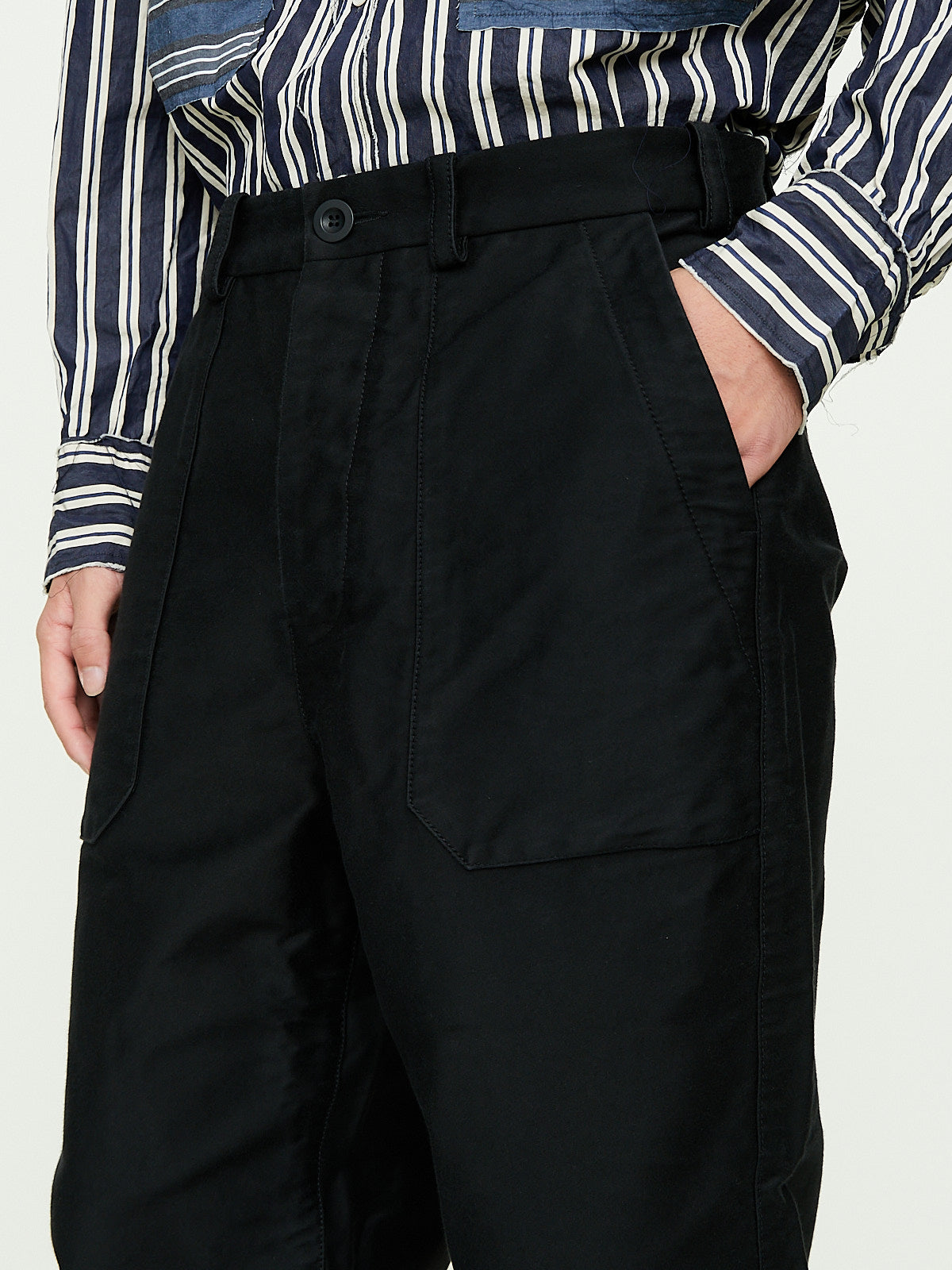 Relaxed workwear pants in black cotton faille with a washed finish. Concealed button fly, belt loops and two patch pockets on the front. Single patch pocket on the back and a tool pocket on the leg. Wide legs that taper at the cuffs.