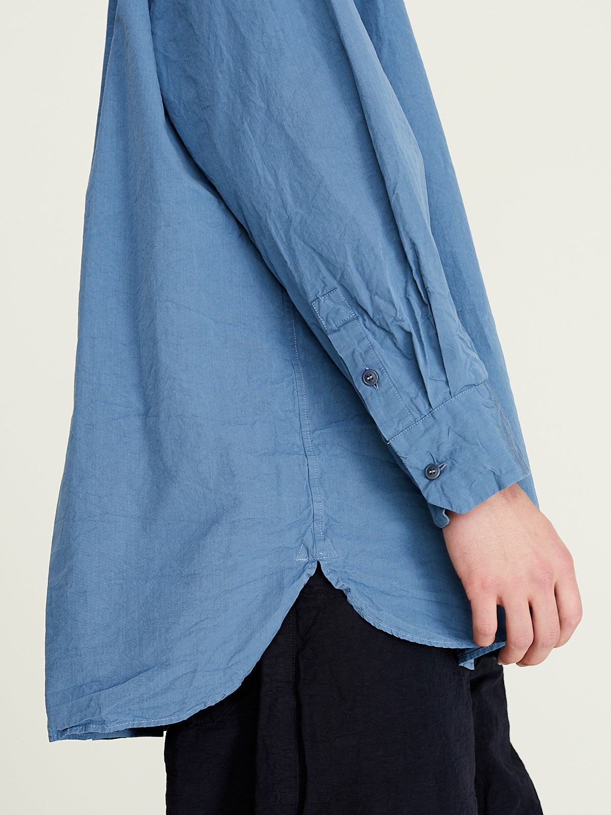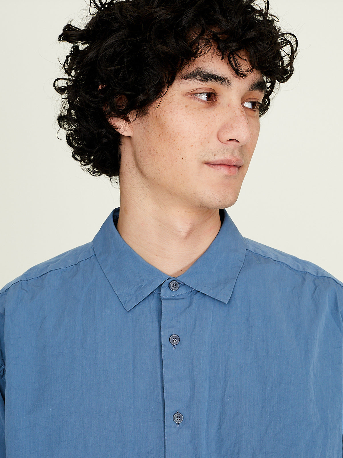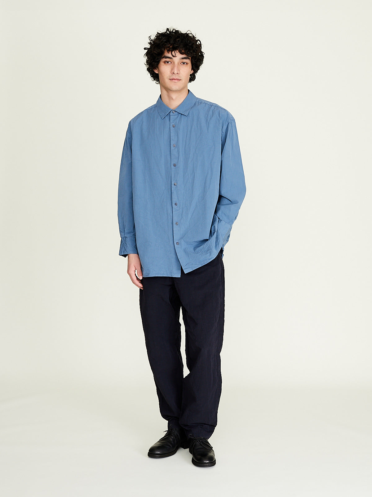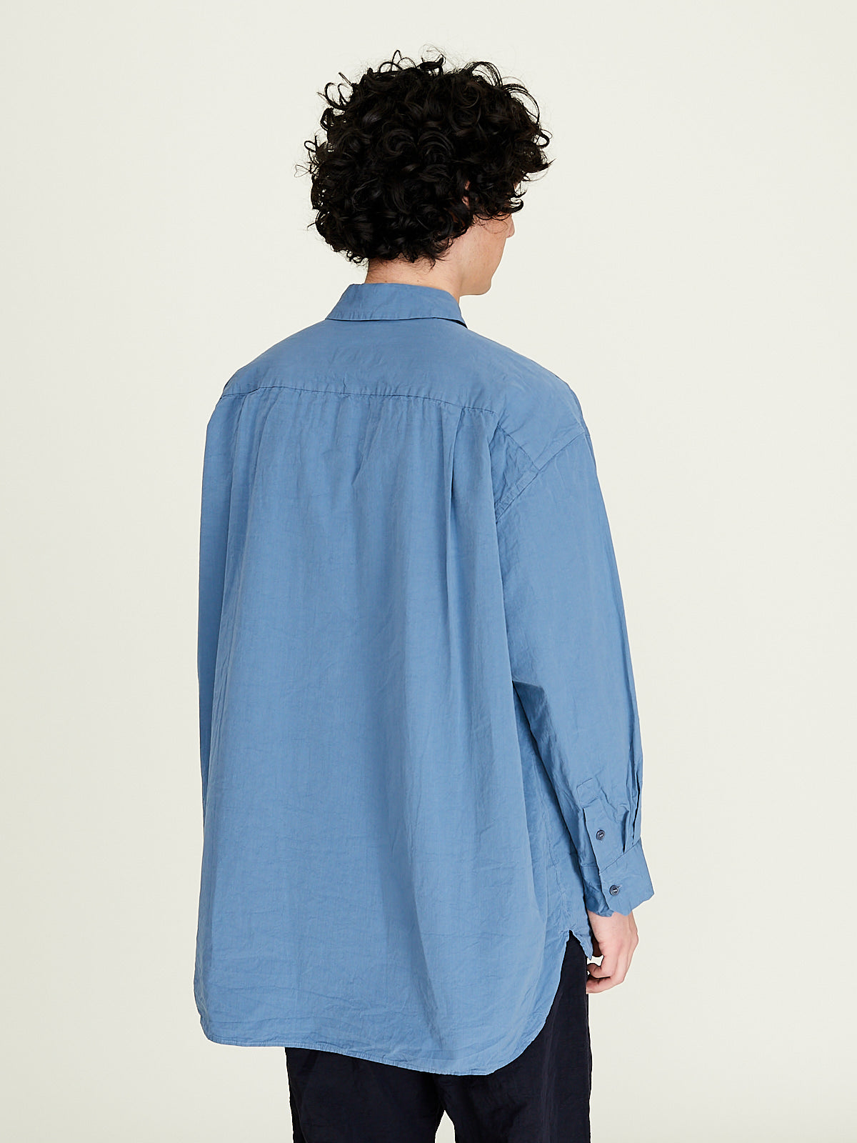 Oversized shirt in washed blue paper cotton. Classic collar, front button fastening and long sleeves with a dropped shoulder and buttoned cuffs. Features a back yoke with pleating on the sides. Curved hemline.