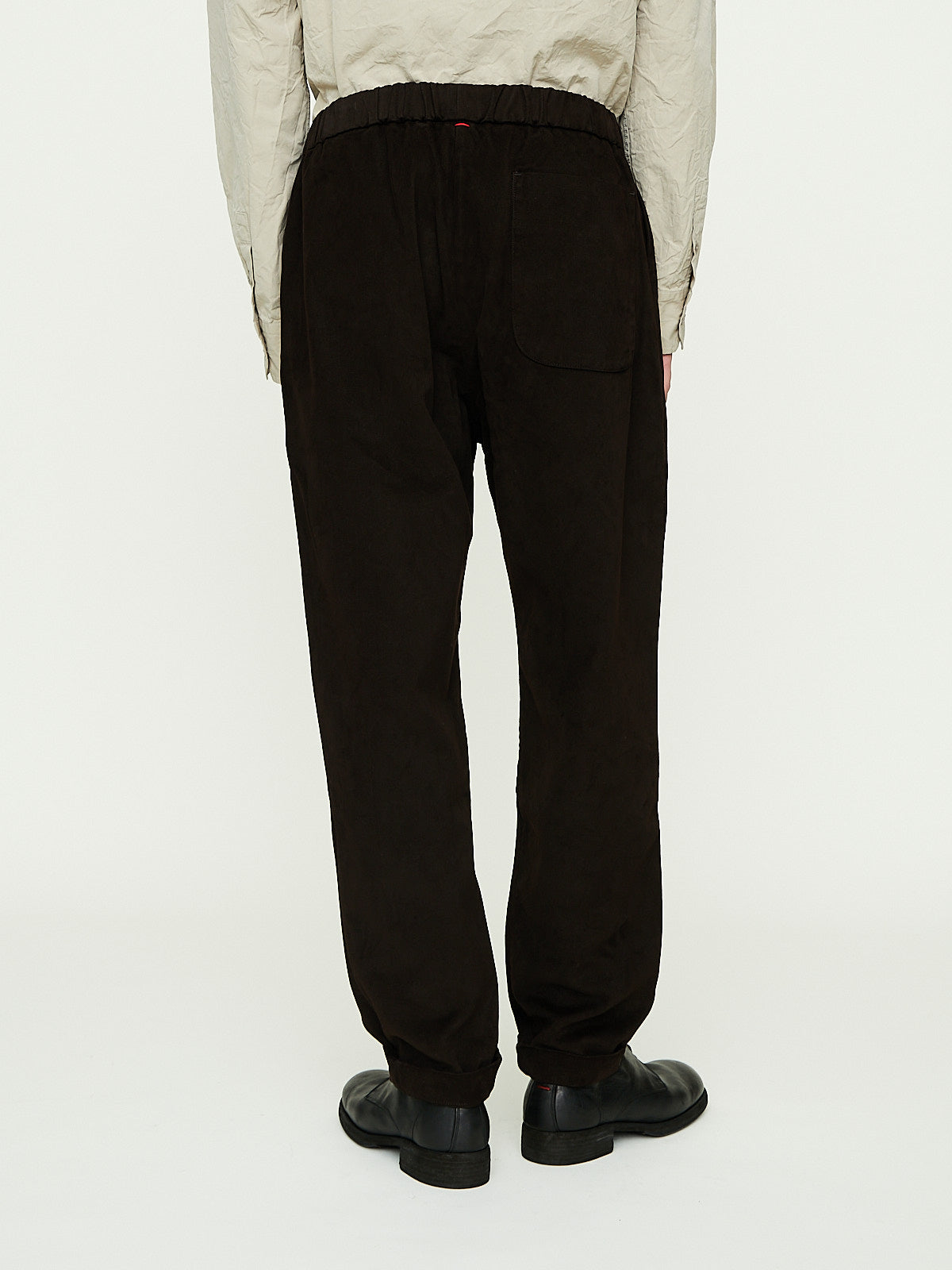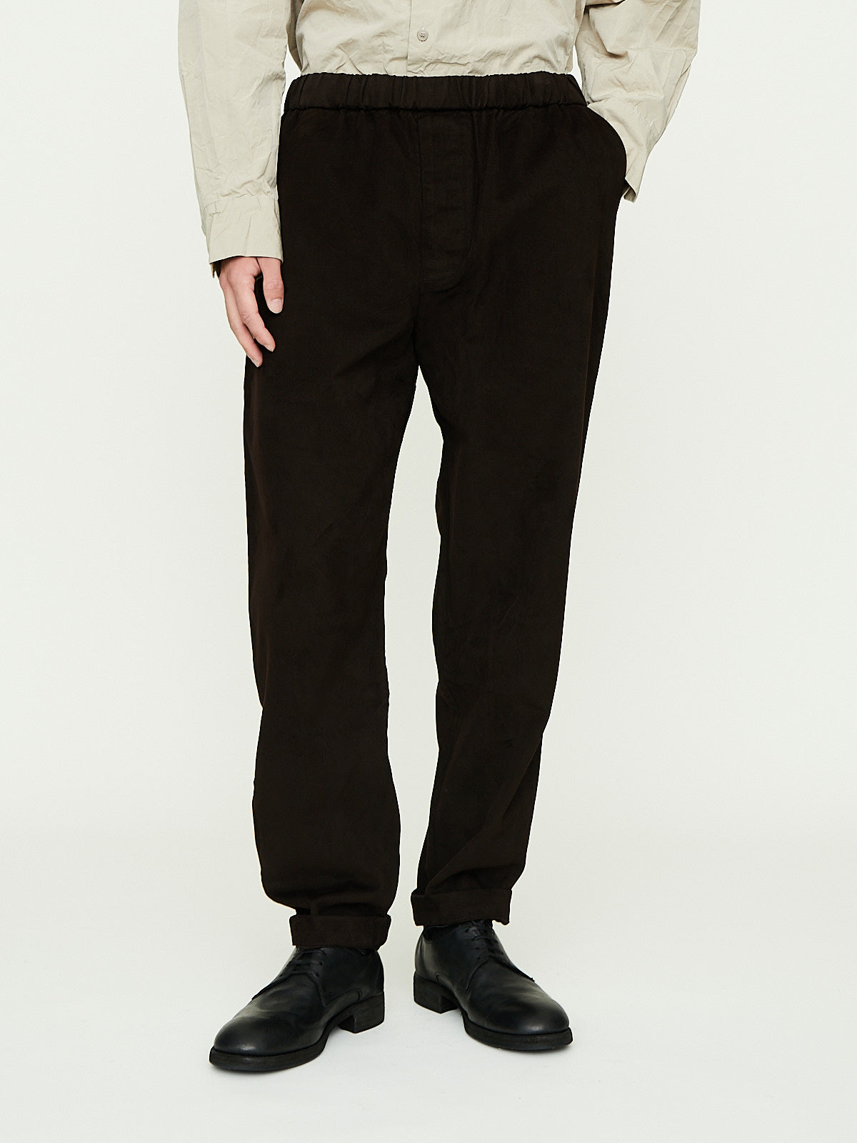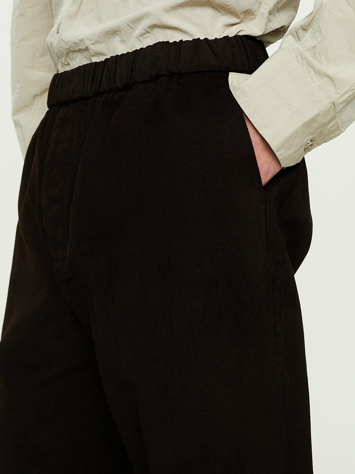 Relaxed trouser in a fluid and breathable cotton blend. Button fly and an elasticated waistband with an internal adjustable drawstring. Side seam pockets and a single patch pocket. Legs slightly taper at the cuffs.