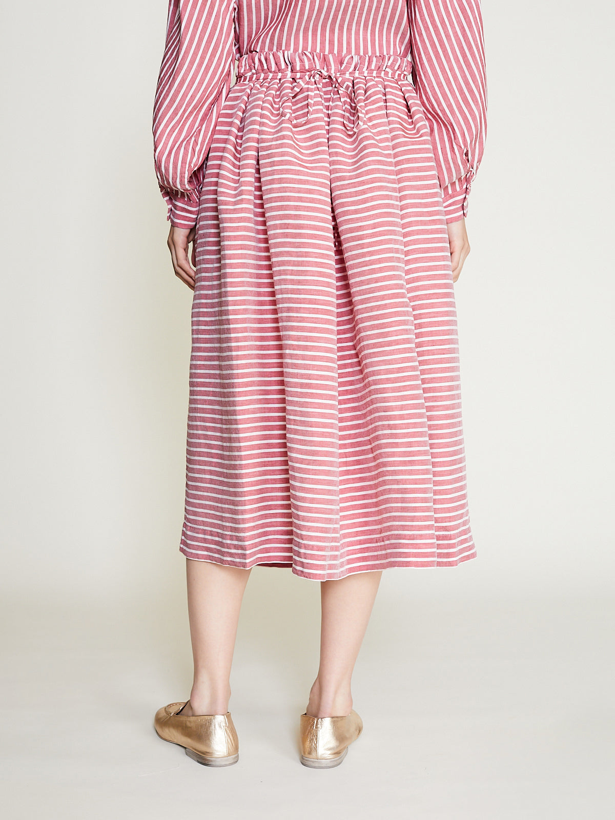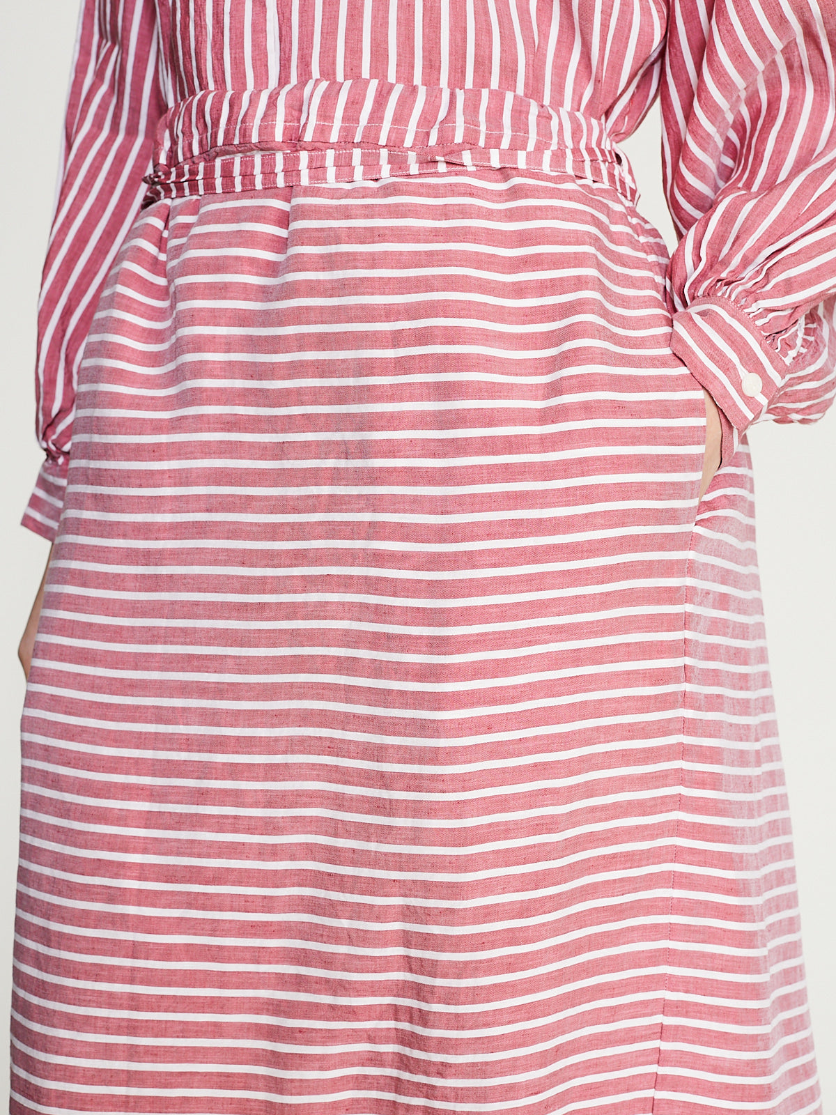 A-line skirt in striped raspberry linen blend. Pull-on style with an elasticated waistband and an adjustable drawstring that creates a gathering effect. Side seam pockets.