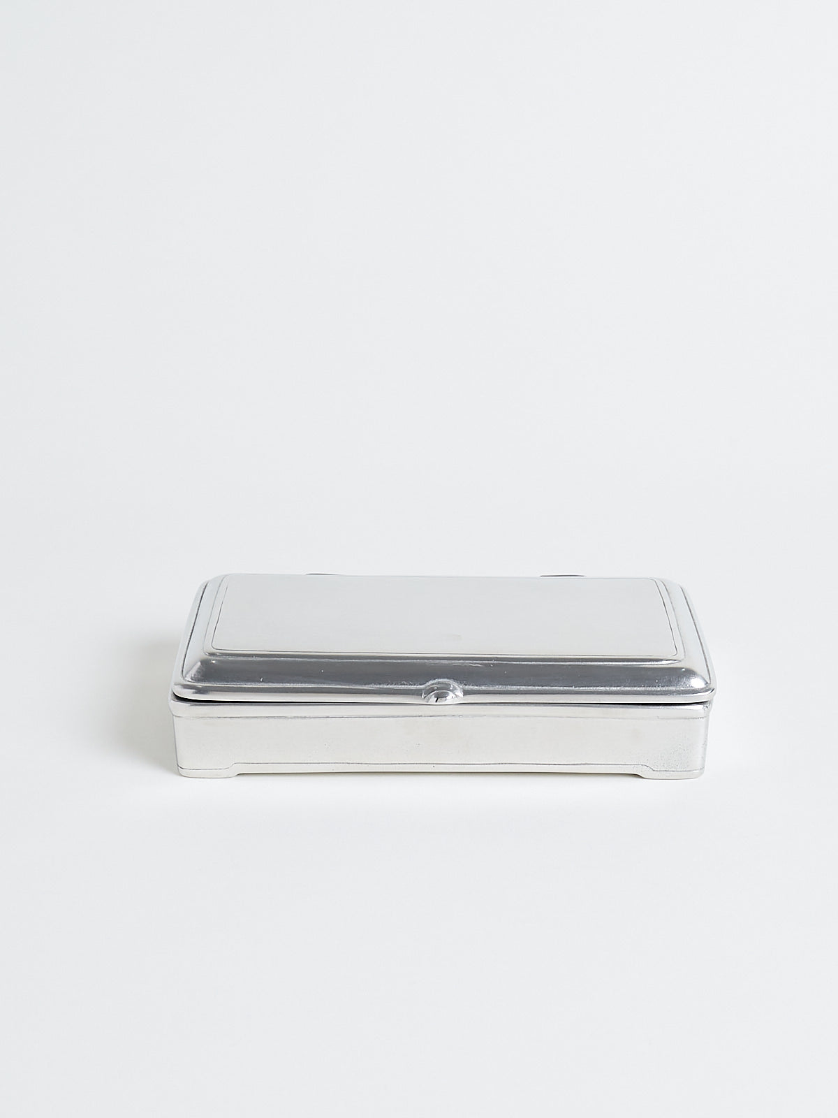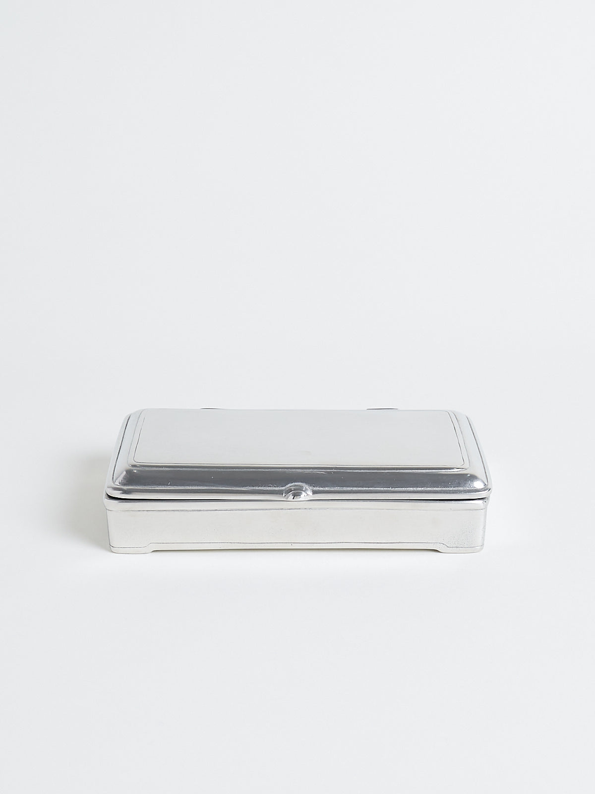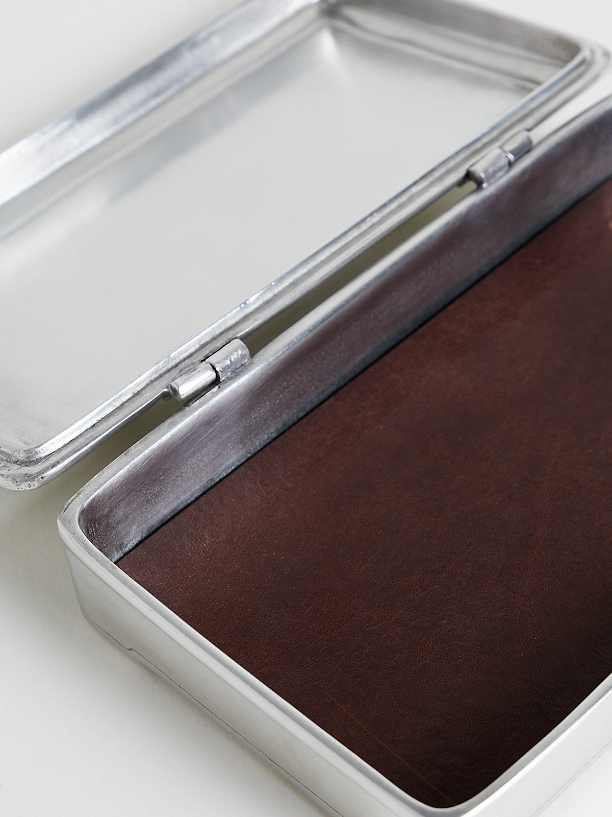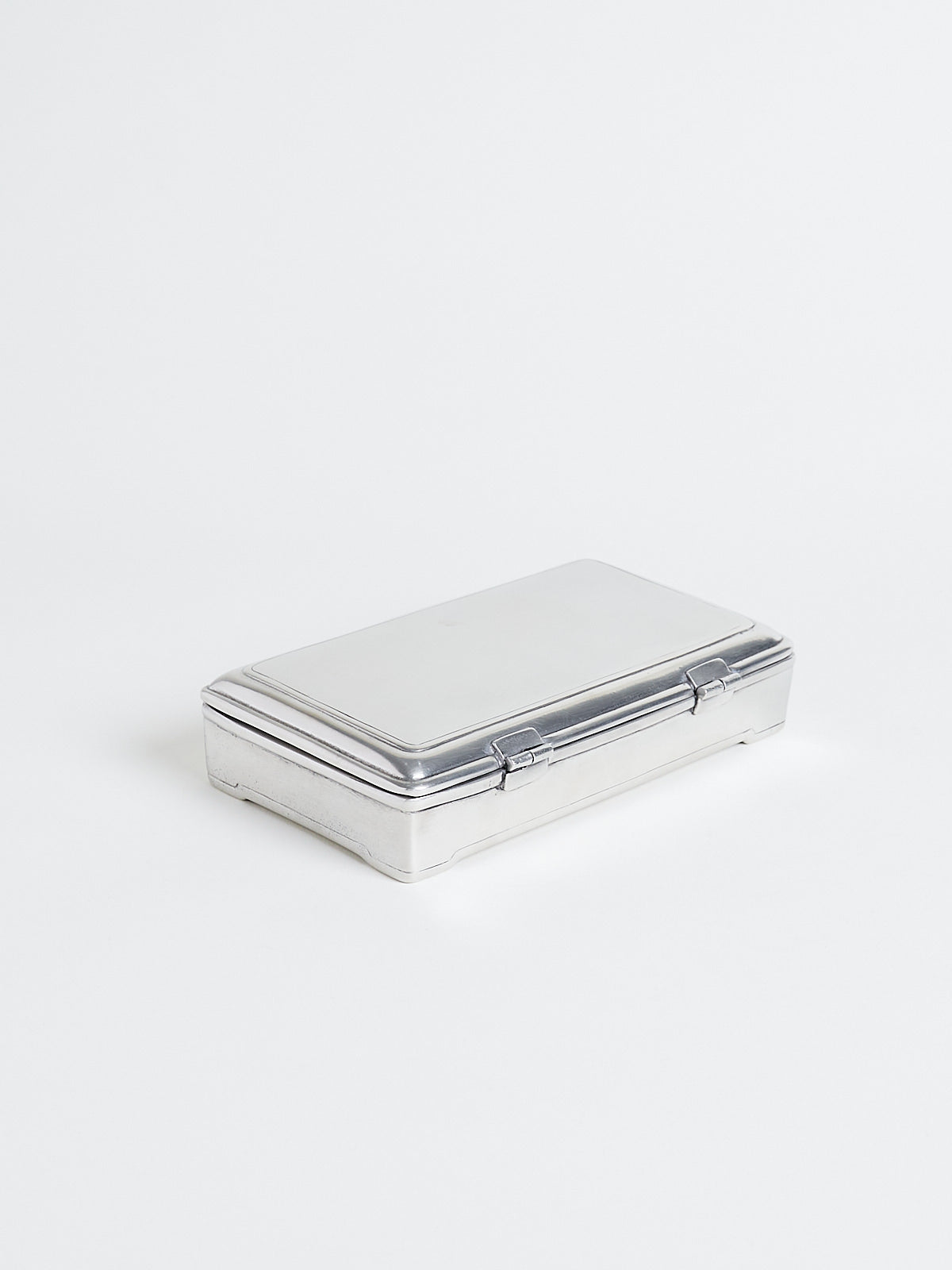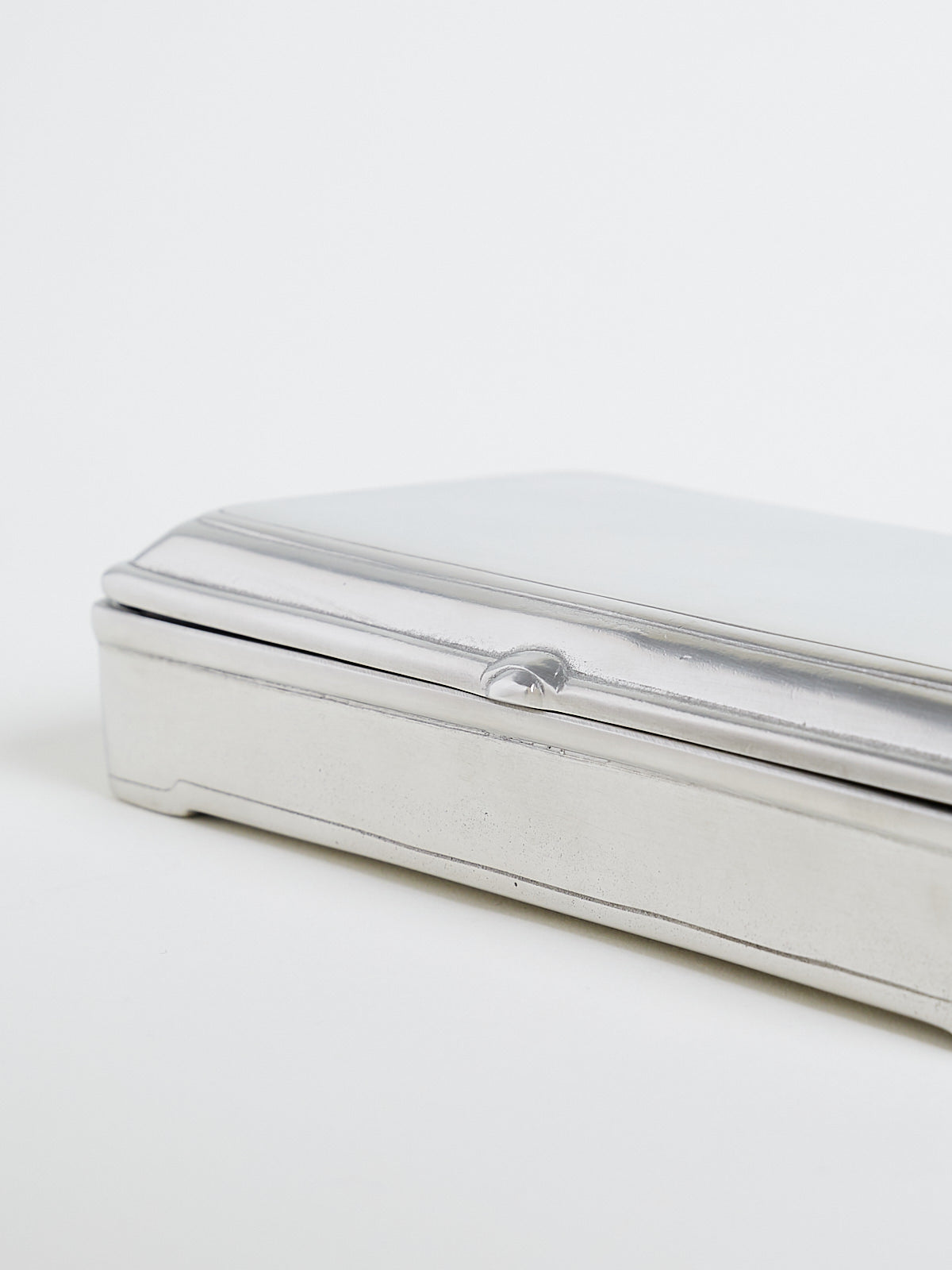 Handcrafted rectangular box, with lid, made from solid lead-free Italian pewter with a leather inlay. Hand-finished to produce a subtle patina.
