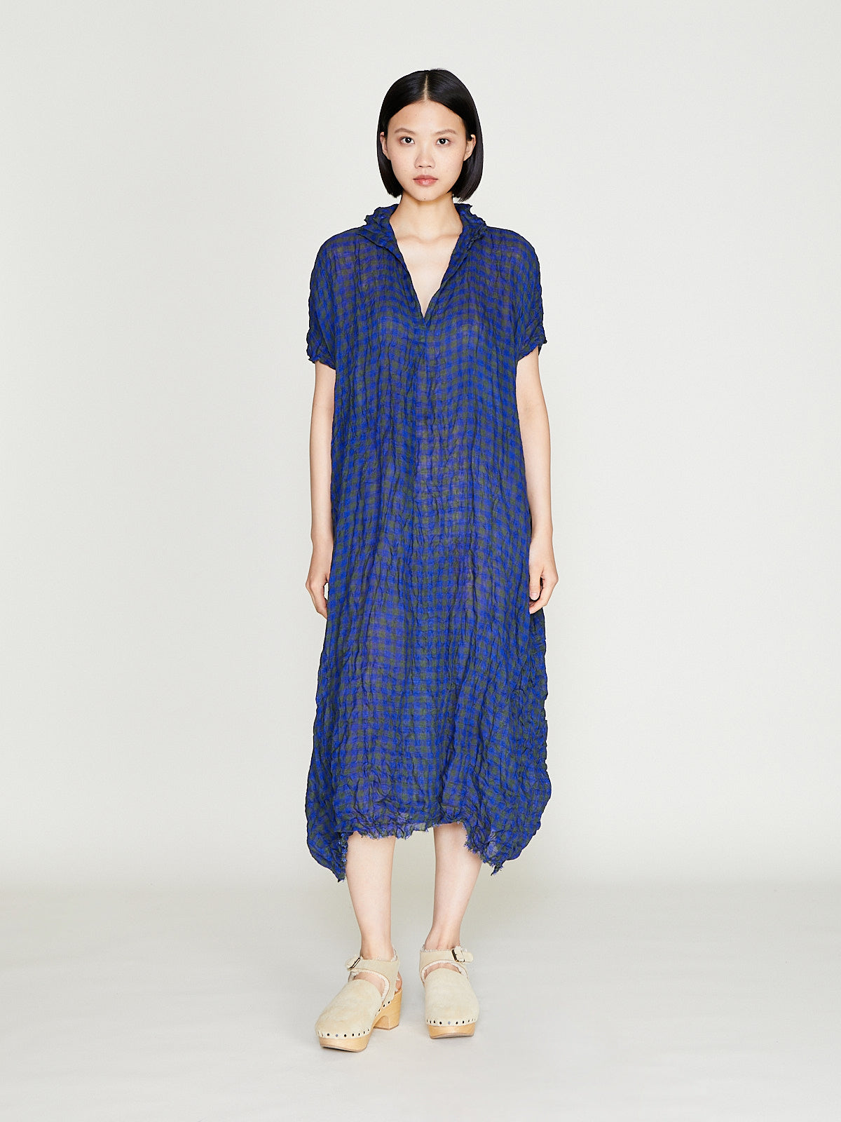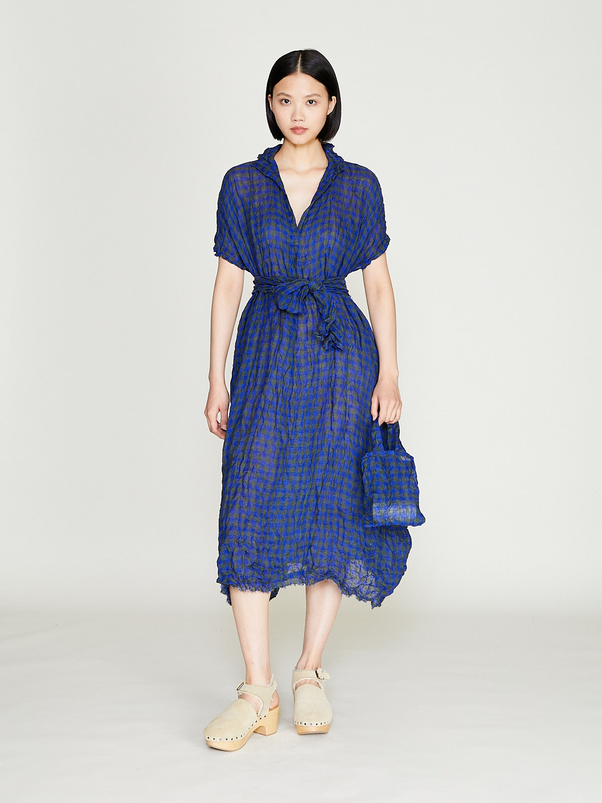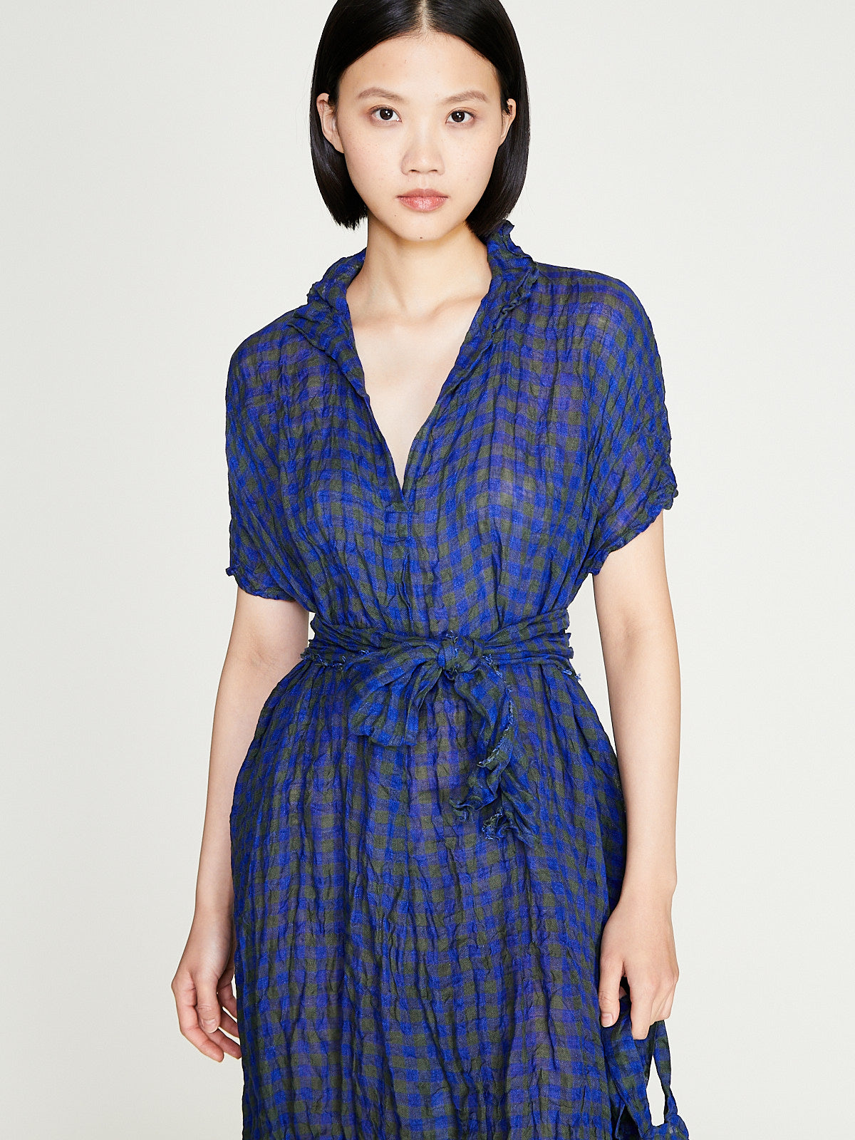 Relaxed dress in washed khaki green/blue checked linen. V-neckline with a small collar and short dolman sleeves. Side seam pockets and midi length. Cinch the silhouette with the removable fabric belt. Comes with a small matching tote bag. 1cm checks.