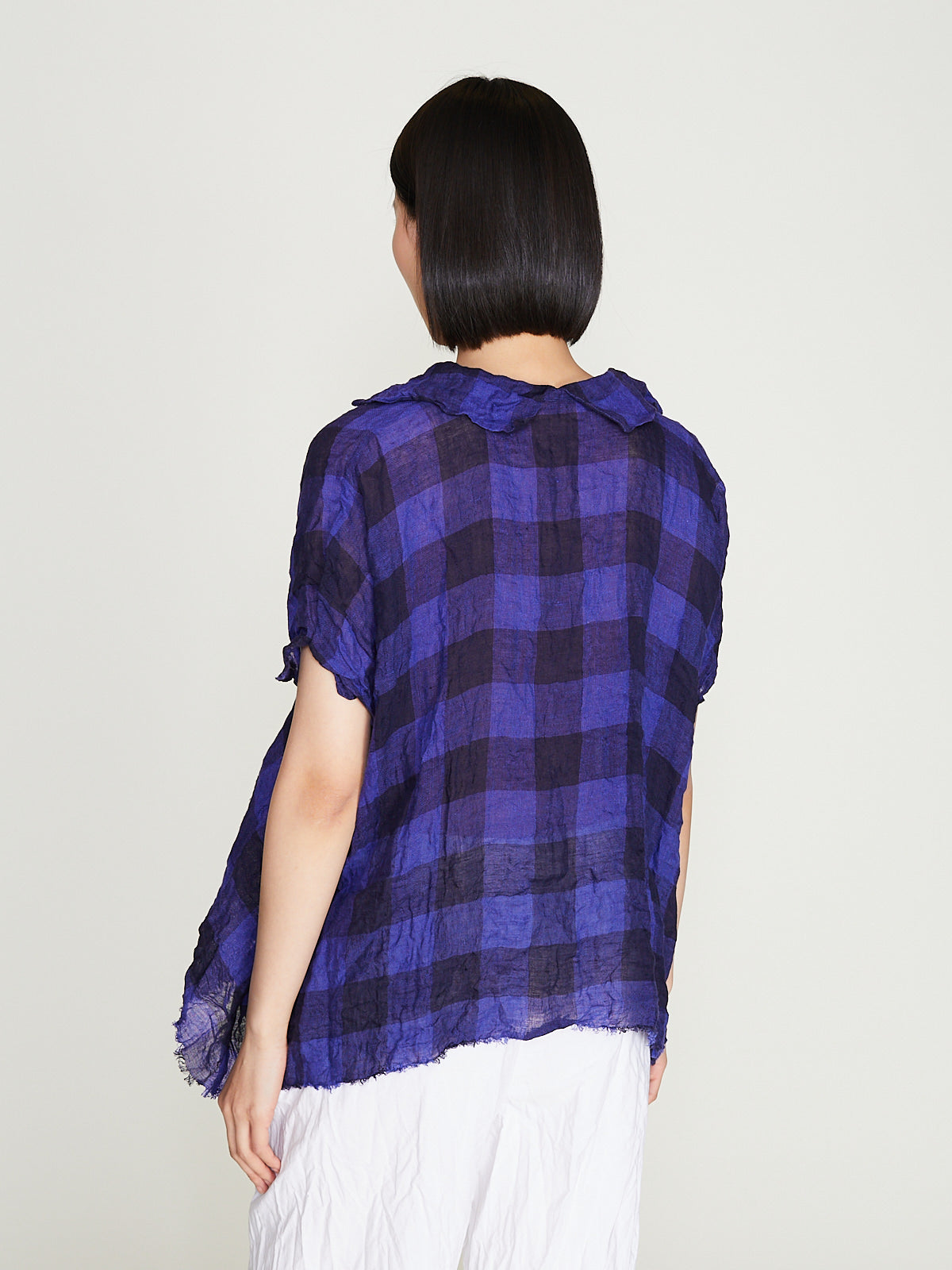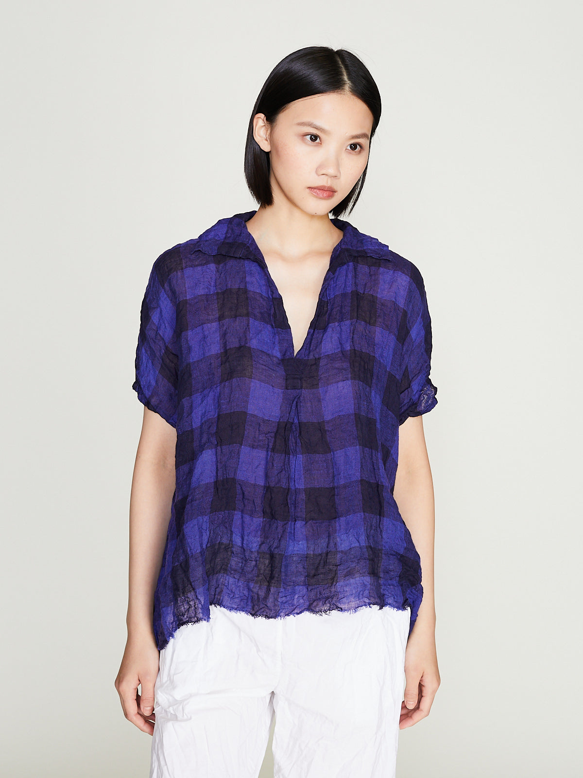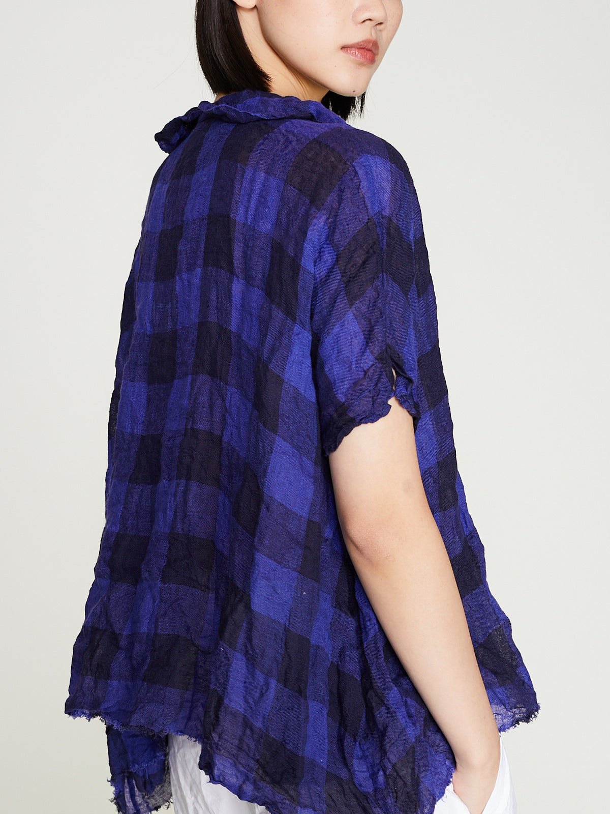 Oversized boxy shirt in washed checked blue/navy linen. Open collar and a v-neckline with a pleat detail below the placket. Capped sleeves and a raw hemline. Curved hemline that is longer on the sides. Subtle a-line silhouette. 5cm checks.
