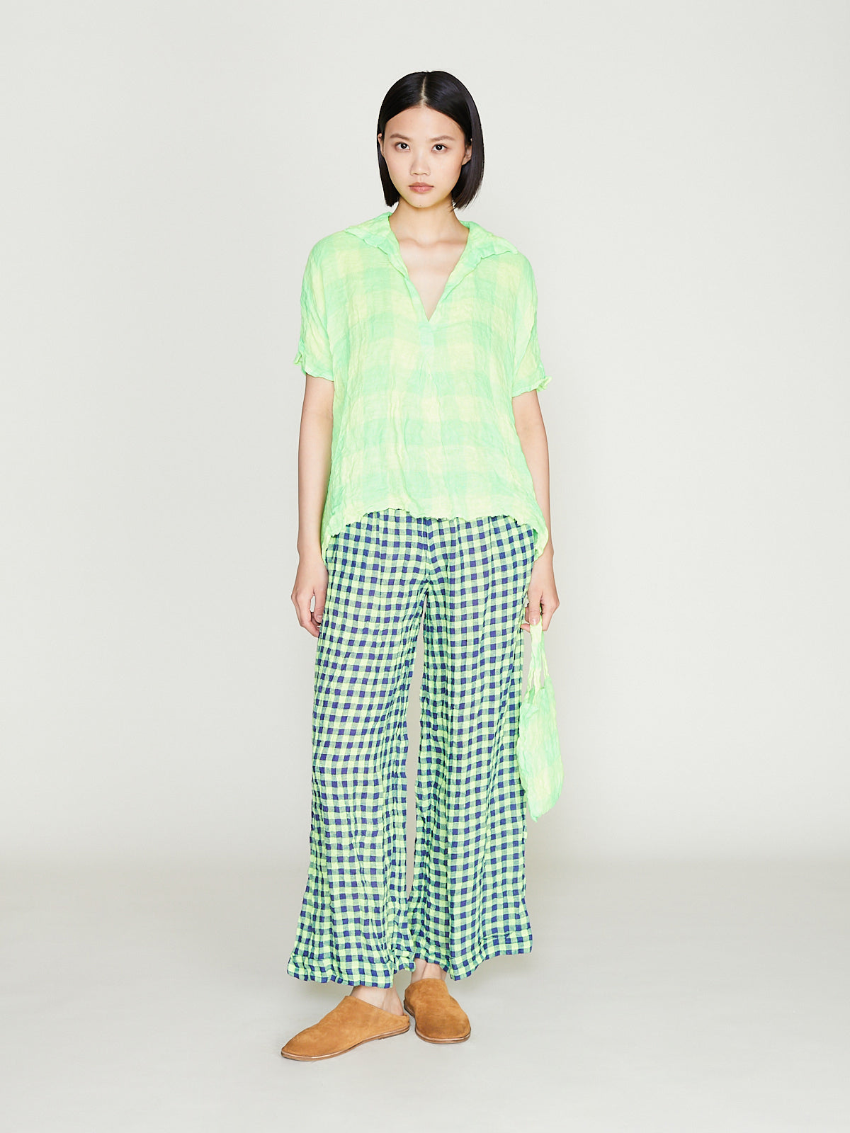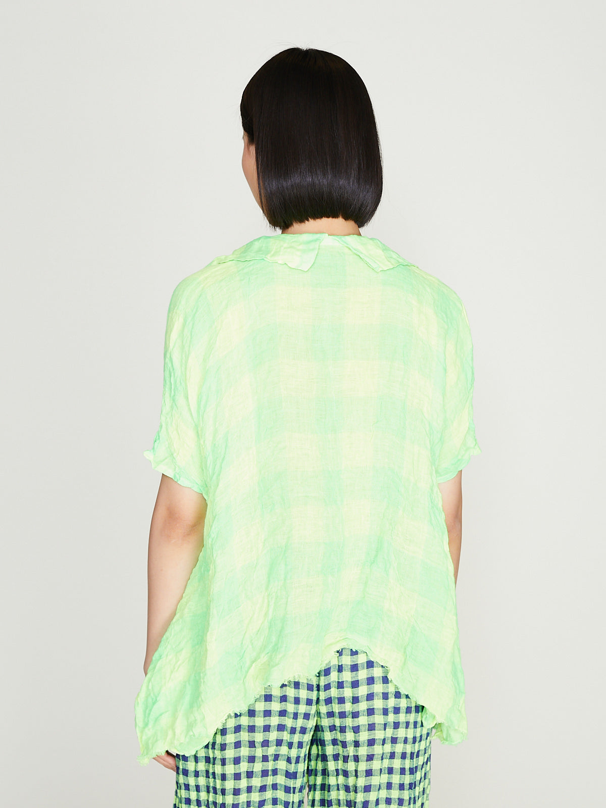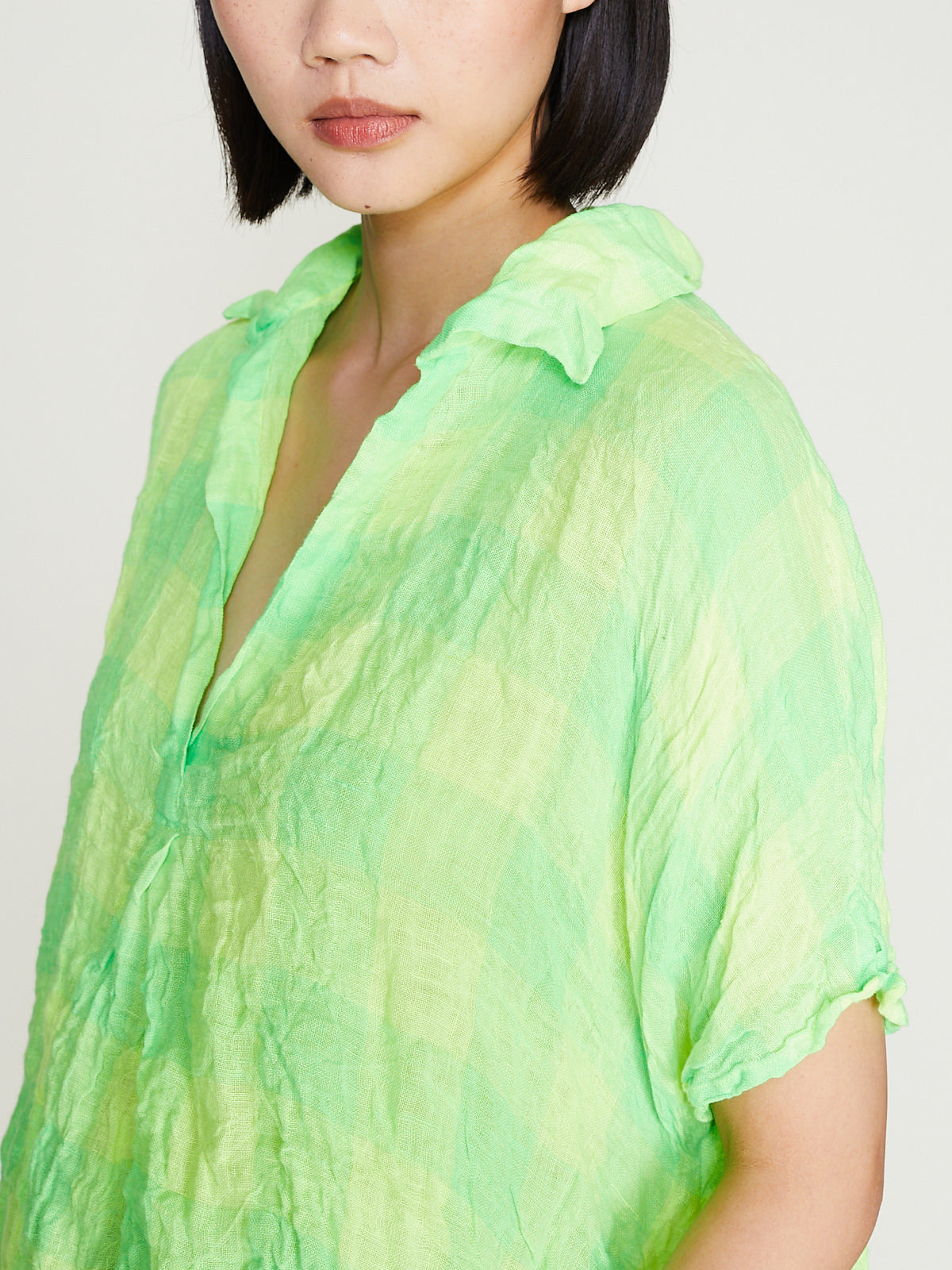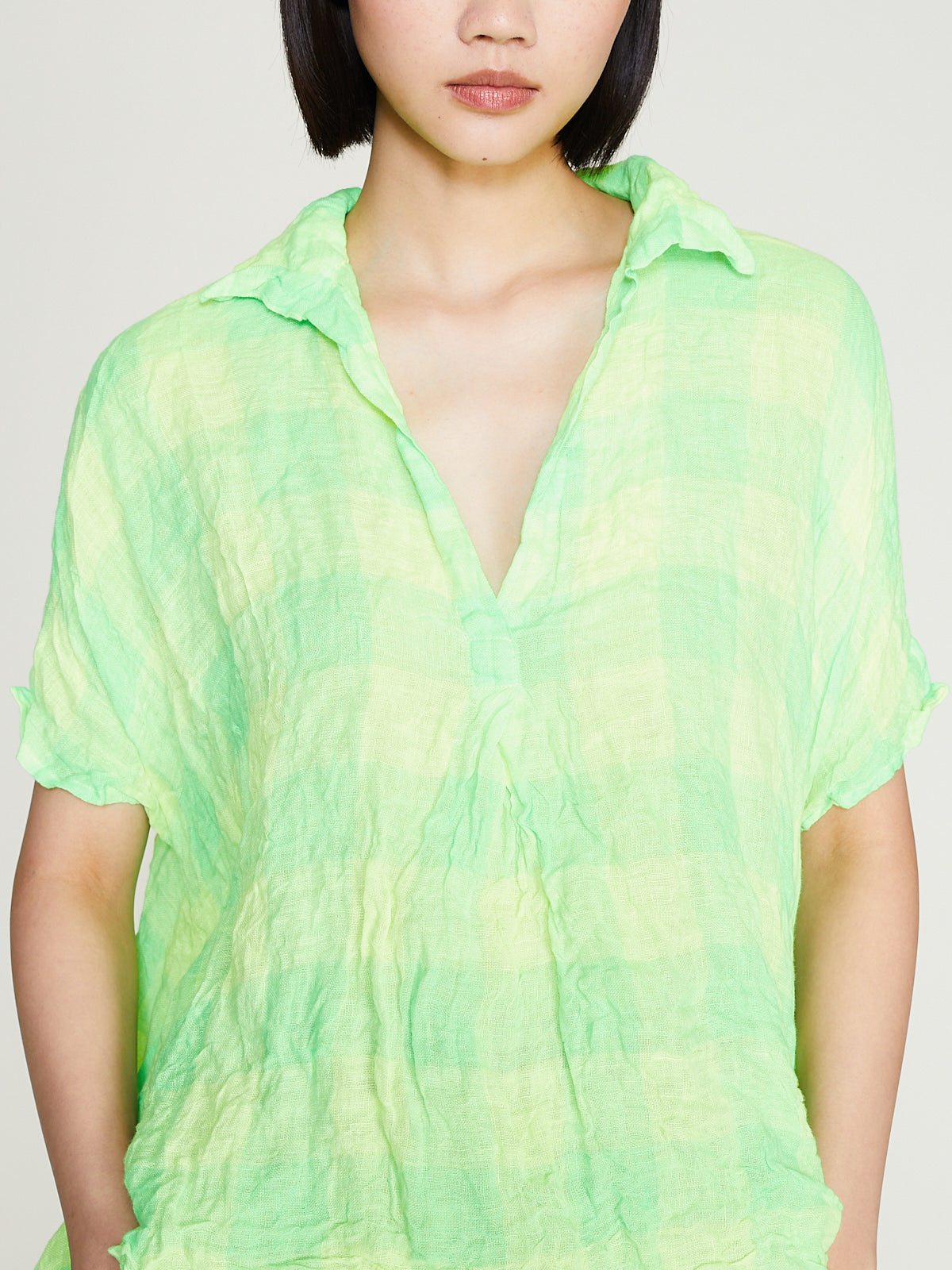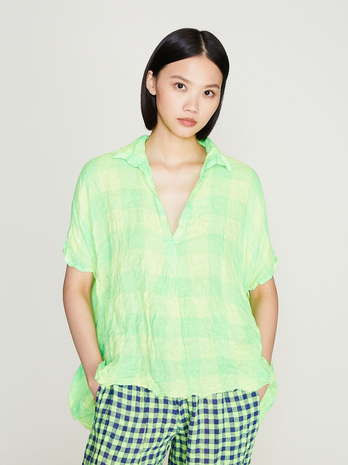 Oversized boxy shirt in washed checked neon yellow/neon green linen. Open collar and a v-neckline with a pleat detail below the placket. Capped sleeves and a raw hemline. Curved hemline that is longer on the sides. Subtle a-line silhouette. 5cm checks.