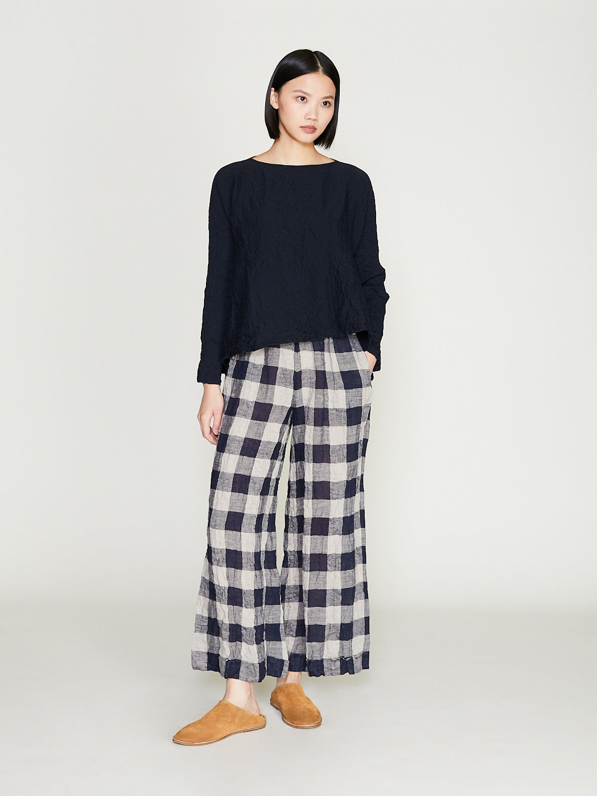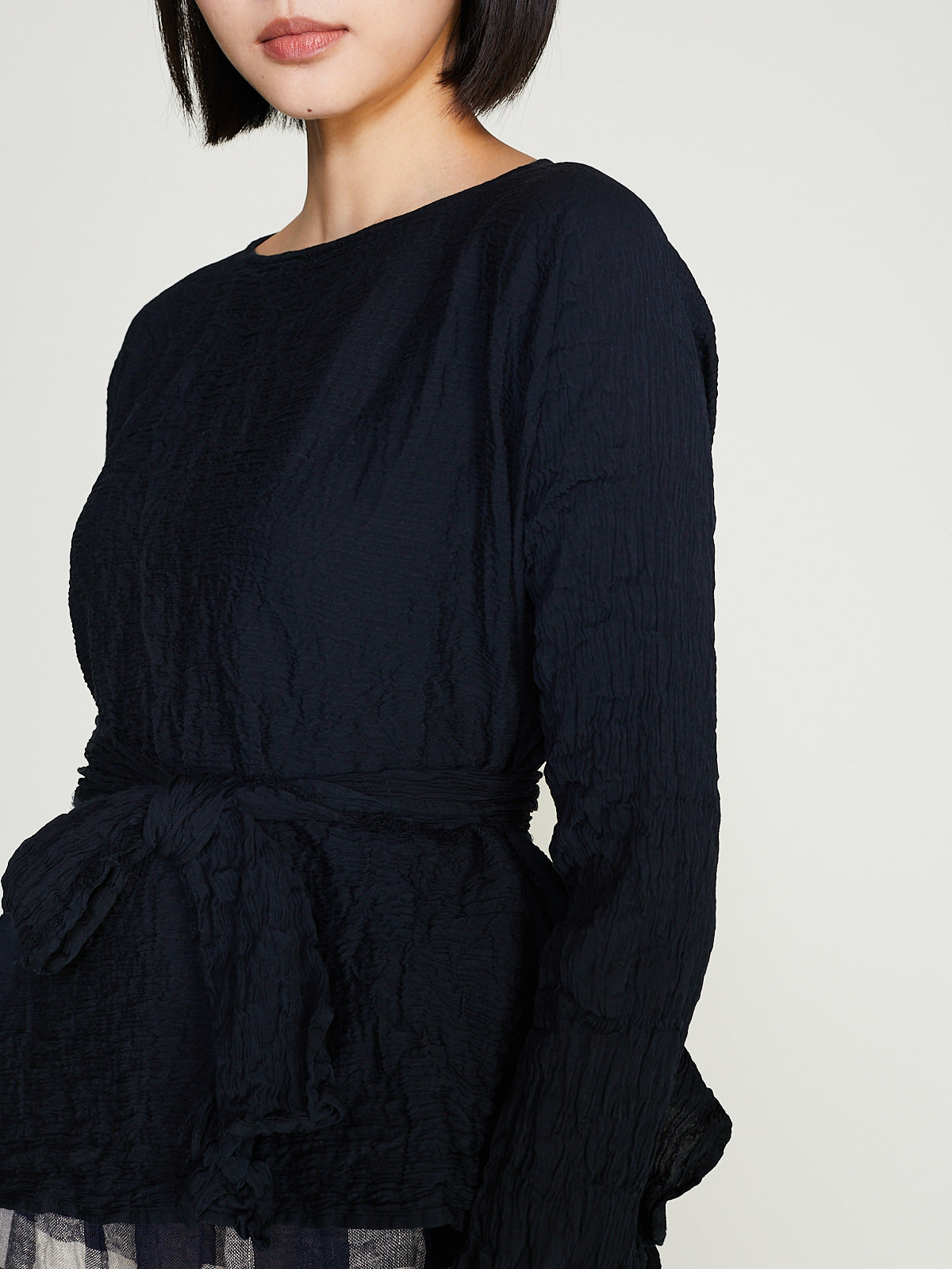 Relaxed top in washed black cotton. Wide round neckline and cropped dolman sleeves. Cinch the silhouette with the matching fabric belt. Subtle a-line silhouette. Curved hemline on the back.
