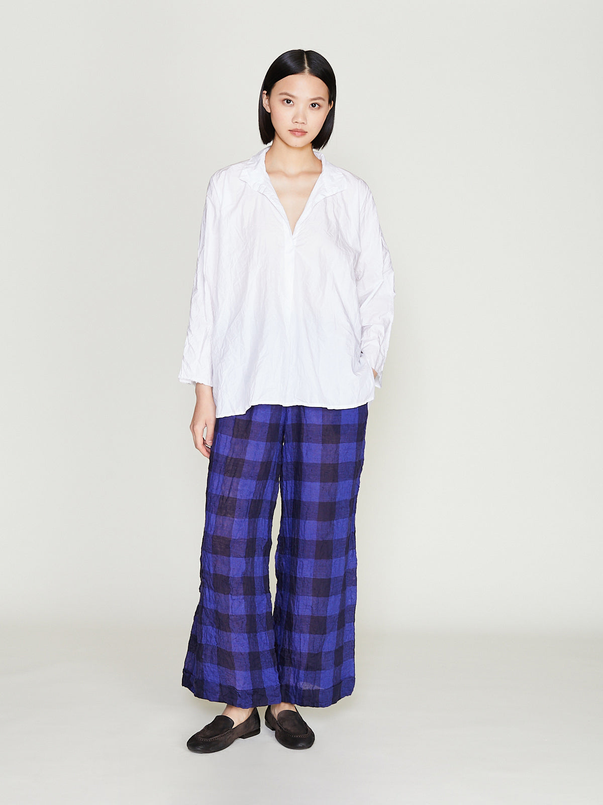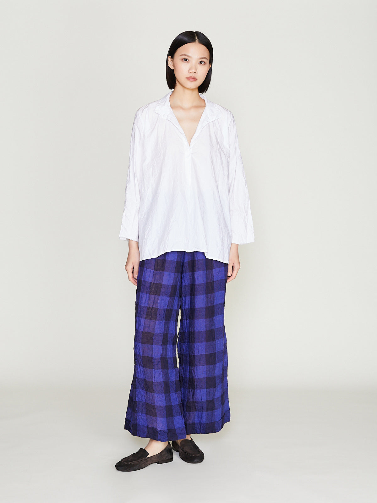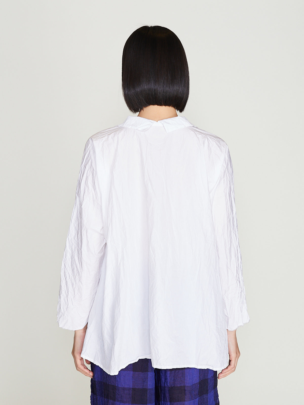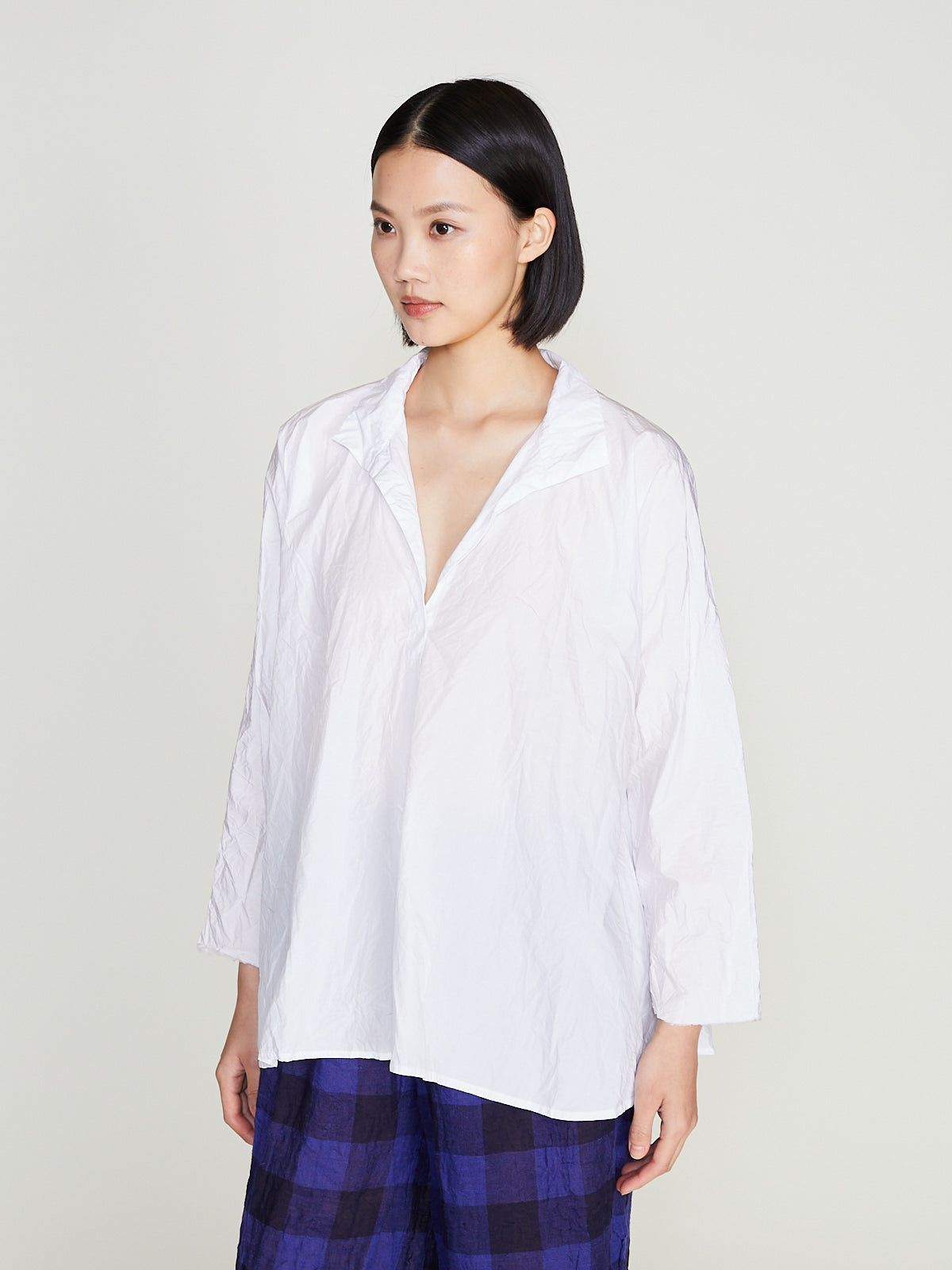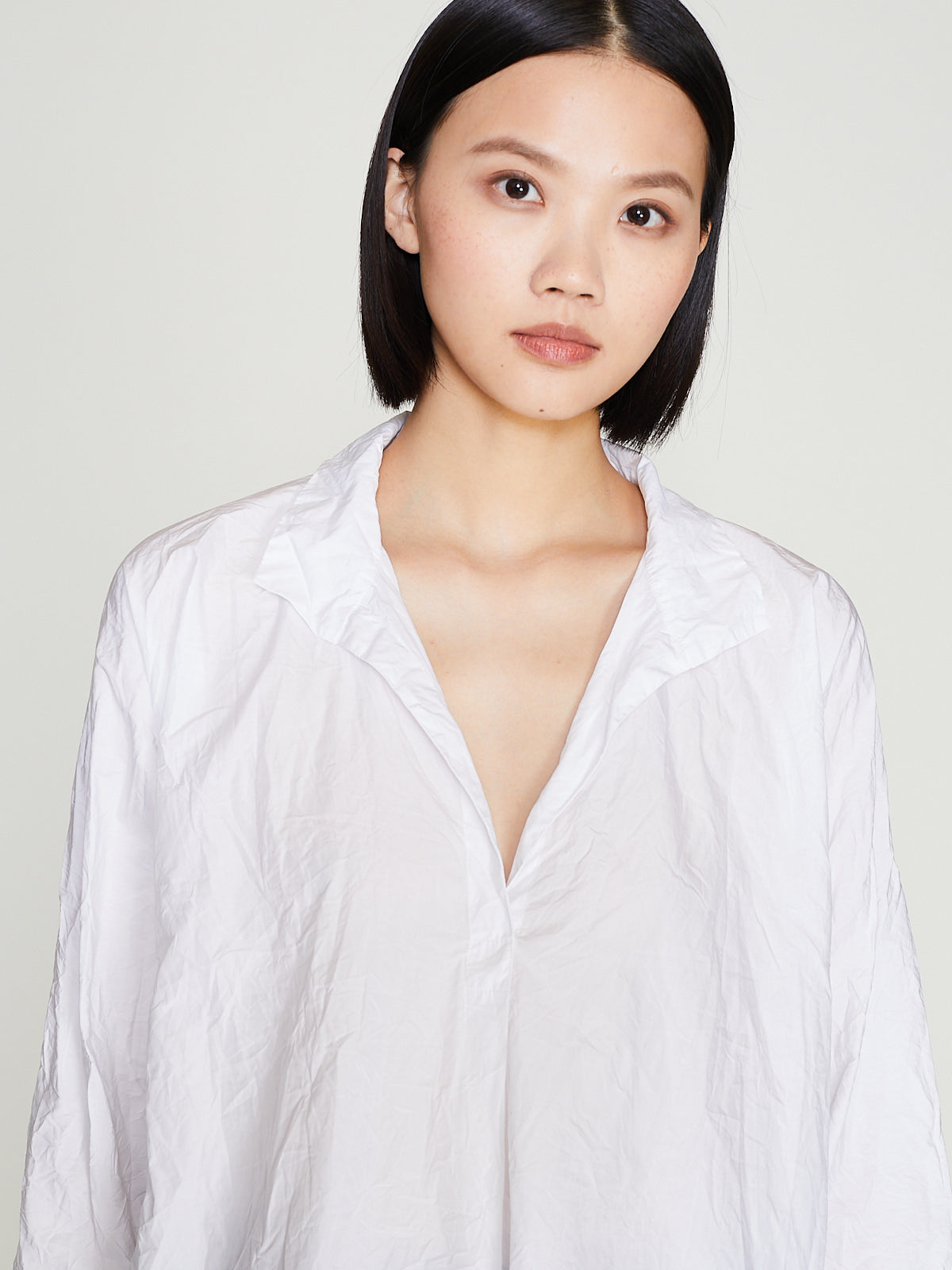 Oversized shirt in washed white cotton. Open collar, v-neck with a pleat detail below the placket. Cropped sleeves and an a-line silhouette. A-line silhouette.