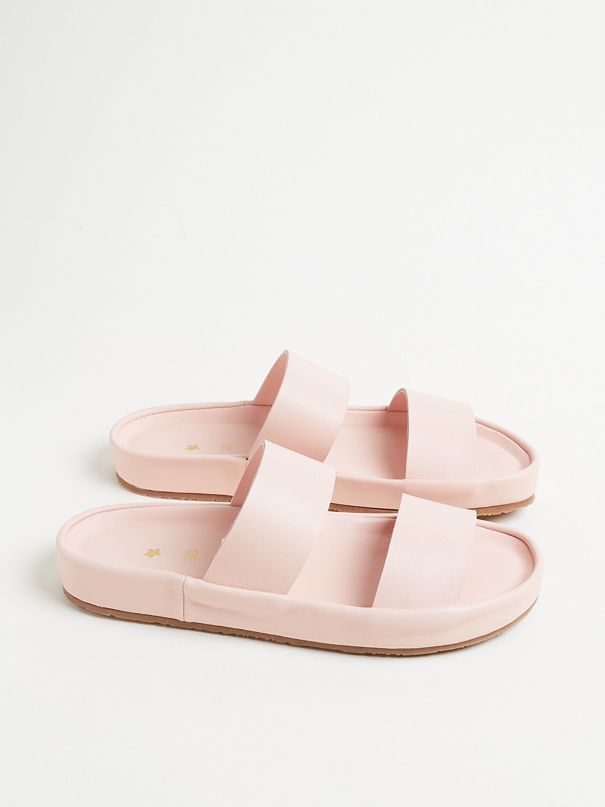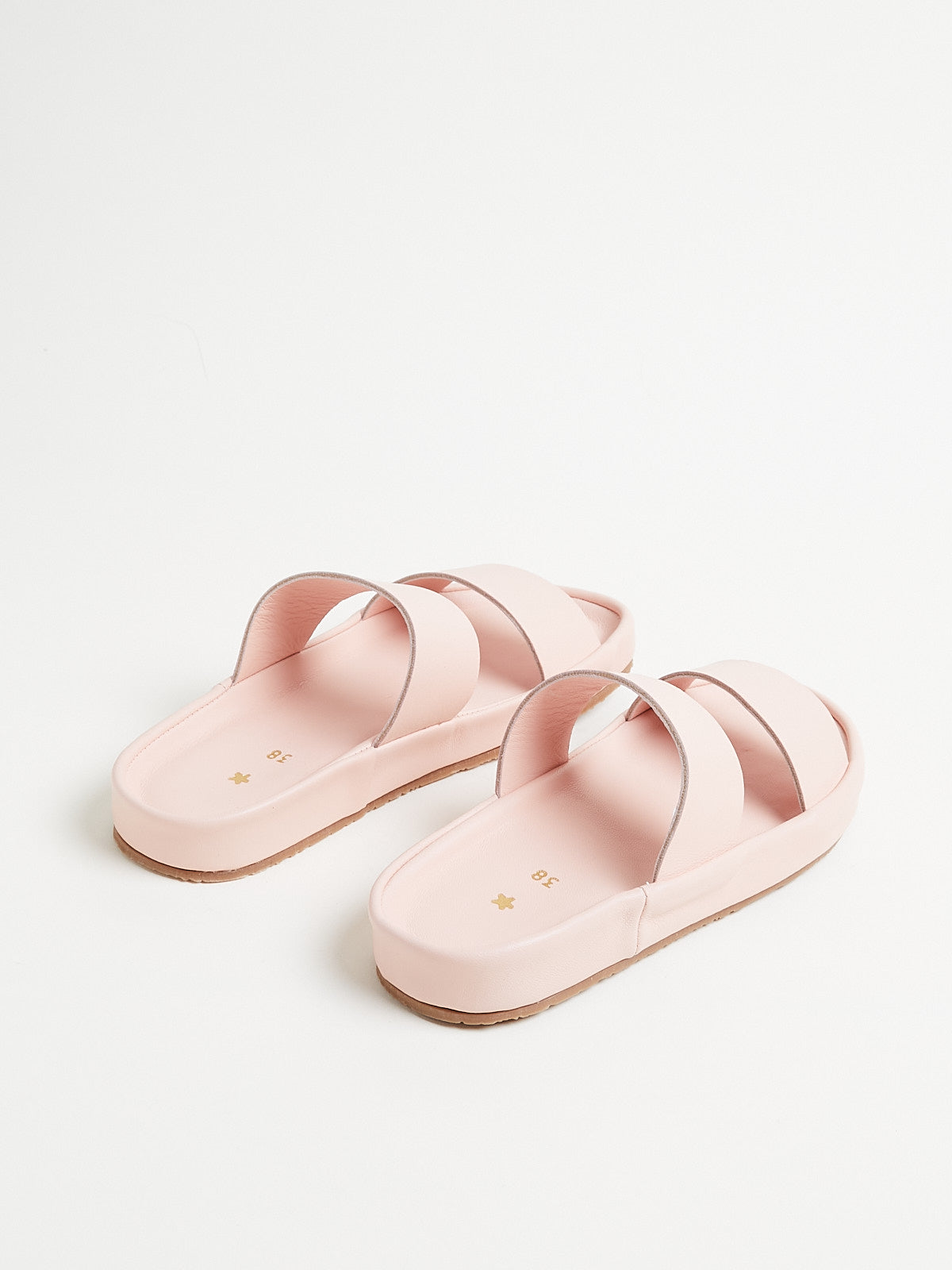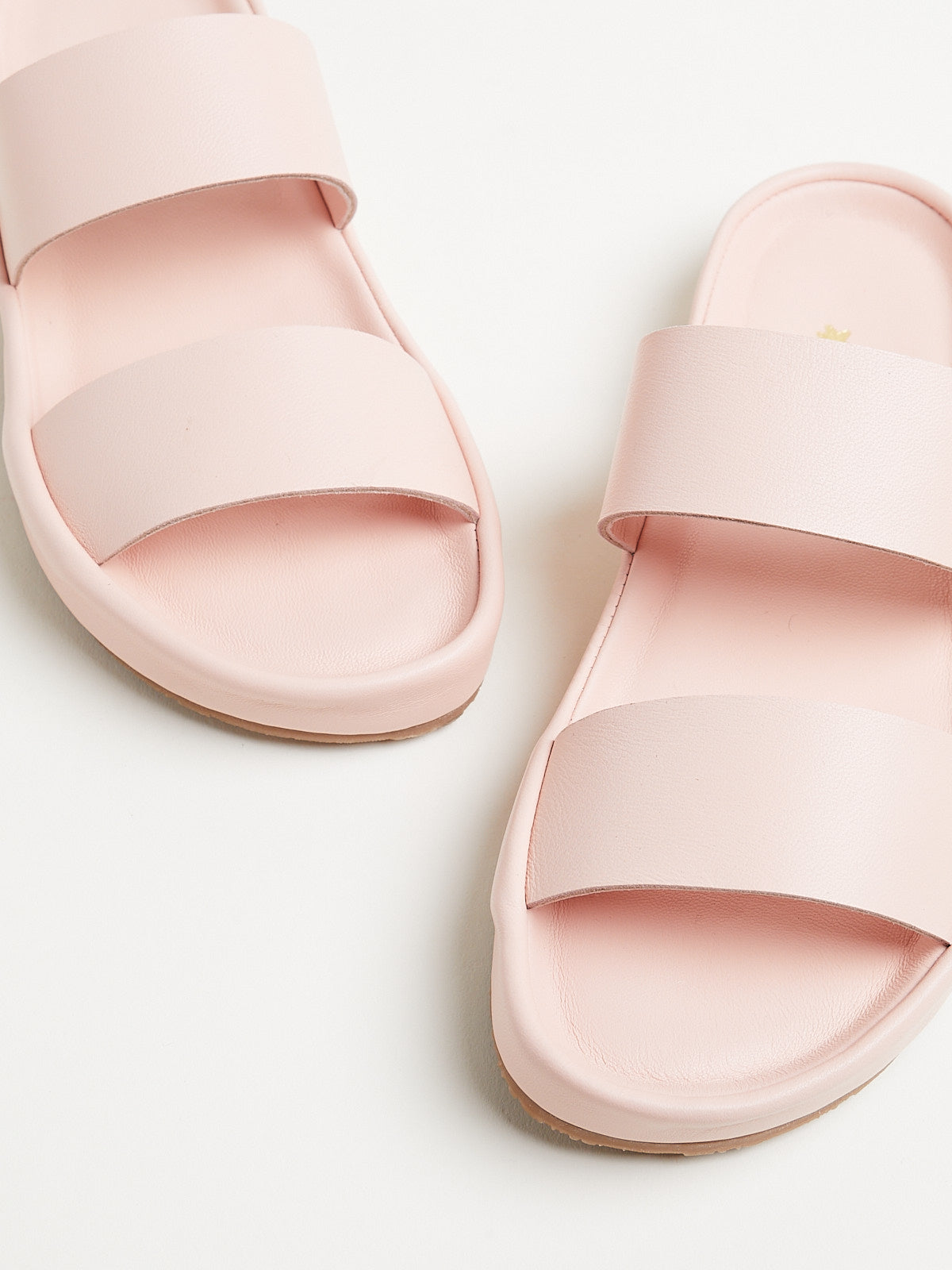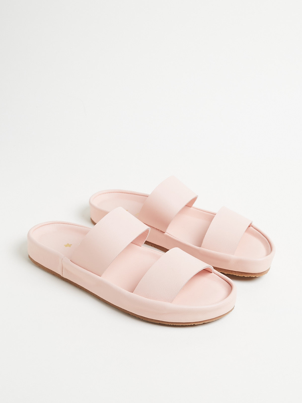 Two-strap sandal in nude pink leather. Matching nude leather-lined sculpted cork footbed and tread rubber outsole.