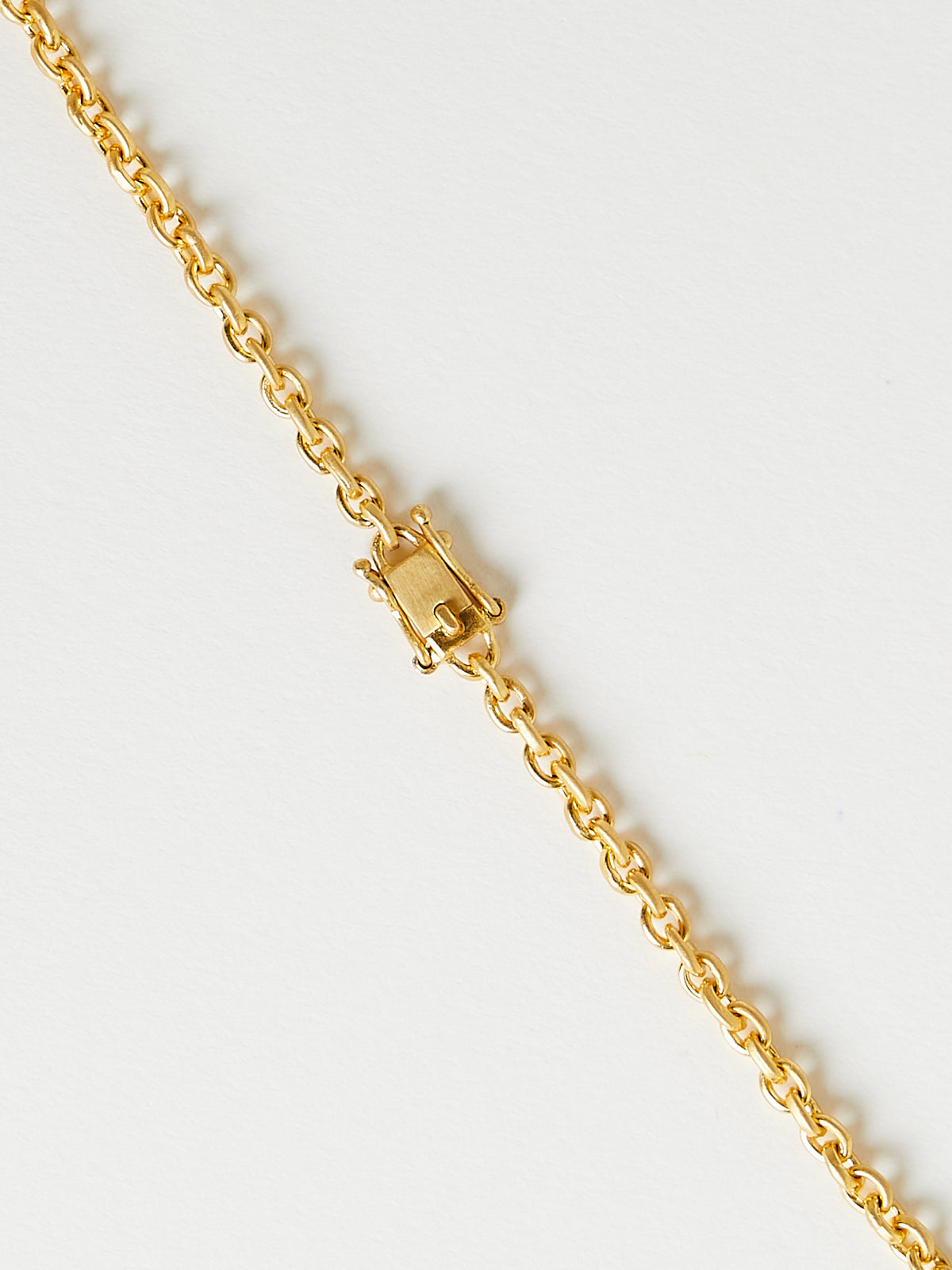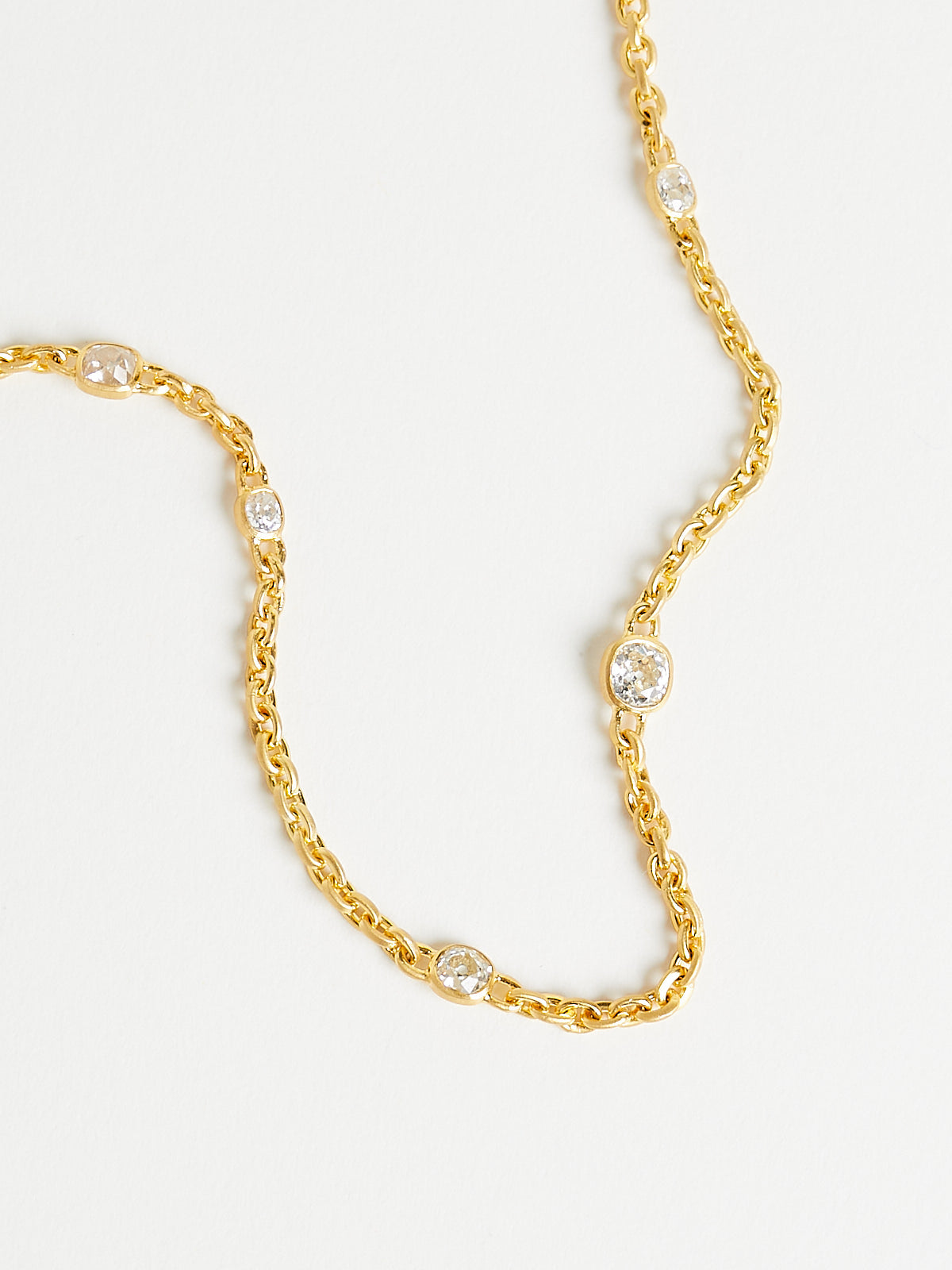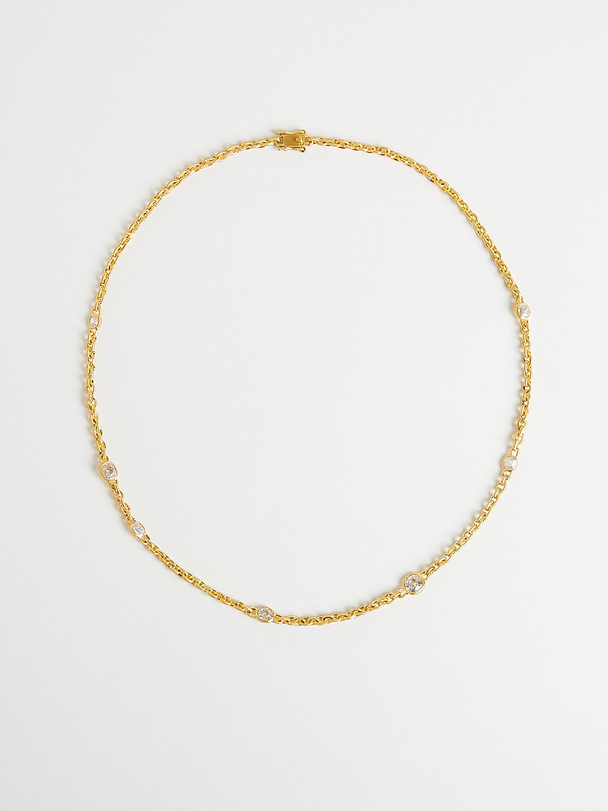 Handmade chain necklace in Fairmined 18k yellow gold with approx. 2.2ct bezel-set antique old mine-cut diamonds scattered on the chain. Features an open box clasp.