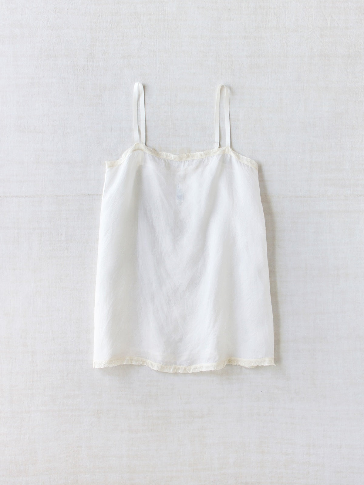 Tank top in lightweight white khadi silk. Square neckline and thin adjustable shoulder straps. Features a lace trim at the bust and bottom hem. Straight cut and relaxed fit.