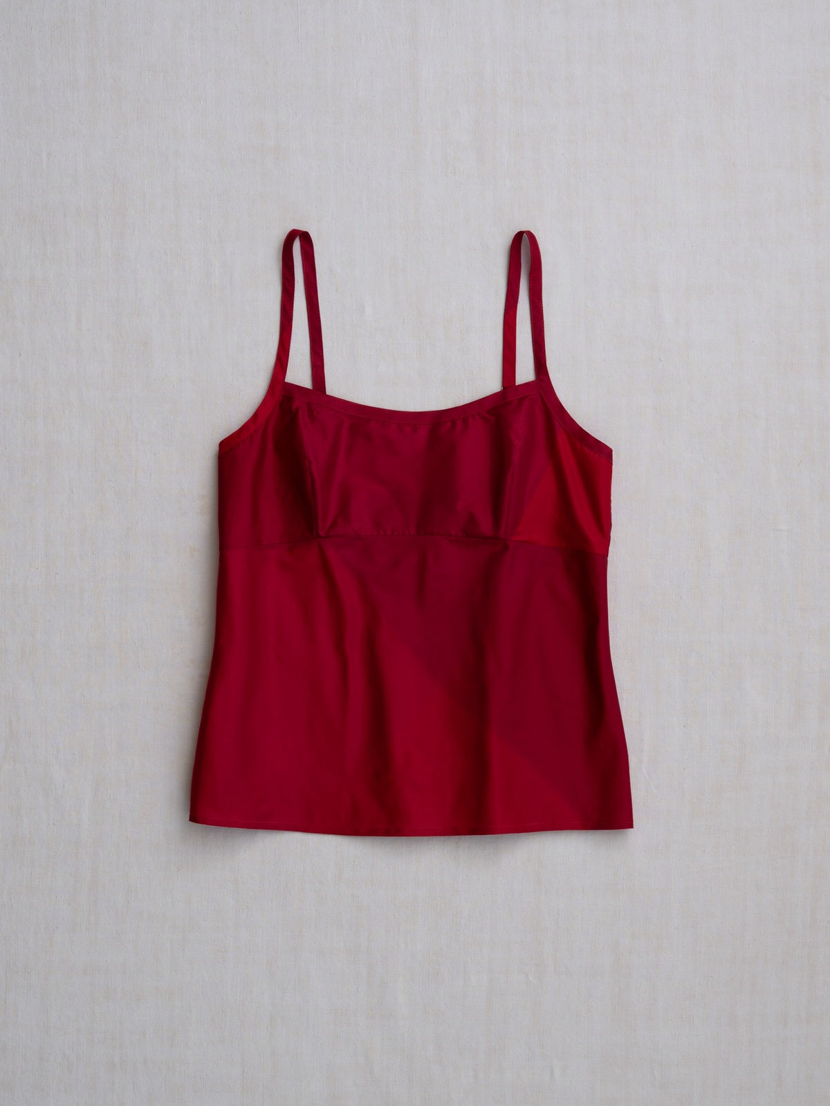 Camisole in iridescent habutai silk with a woven stripe design in 4 shades of red. Subtle v-neck and adjustable thin shoulder straps. Straight cut.