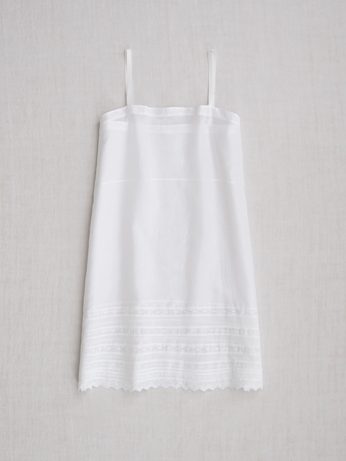 Relaxed slip in washed lightweight white cotton. Square neckline and thin adjustable shoulder straps. Features vintage lace details throughout and a scalloped trim at the bottom hem. Knee-length and straight cut.